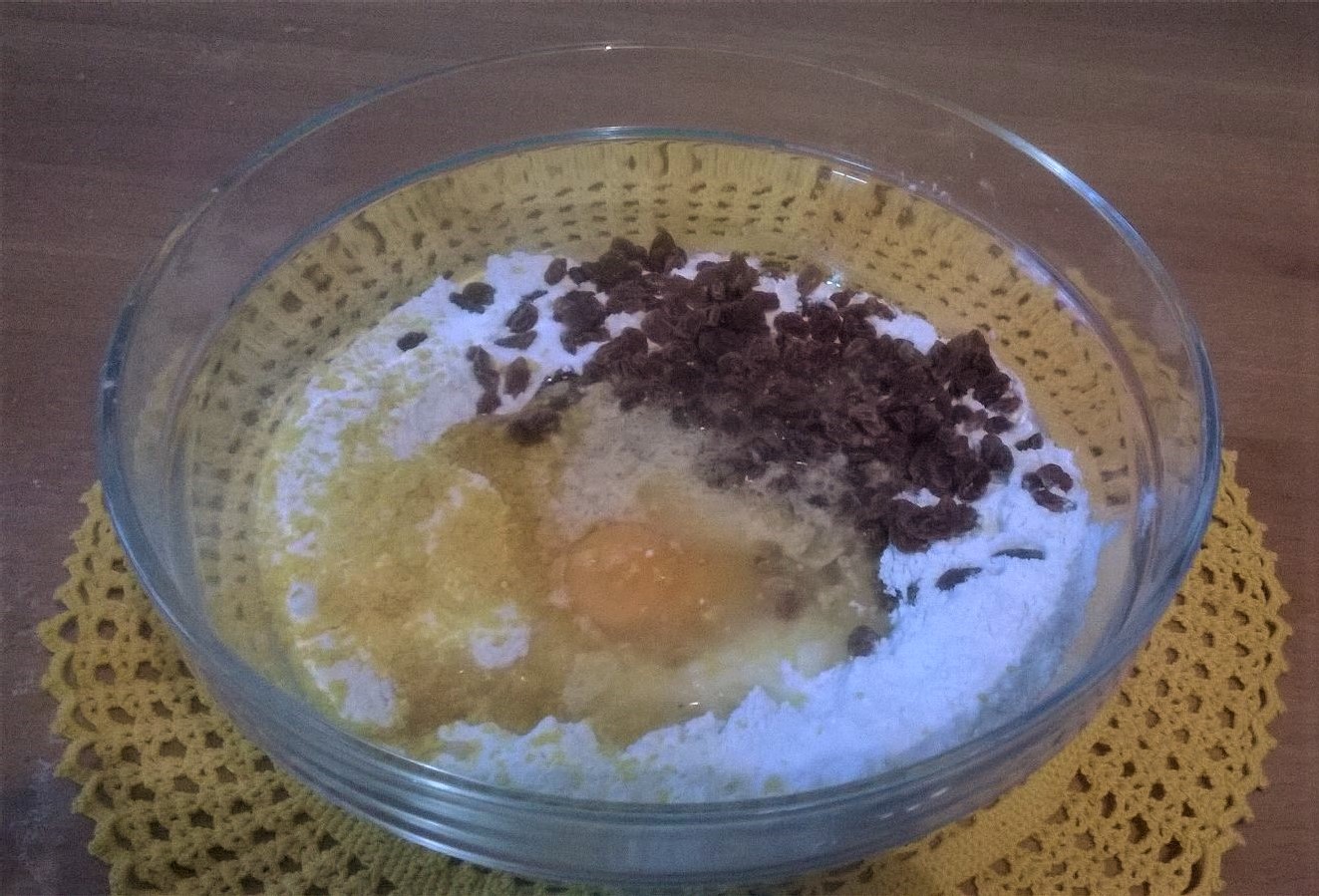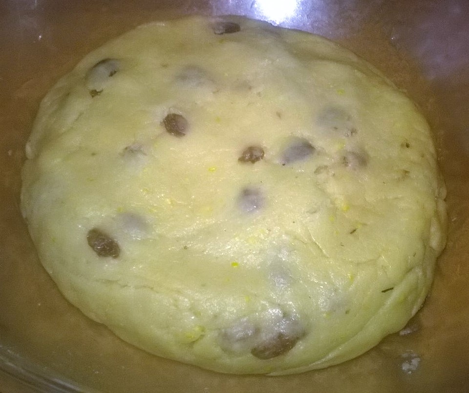In una ciotola mettete la farina al centro fate un incavo e aggiungete tutti gli ingredienti (l’uvetta ammollata precedentemente in acqua tiepida). mescolate-insiemeIniziate a impastare il tutto, trasferite quindi su un piano da lavoro e continuate a lavorare l’impasto per 4-5 minuti