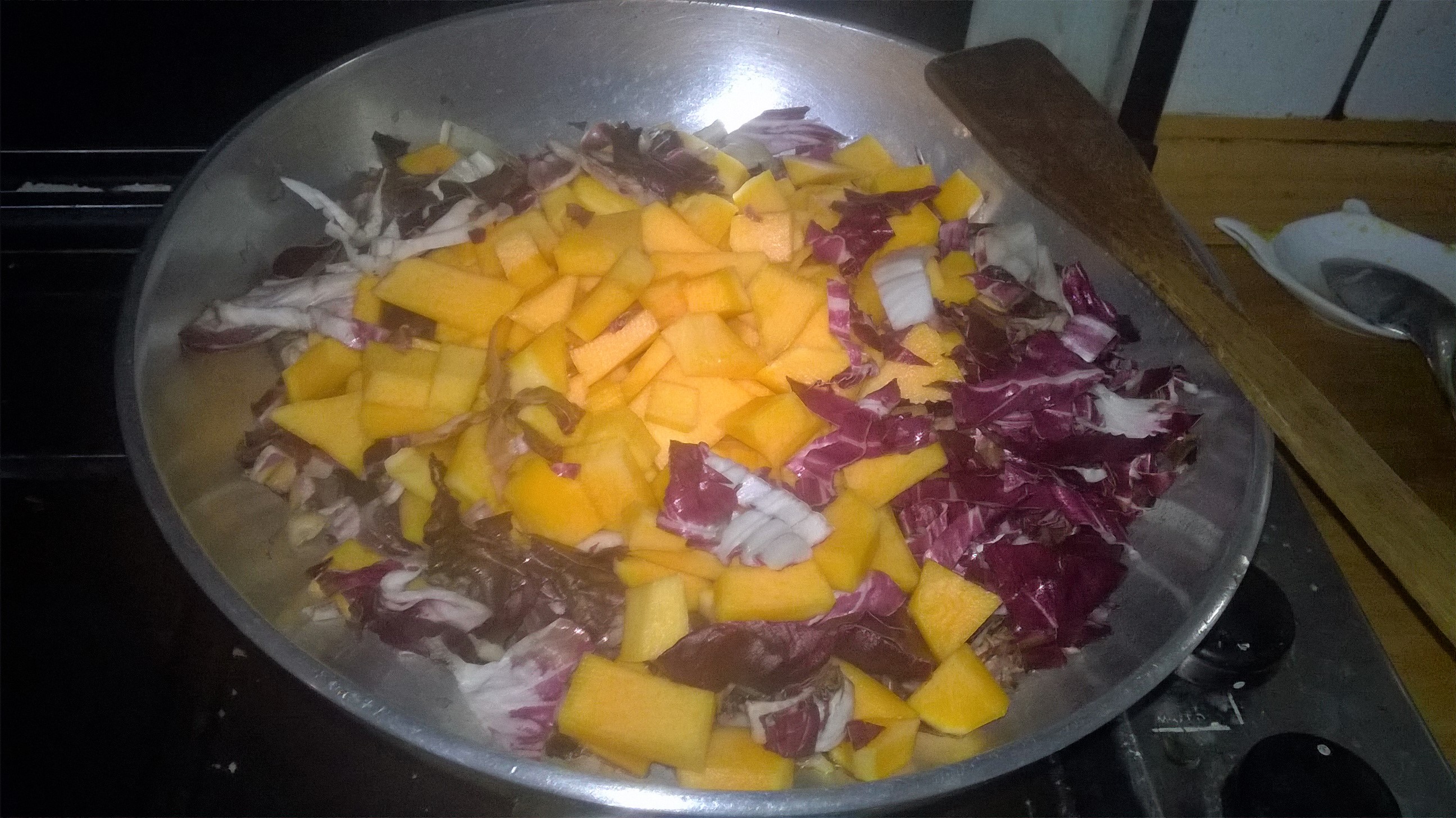 In una padella capiente fate rosolare la cipolla e l’aglio in un po d’olio. Aggiungete il radicchio tagliato a striscioline e la zucca a fettine sottili.