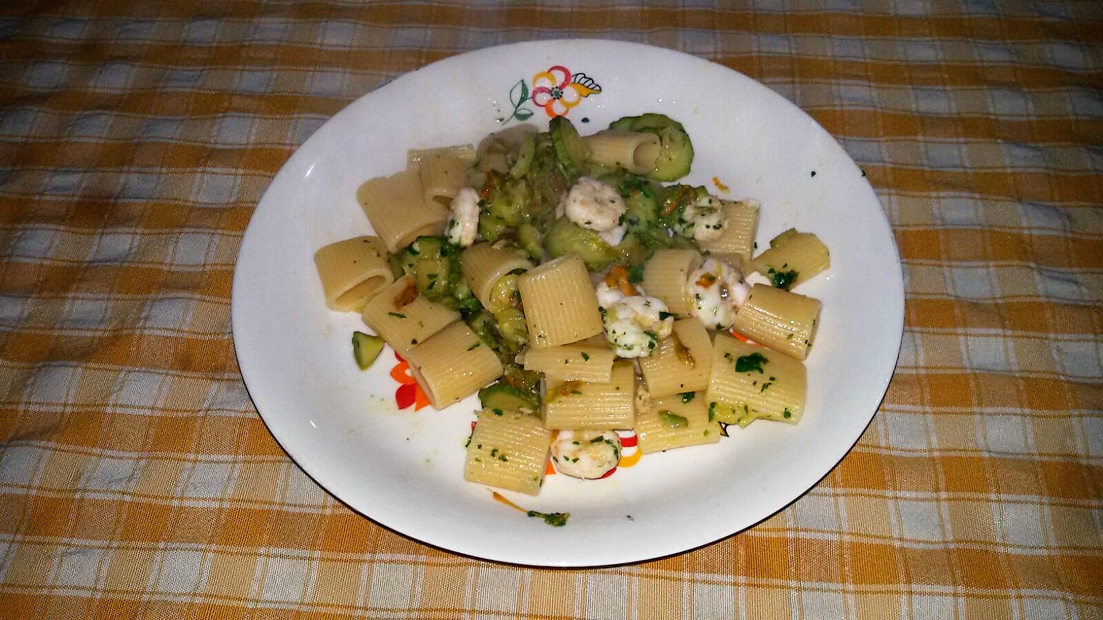 Cuocete le mezze maniche al dente e saltatele in padella con i gamberi e gli zucchini. Aggiungete un po di olio extravergine di oliva e buon appetito da Maria.