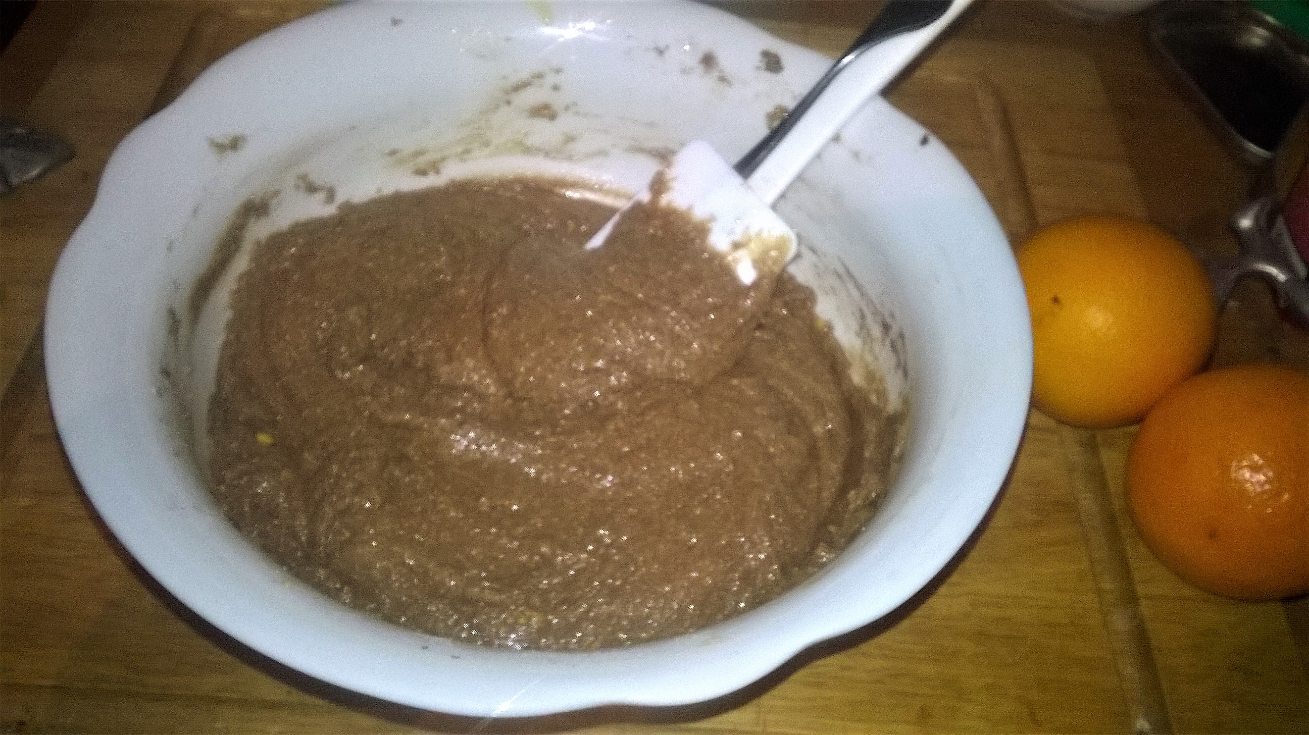 In una ciotola mettete l’uovo e l’olio e sbattete con una frusta elettrica, aggiungete lo zucchero a velo e continuate a sbattere fino ad ottenere un composto cremoso. Unite la farina, il cacao, il lievito e il bicarbonato, l’acqua, la buccia d’arancia e amalgamate il tutto con una spatola. Il composto deve risultare morbido ma non liquido.