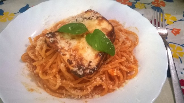 Spaghetti con pomodoro e ricotta fritta