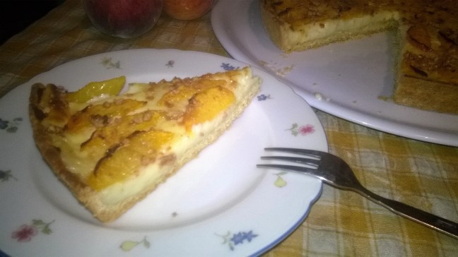 La crostata con crema e pesche è il  classico dolce con frutta di stagione che piace sempre a tutti!!! Questa in più ha l’abbinamento alla genovese degli amaretti. La fragranza delle pesche e l’amarognolo degli amaretti abbinati alla dolcezza della crema pasticcera ne fanno un must imperdibile. Ottima per le colazioni ma anche e soprattutto quando si ha voglia di qualcosa di dolce e di molto genuino.