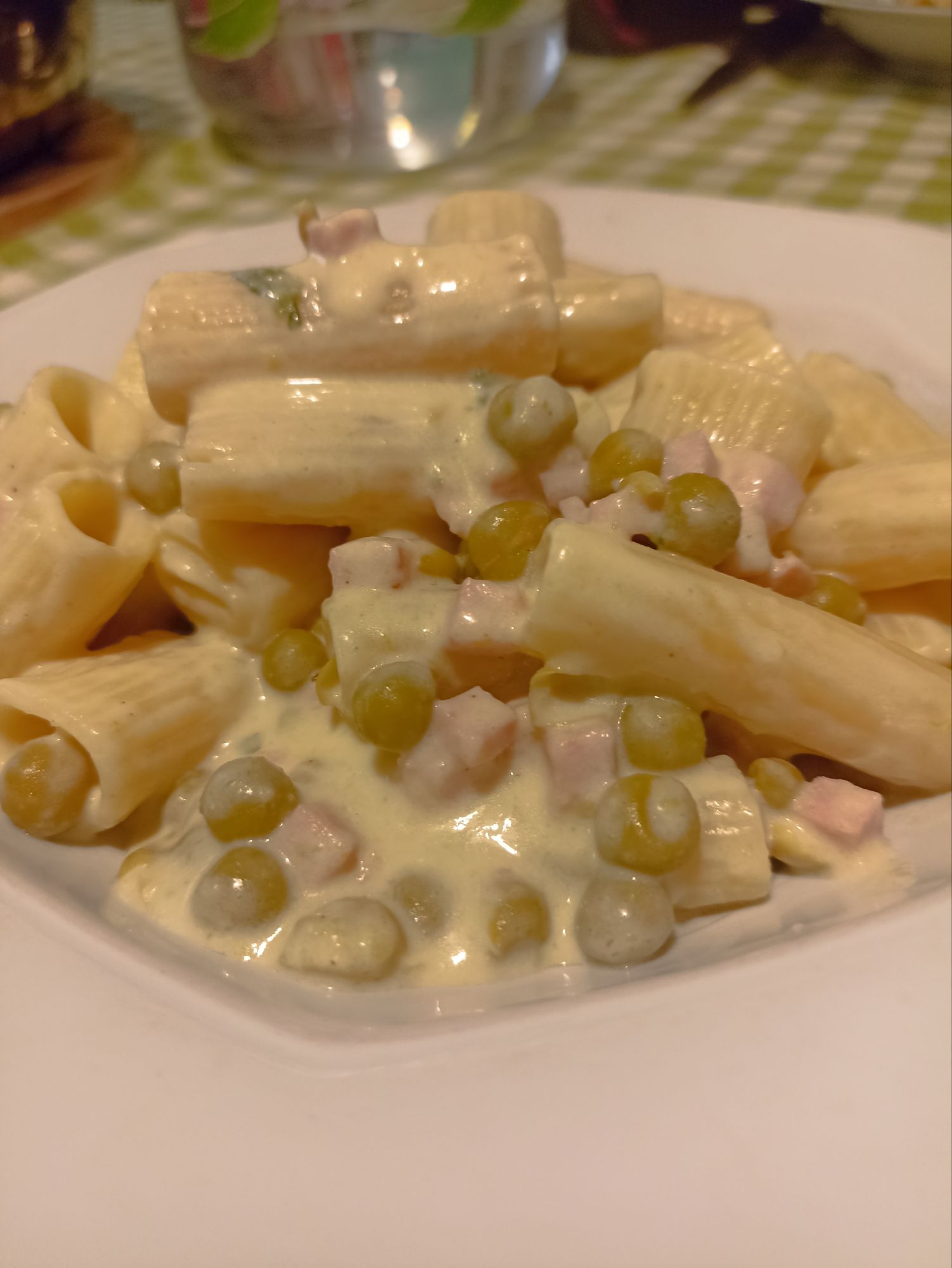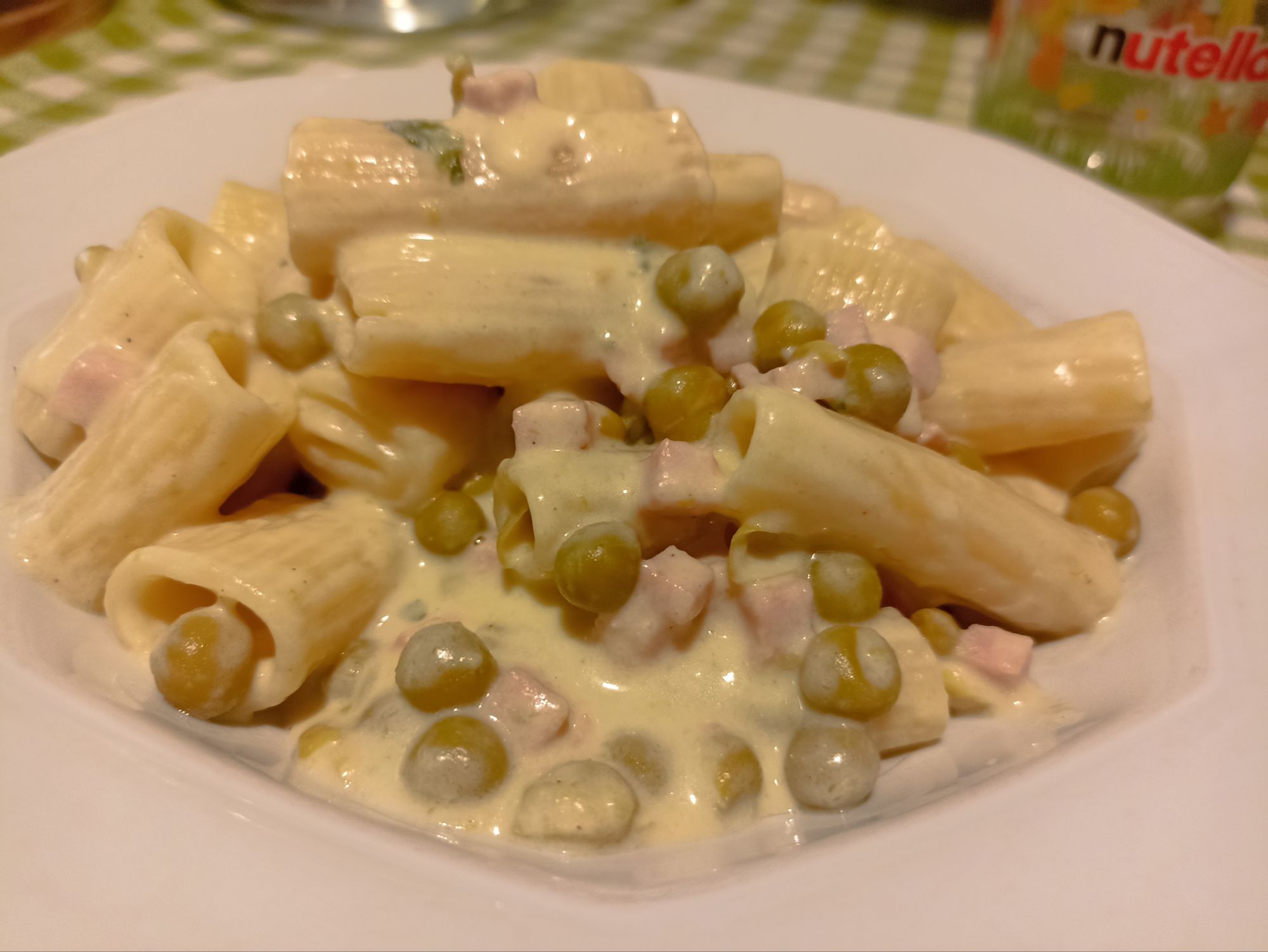Appena l’acqua bolle cuocete la pasta al dente, scolatela lasciando un poco di acqua di cottura (la paste “Europa” non deve risultare troppo asciutta) e unitela con il condimento di piselli, prosciutto e panna aggiungendo la mozzarella a dadini e parmigiano grattugiato.
