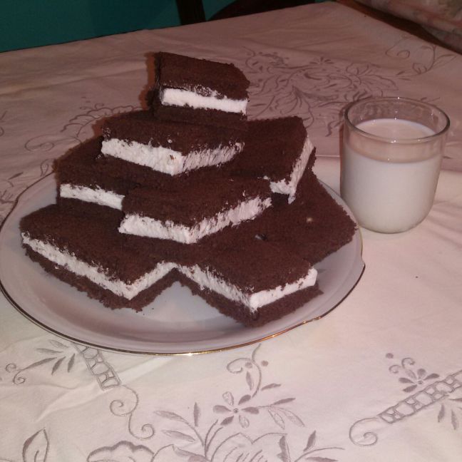 Tagliate verticalmente in due metà la pasta biscotto, farcite con la crema al latte e coprite con la seconda parte di pasta biscotto.
