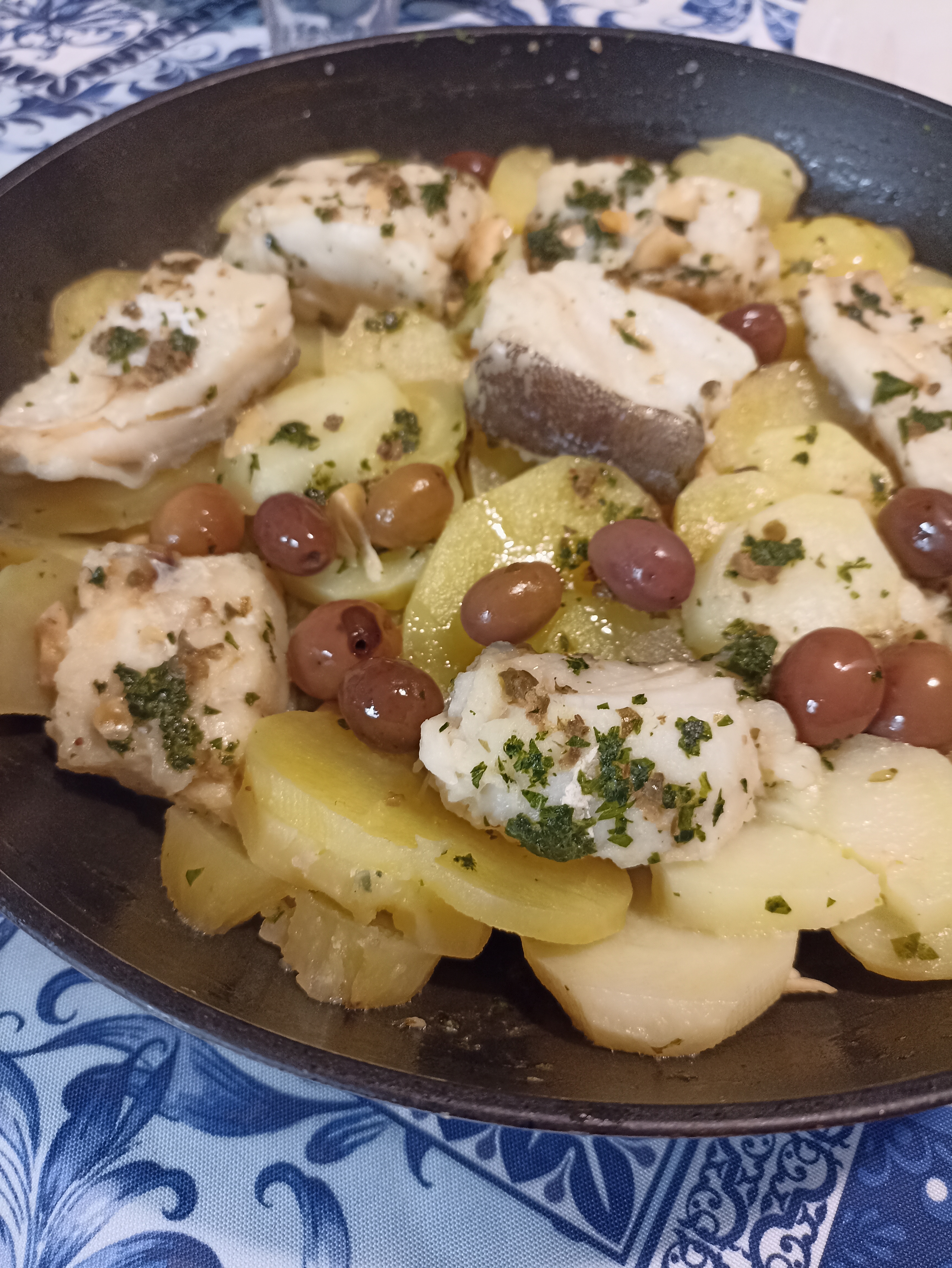 In una padella capiente mettete in un poco di olio un trito di aglio, acciughe, capperi e prezzemolo, aggiungete dopo un minuto le patate, il baccalà, le olive e i pinoli. Sfumate con il vino bianco, salate e coprite.
