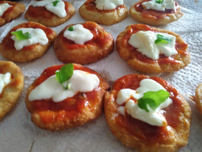 In una padella fate scaldare l’olio per friggere, prendete le palline, una alla volta e allargatele con le mani formando le pizzette che andrete a friggere.
