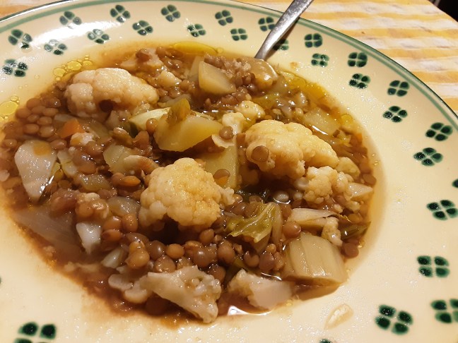 Oggi ho preparato questa zuppa di lenticchie e cavolfiore, la faceva mia nonna. Ai suoi tempi le minestre contadine di legumi e verdure erano frequenti, i classici piatti unici dove la carne era sostituita dai legumi, appunto. Le zuppe sono buone, sane e genuine...lenticchie e cavolfiore sono un buon abbinamento per promuovere la ricetta in … Continua a leggere Zuppa di lenticchie e cavolfiore.