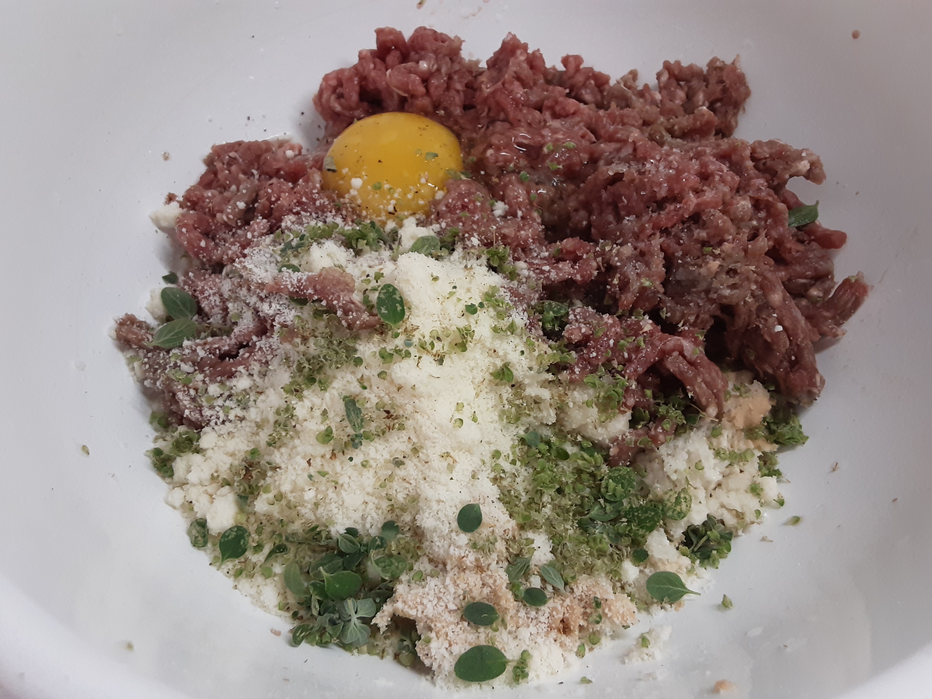Nel frattempo in una ciotola mettete la carne macinata, il pane strizzato e sbriciolato (che avrete precedentemente messo ad ammorbidire in un po’ d’acqua), l’uovo, il Parmigiano grattugiato, la maggiorana o il prezzemolo tritati e un pizzico di sale.