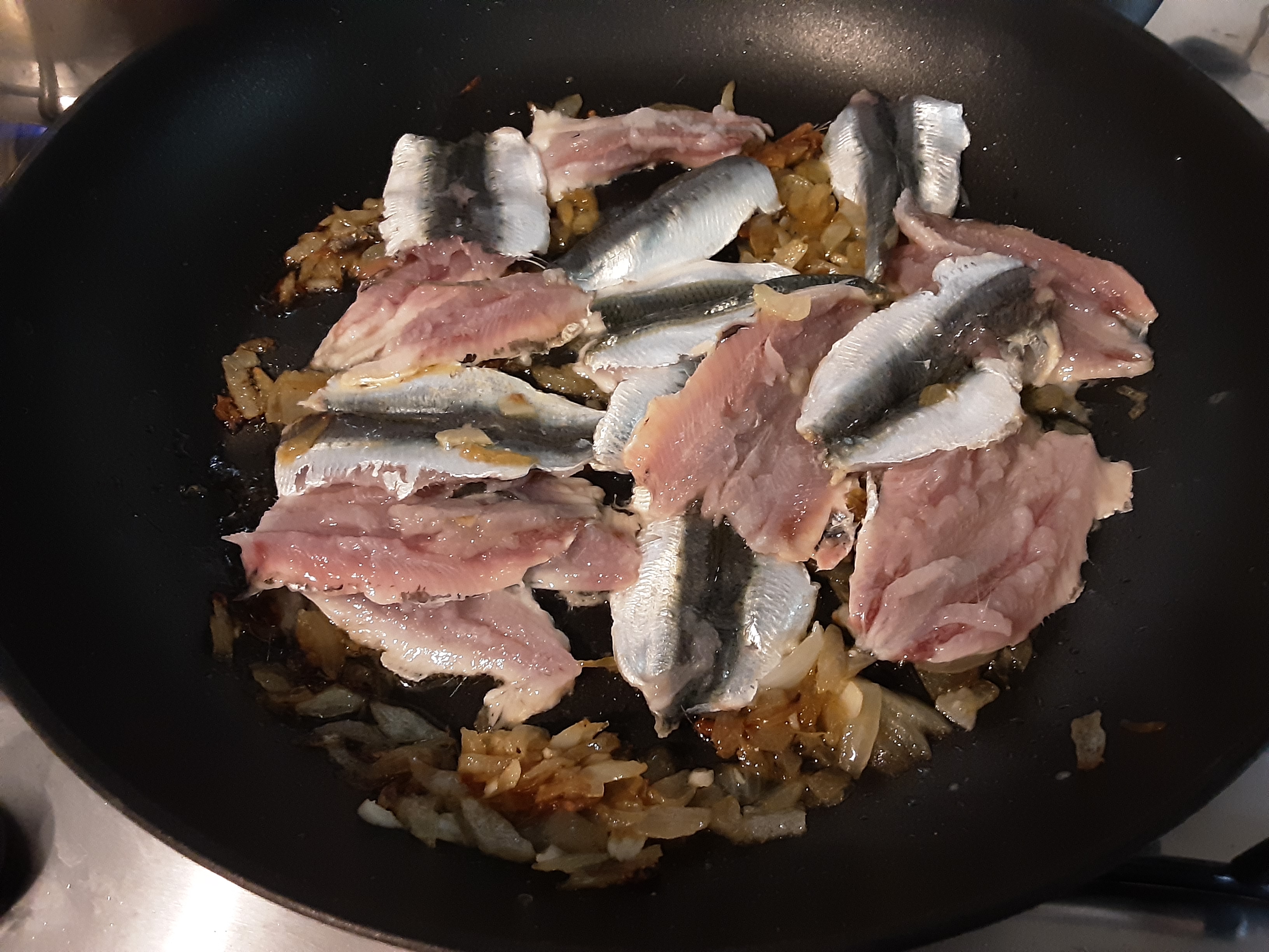 In una padella fate rosolare in un poco d’olio la cipolla tritata finemente, unite poi l’aglio sminuzzato e dopo 1 minuti le alici sott’olio, fatele sciogliere e aggiungete quindi le sarde.