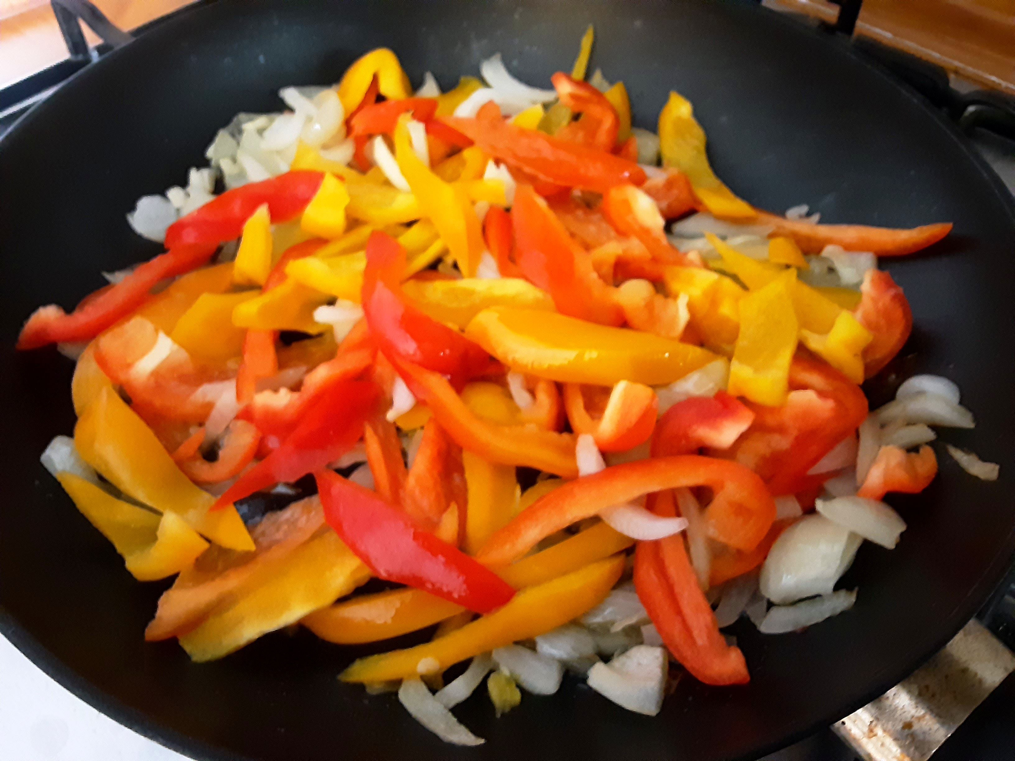 In una padella fate rosolare in un poco d’olio la cipolla affettata sottilmente, unite i peperoni salate coprite e lasciate stufare.