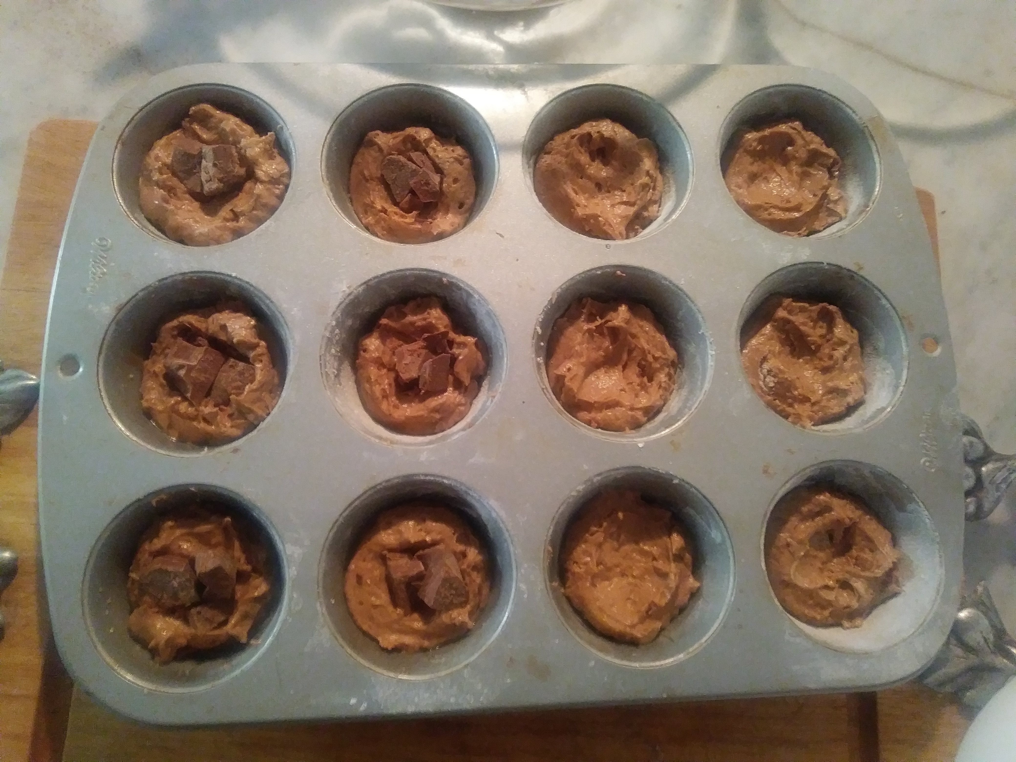 Distribuite metà del composto negli stampini da muffin imburrati e infarinati e con il dorso di un cucchiaio create un incavo al centro del quale andate a mettere un pezzo di cioccolato, quindi coprite con il resto del composto.
