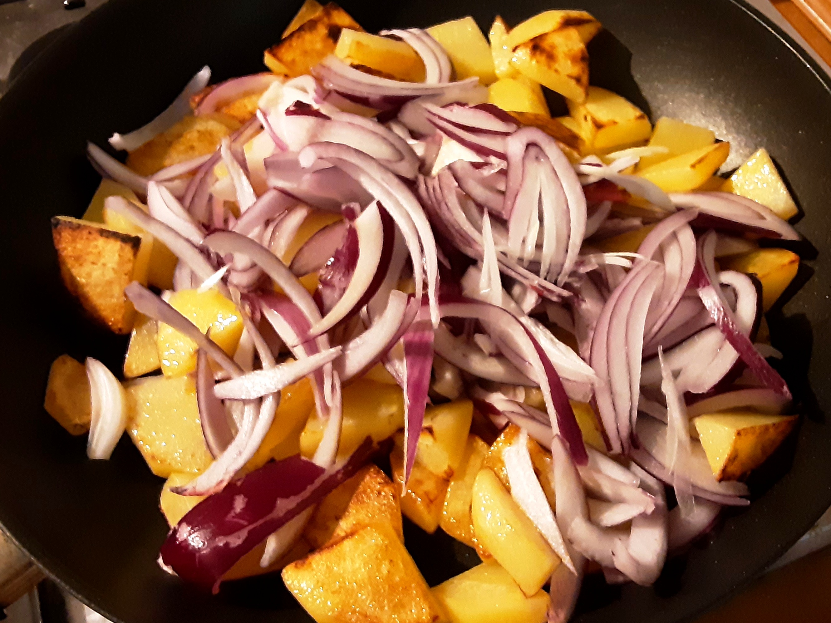 Fate rosolare le patate in una padella con un poco d’olio, per una decina di minuti, ogni tanto mescolate le patate.