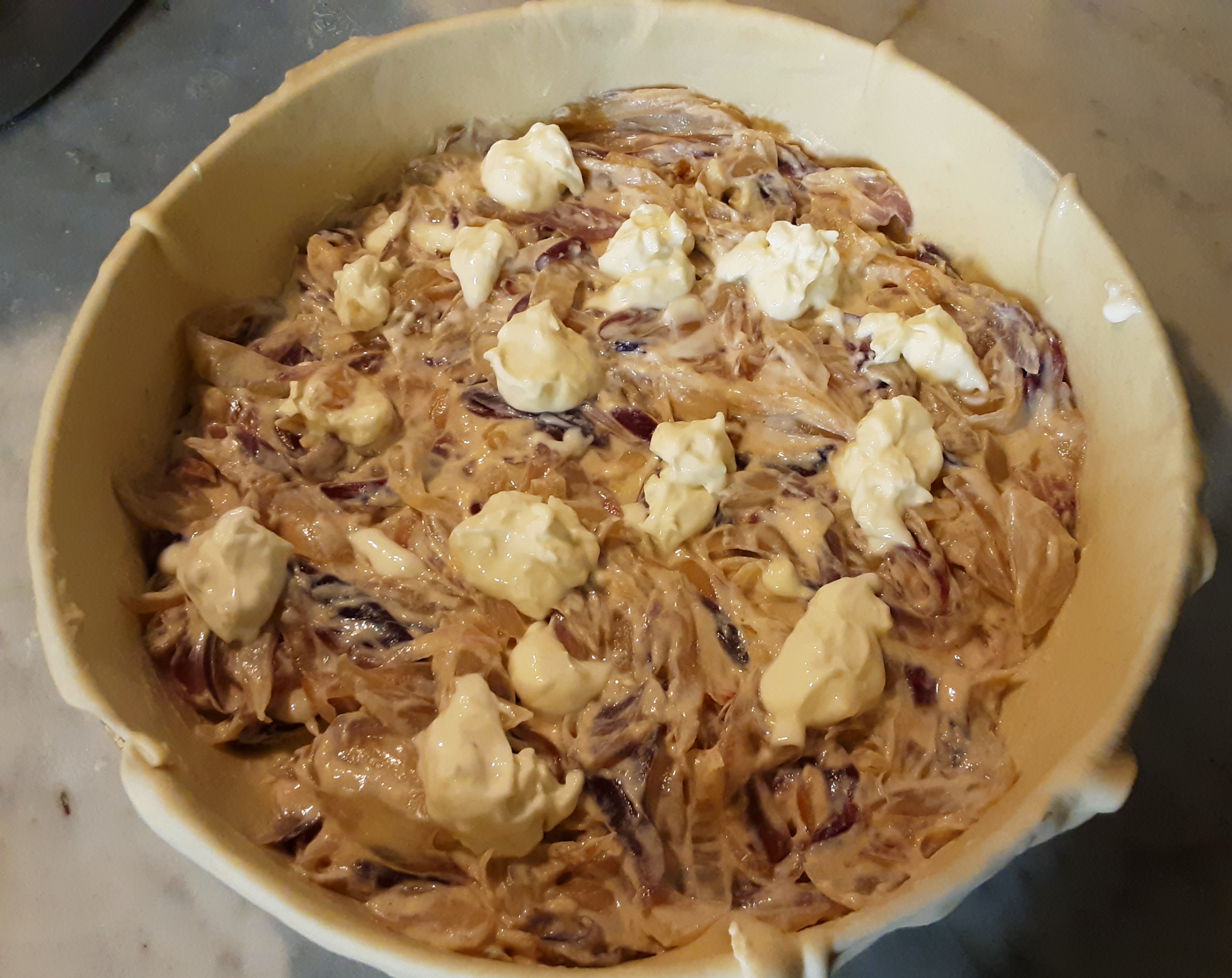 Coprite con fiocchetti di stracchino e mettete sopra le cipolle rimaste.