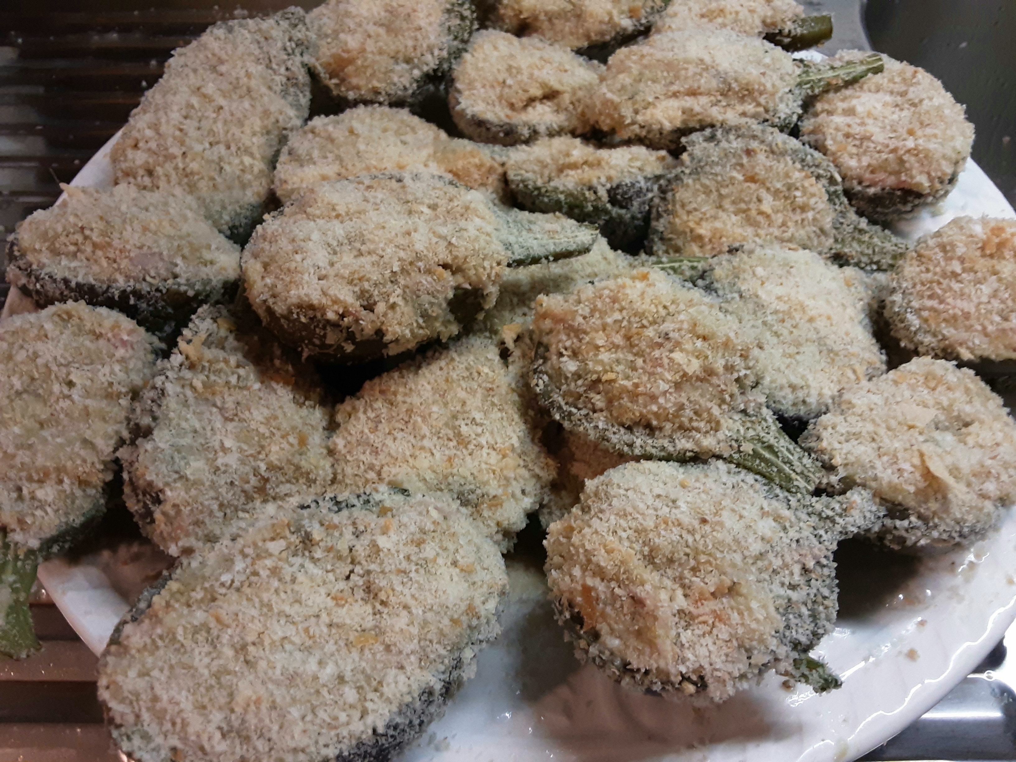 Riempite le melanzanine e passatele nel pangrattato solamente dalla parte dove c’è ripieno.