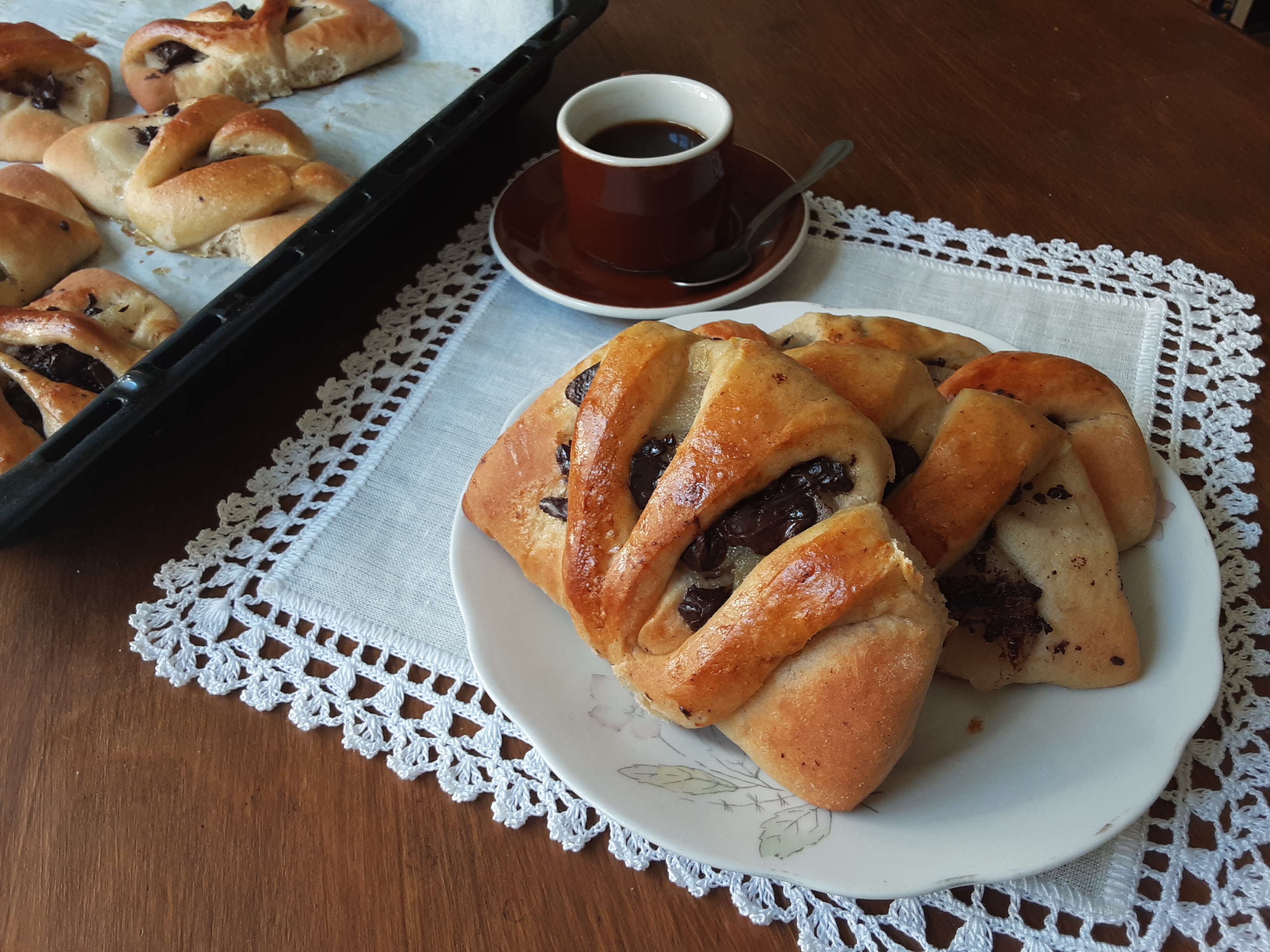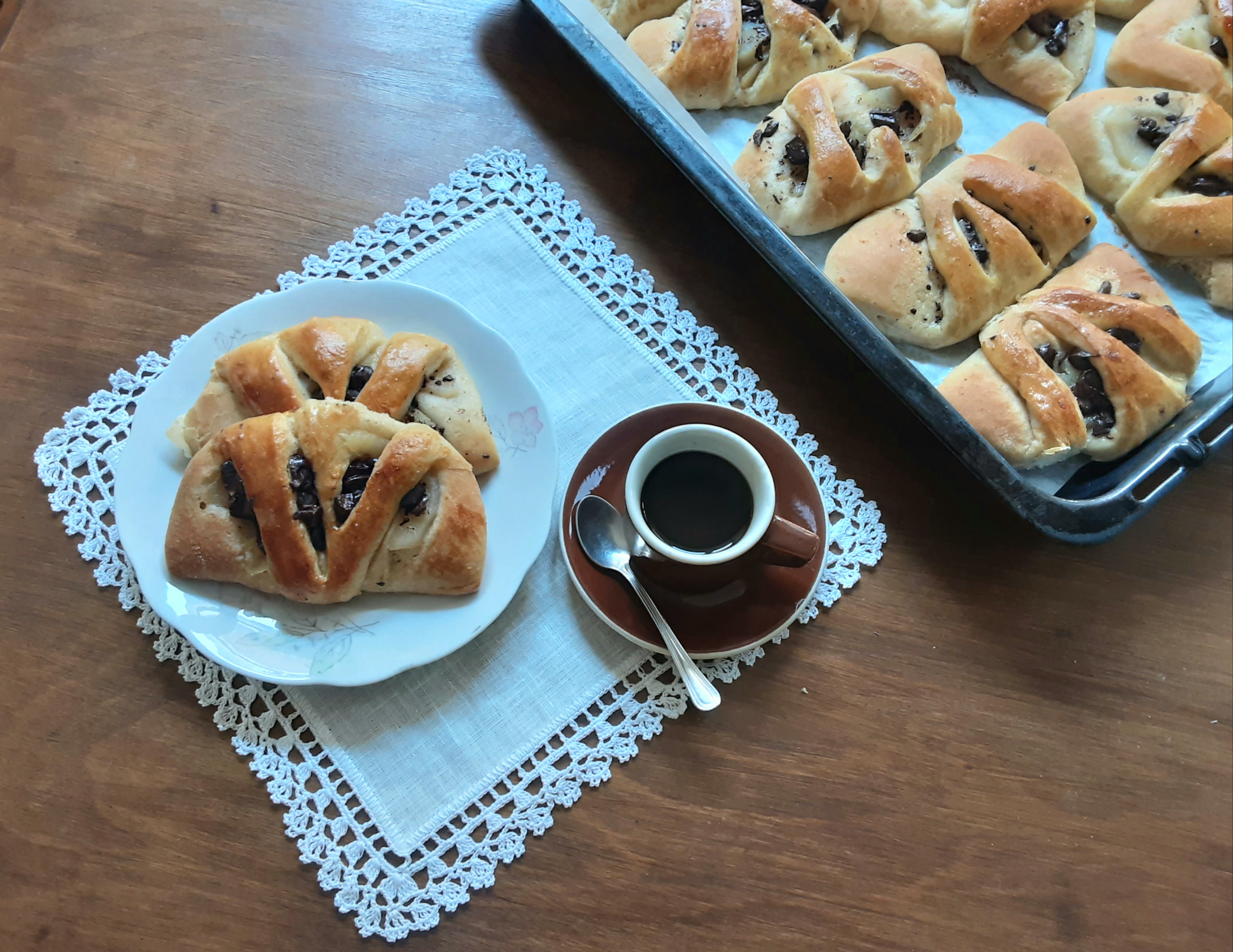 Adagiate i fagottini su un teglia rivestita da carta da forno e lasciateli lievitare per un’ora, spennellateli poi, delicatamente con un po’ d’uovo sbattuto e infornate in forno preriscaldato, modalità statico, a 180° per 20 minuti circa.