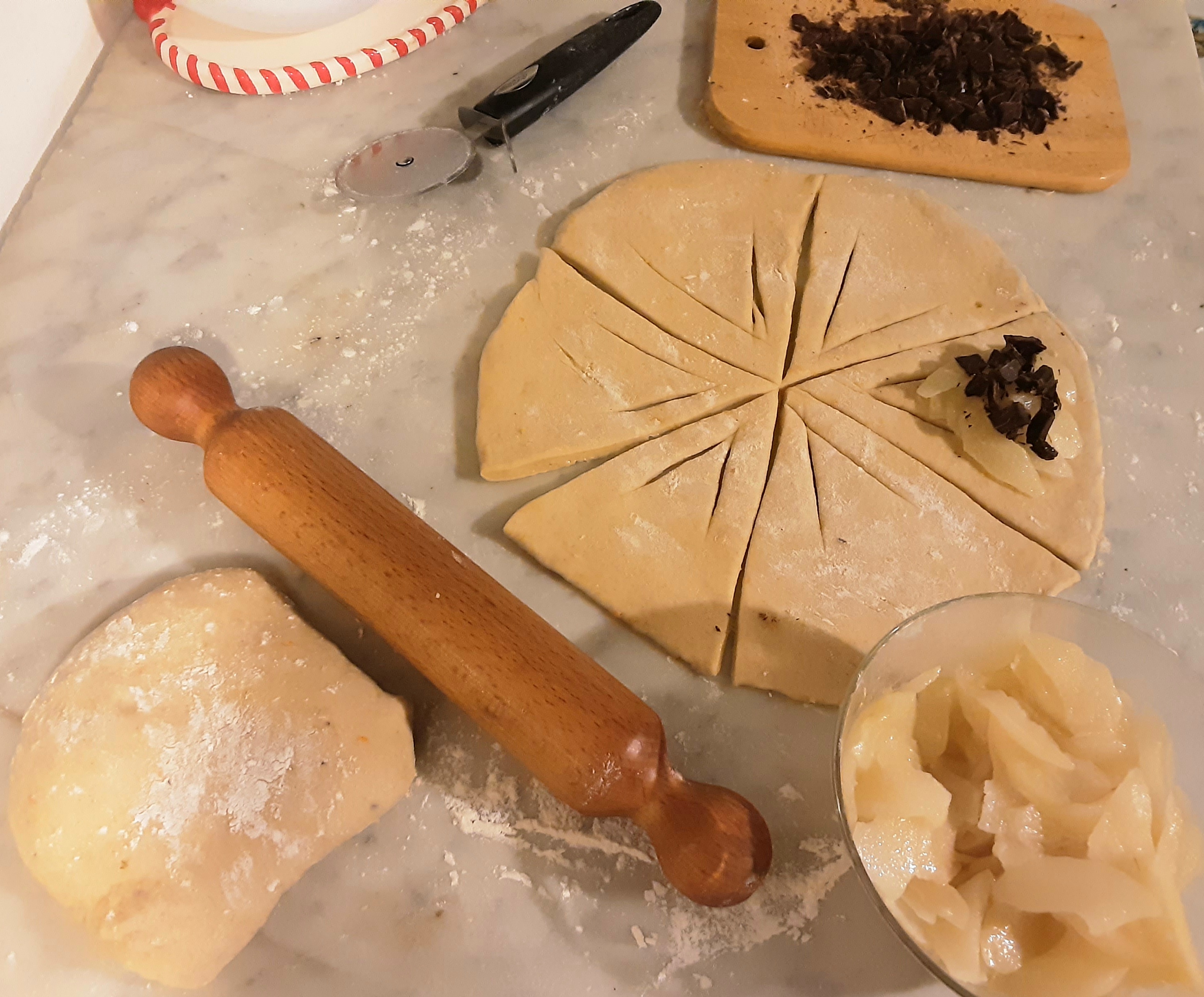 Quando l’impasto è ben lievitato dividetelo e con il mattarello stendete una parte formando un cerchio dello spessore di 4 mm e tagliatelo in 6 triangoli. Su ciascun triangolo praticate due tagli, nella parte alta verso la punta (vedi foto).