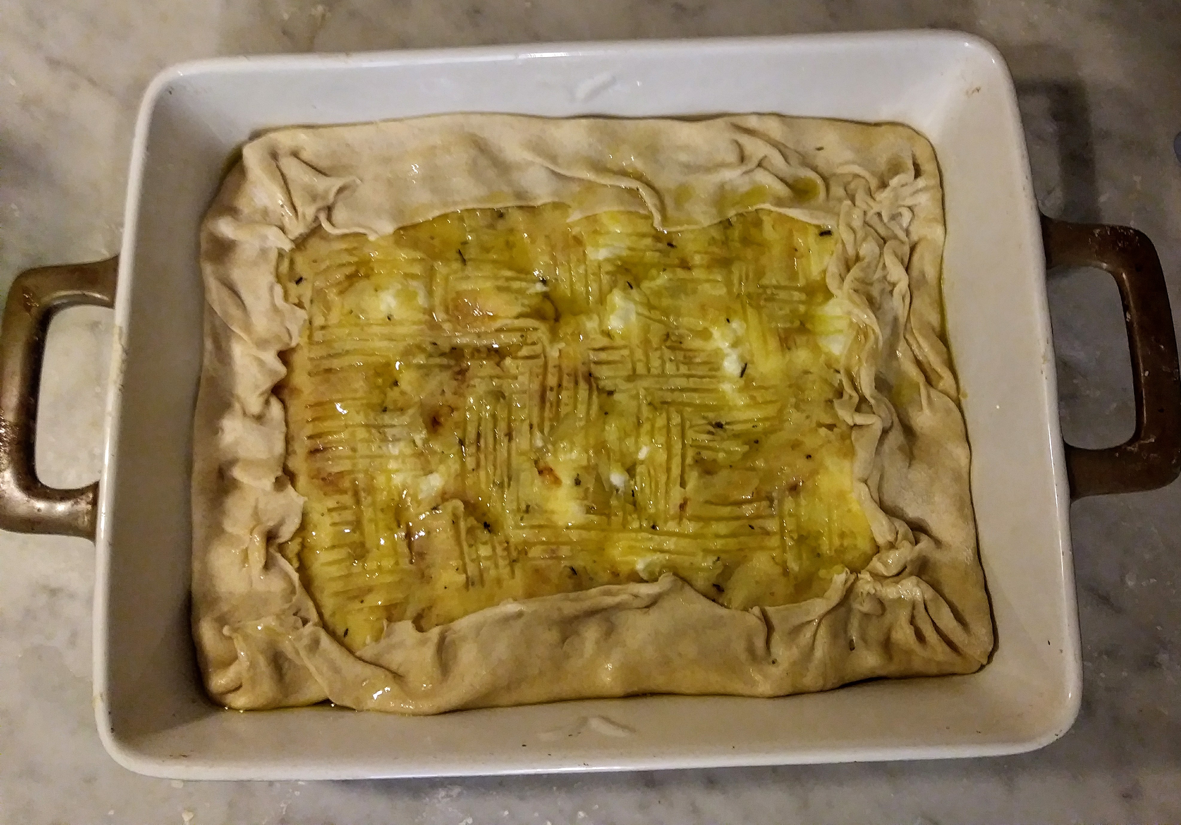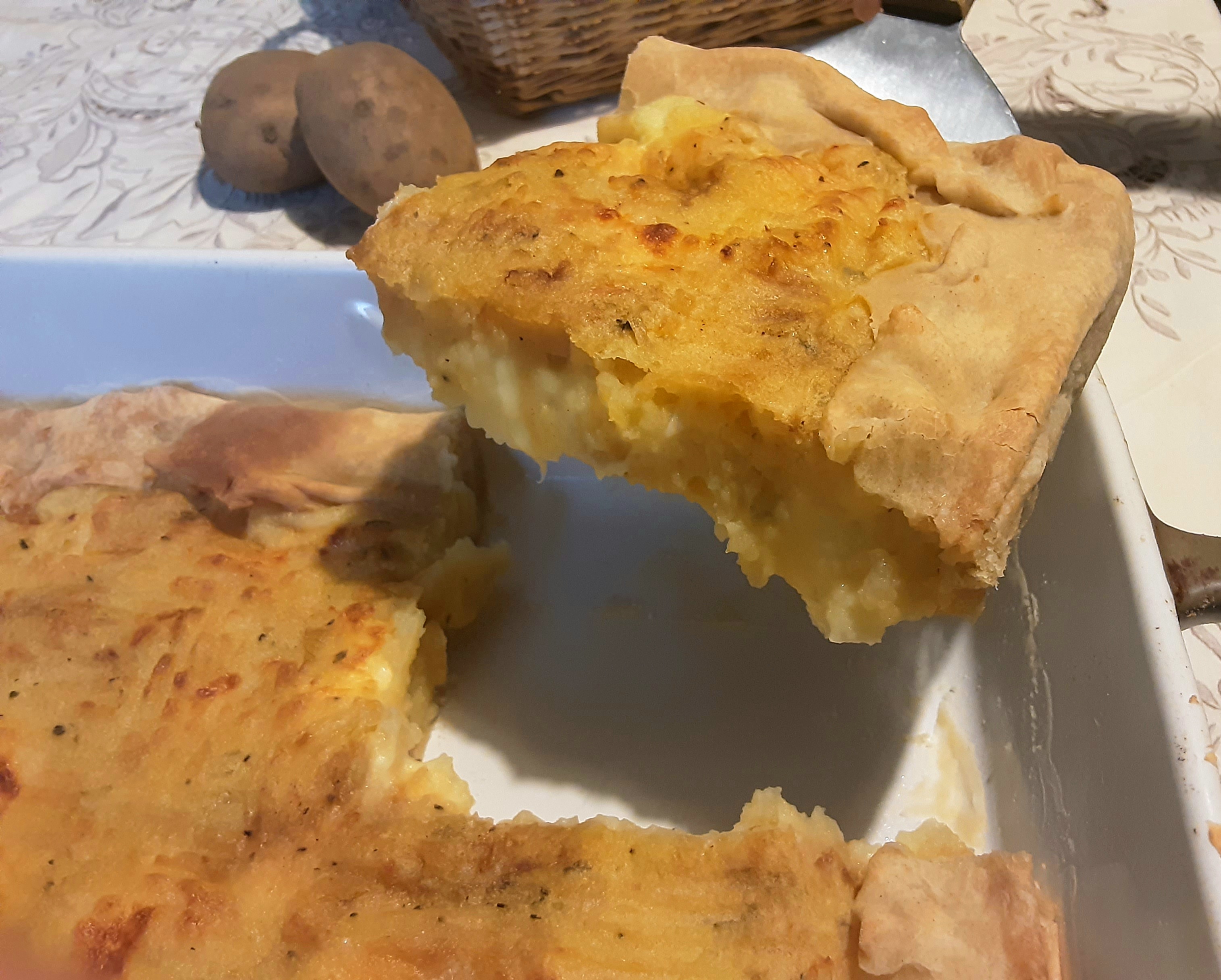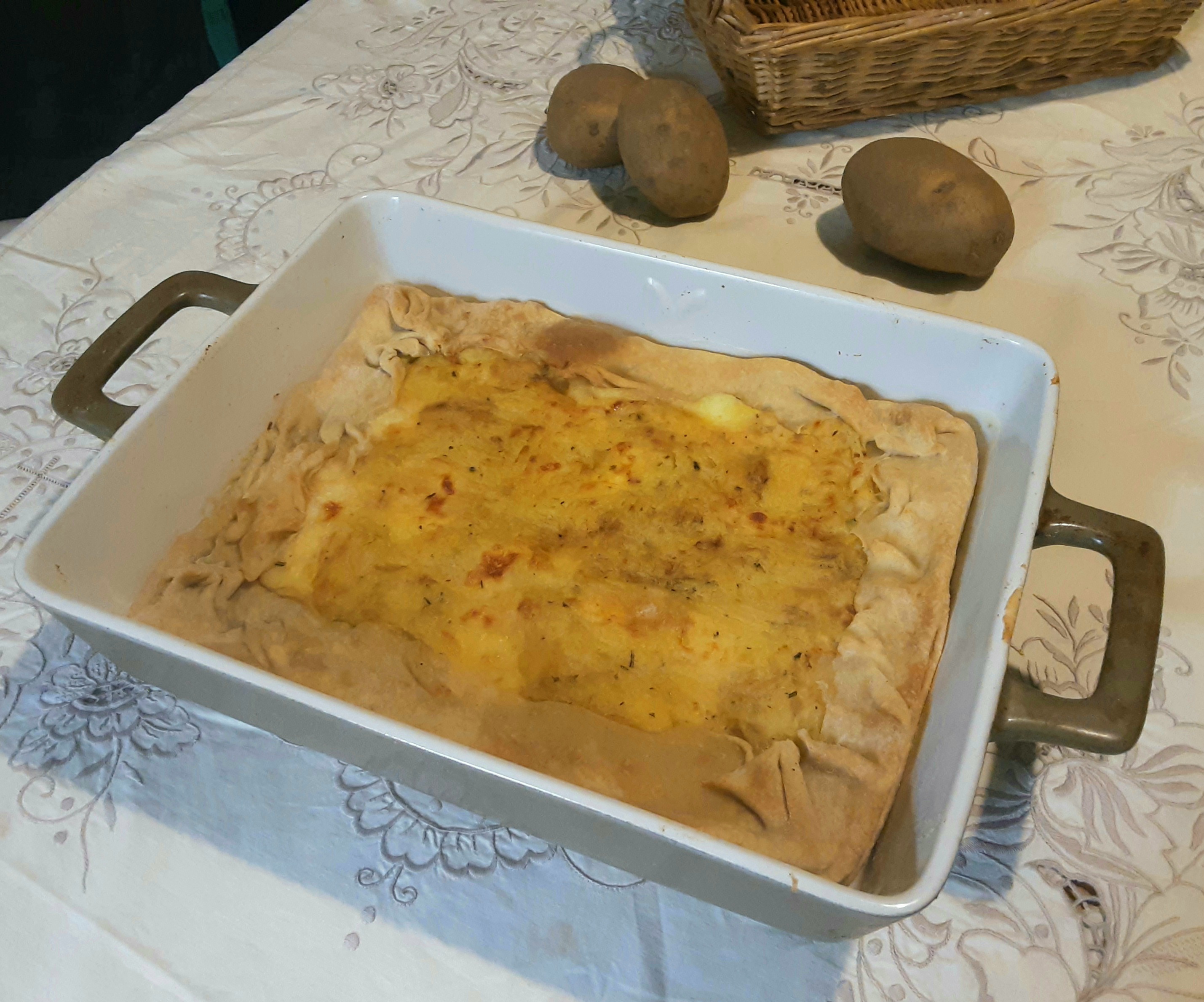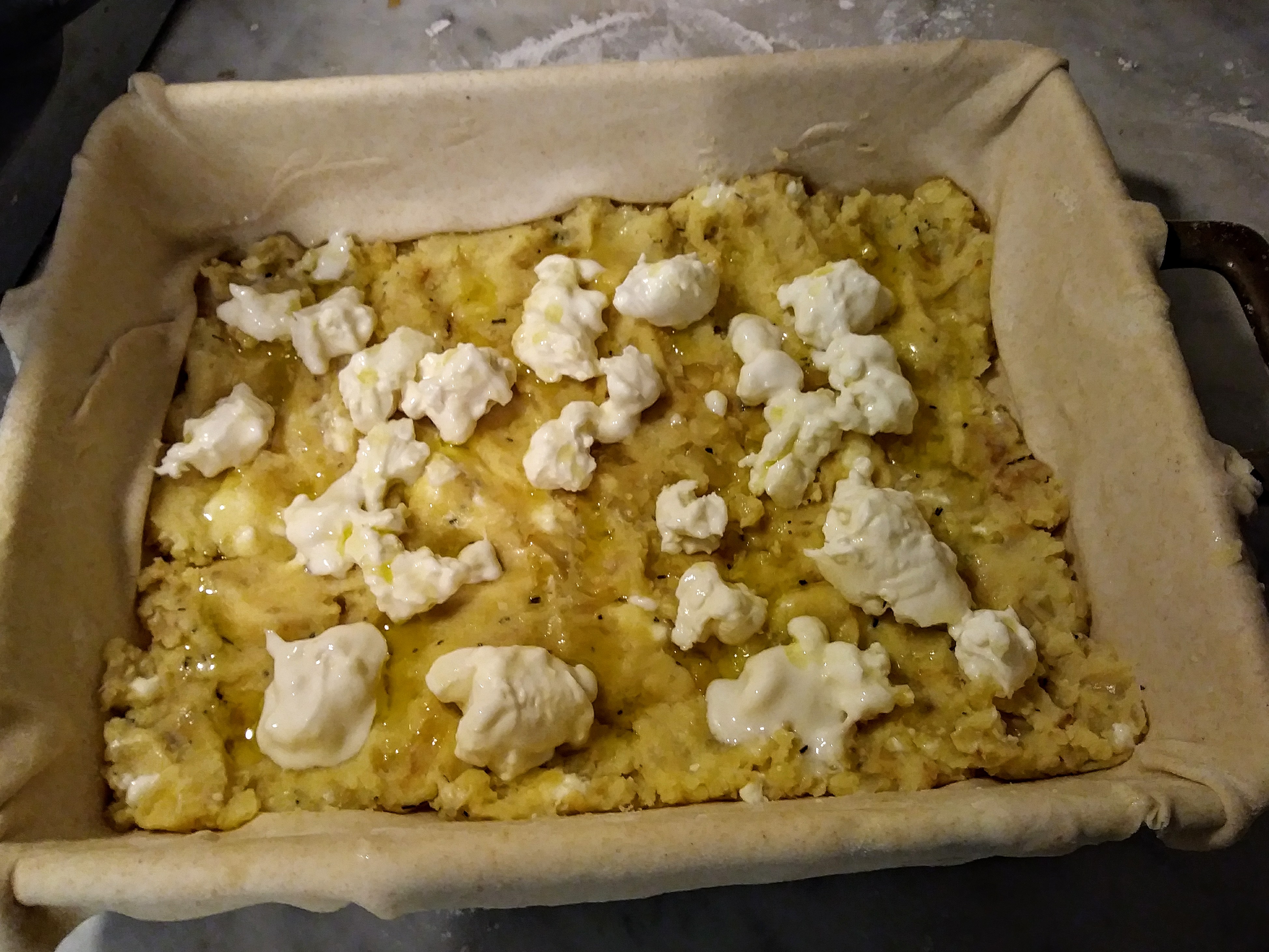 Stendete con il mattarello, su un piano da lavoro infarinato, la sfoglia formando un rettangolo e rivestite una teglia oleata, versate metà delle patate e distribuite fiocchetti di stracchino rimasti.
