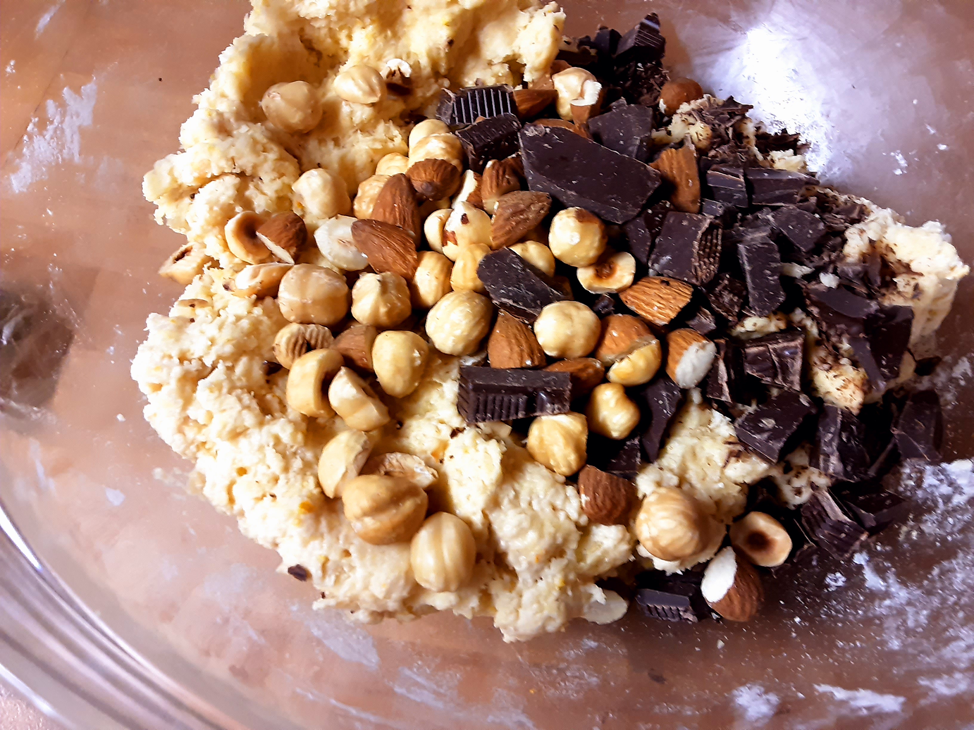 Incorporate tutta la farina fino ad ottenere un impasto morbido, aggiungete quindi il cioccolato tagliato a scaglie o le gocce di cioccolato, le nocciole (lasciatene alcune per decorare il pandolce) impastate il tutto con le mani e in pochi minuti l’impasto è pronto (morbido e leggermente appiccicoso)