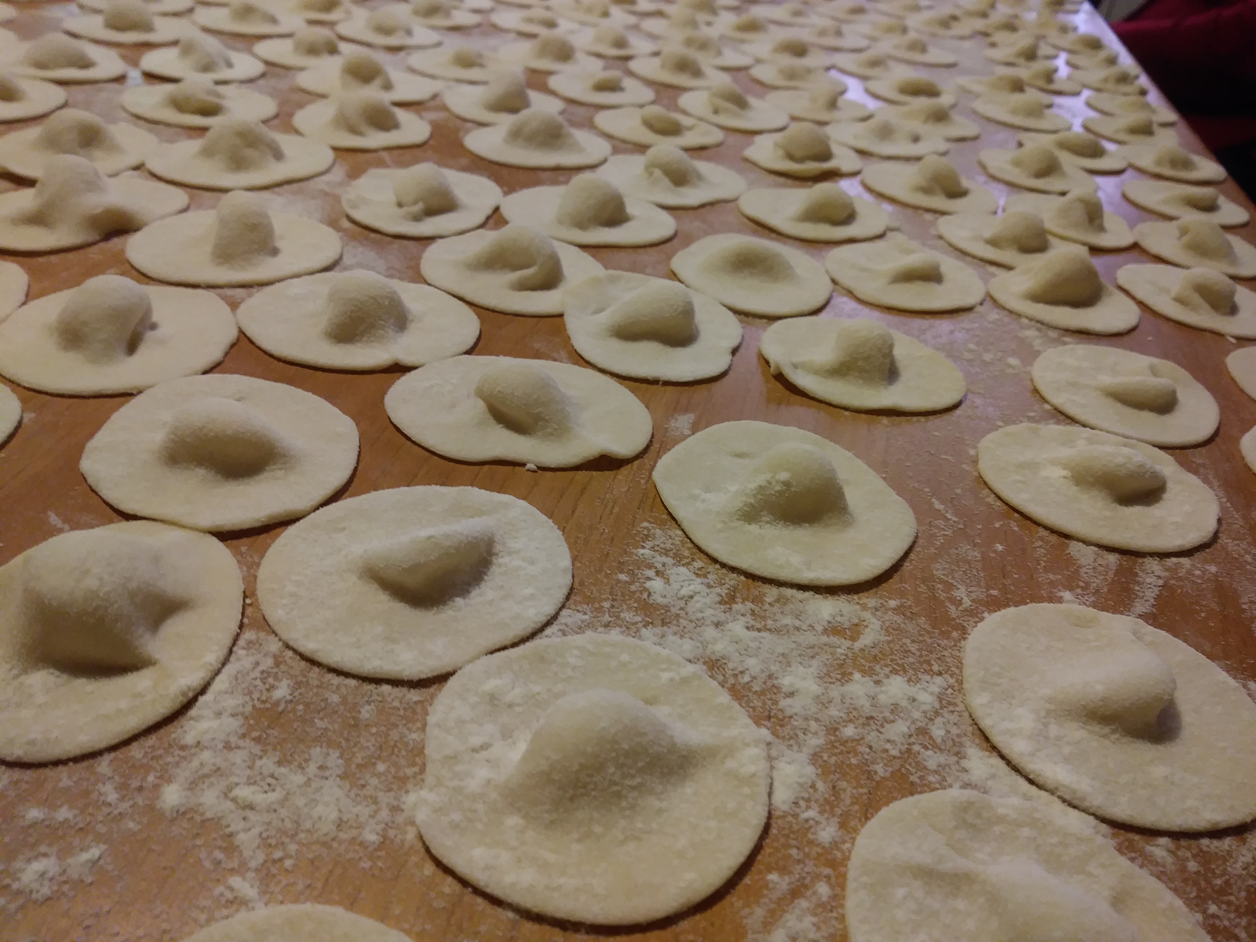Con un coppapasta di 5 cm di diametro o con una tazzina da caffè, ritagliate tanti cerchietti, premete al centro ciascun cerchietto con il pollice (vedi foto) per creare così Il “Cappellaccio” ( fate attenzione a non tirare troppo altrimenti si rompe).