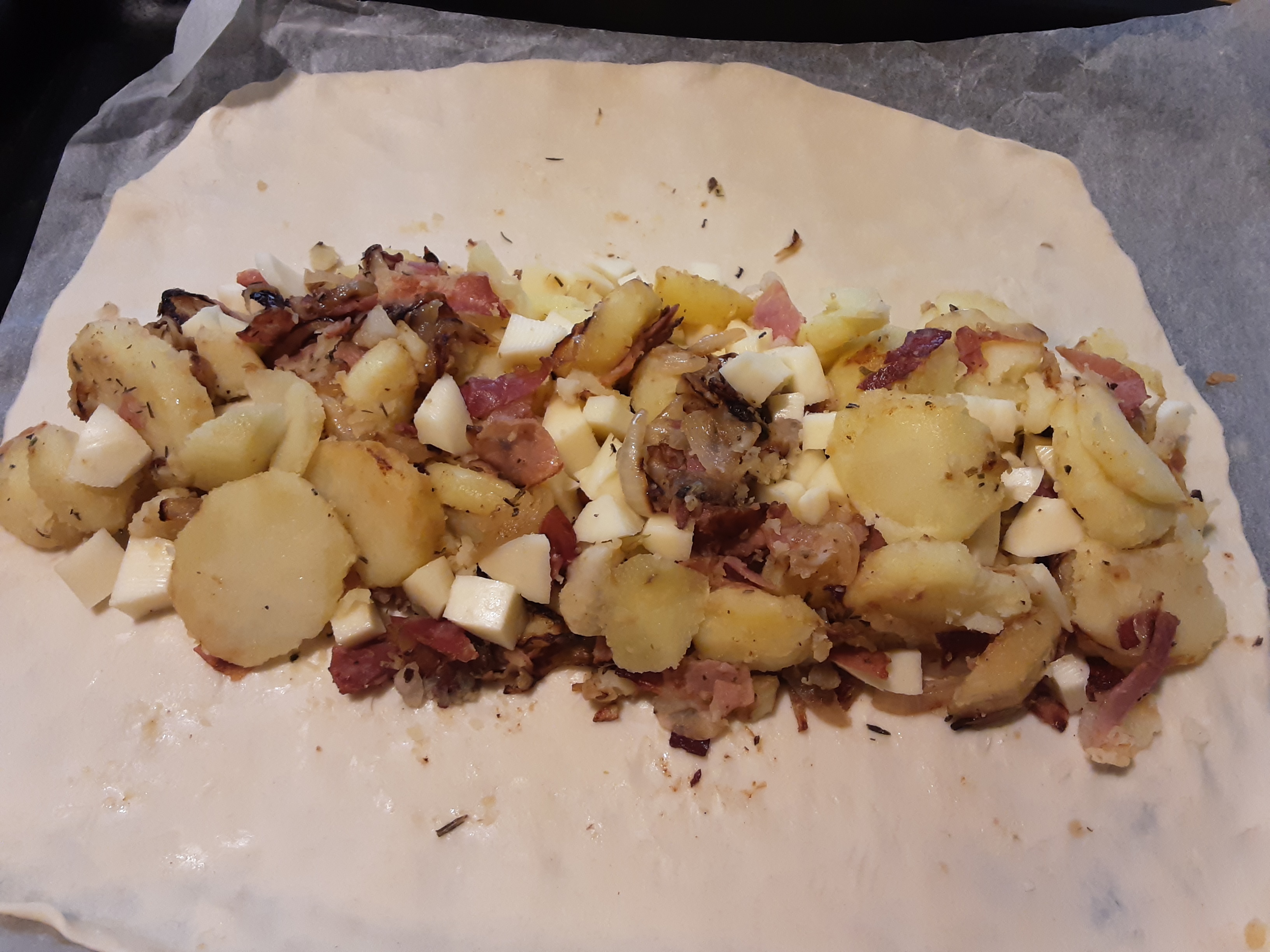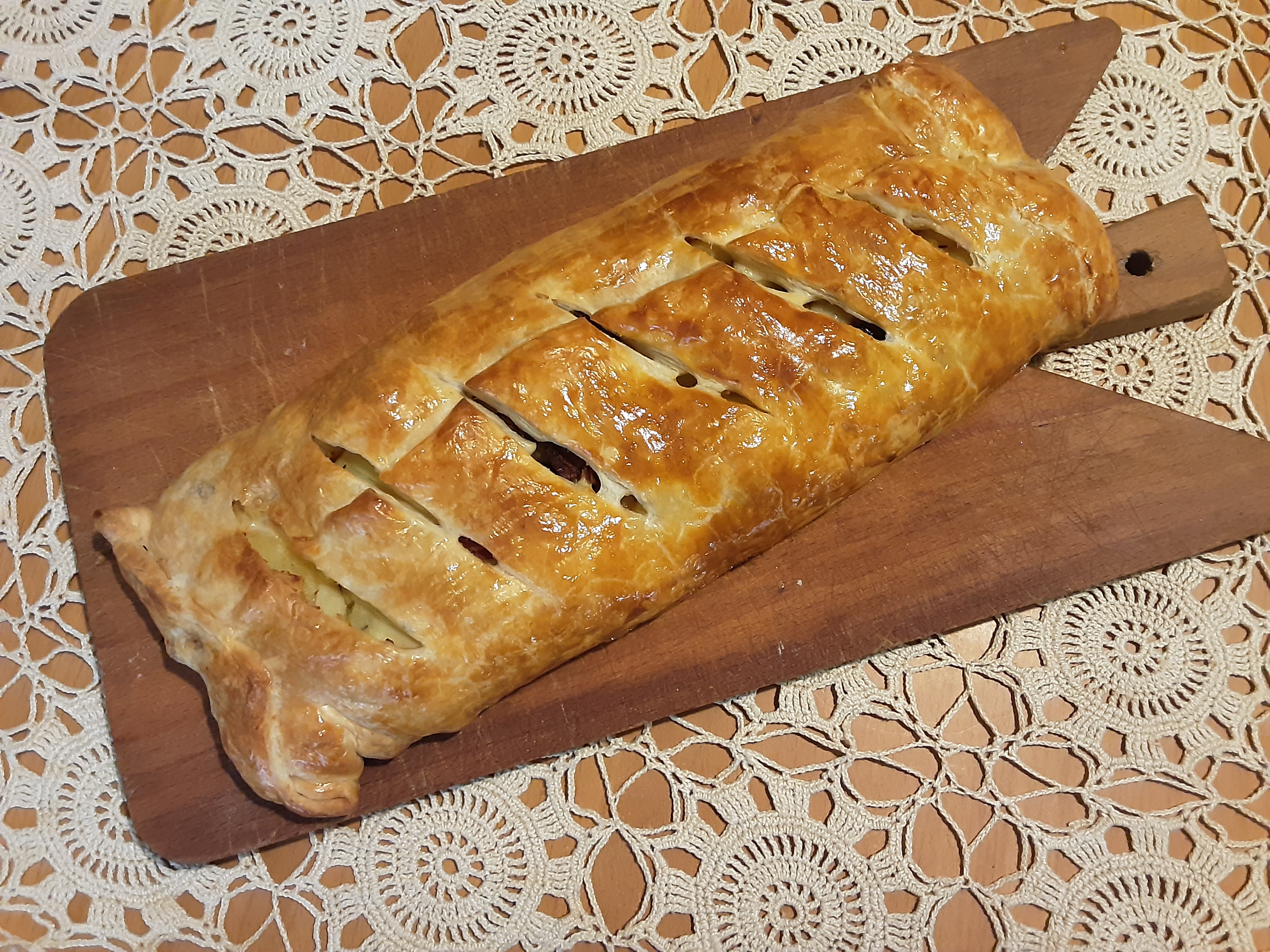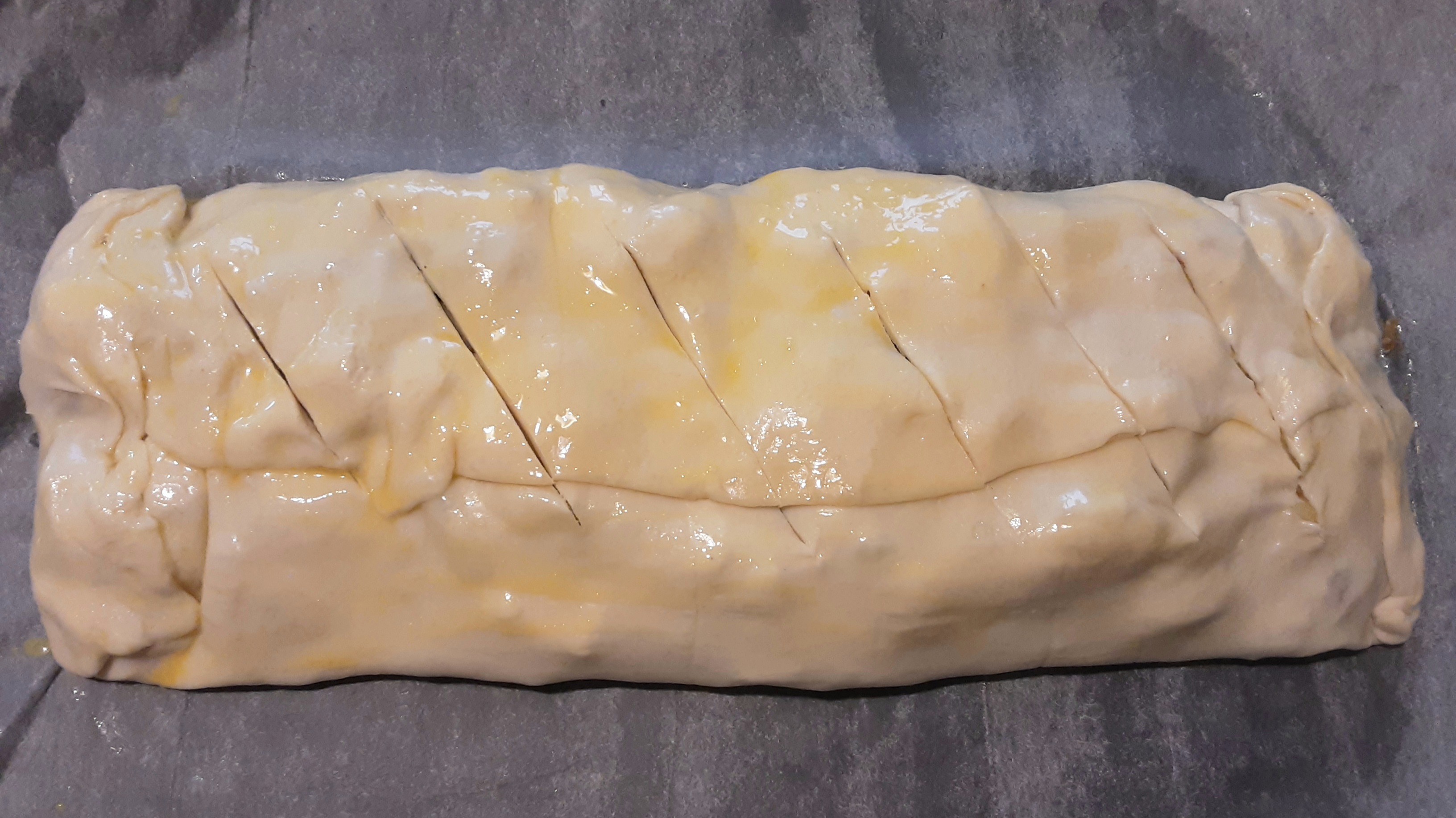 Ponete sulla pasta sfoglia srotolata, le patate e chiudete, in modo da formare lo strudel. (sigillate bene) Spennellate con il tuorlo d’uovo e fate 4 -5 taglietti sulla superficie.