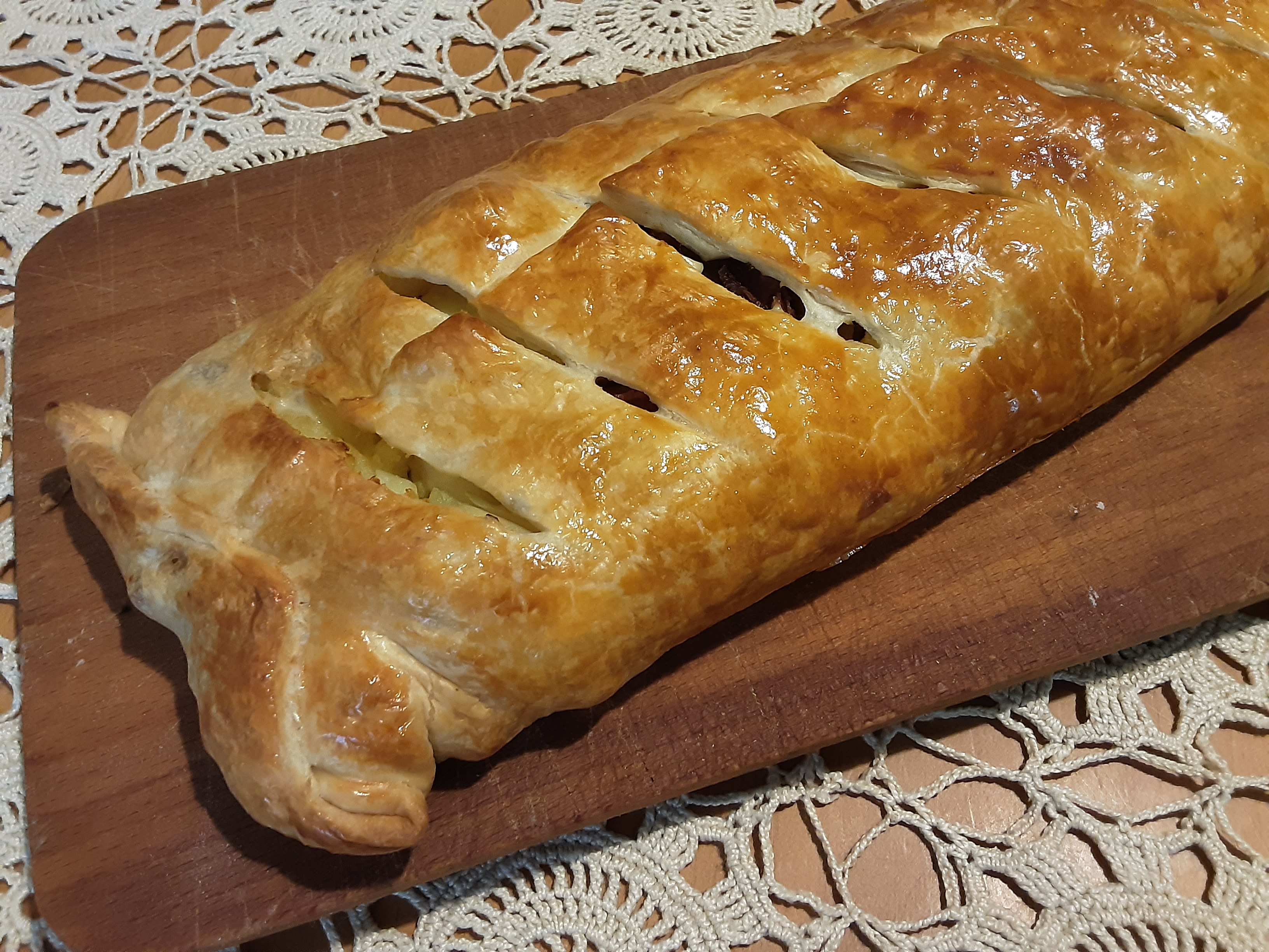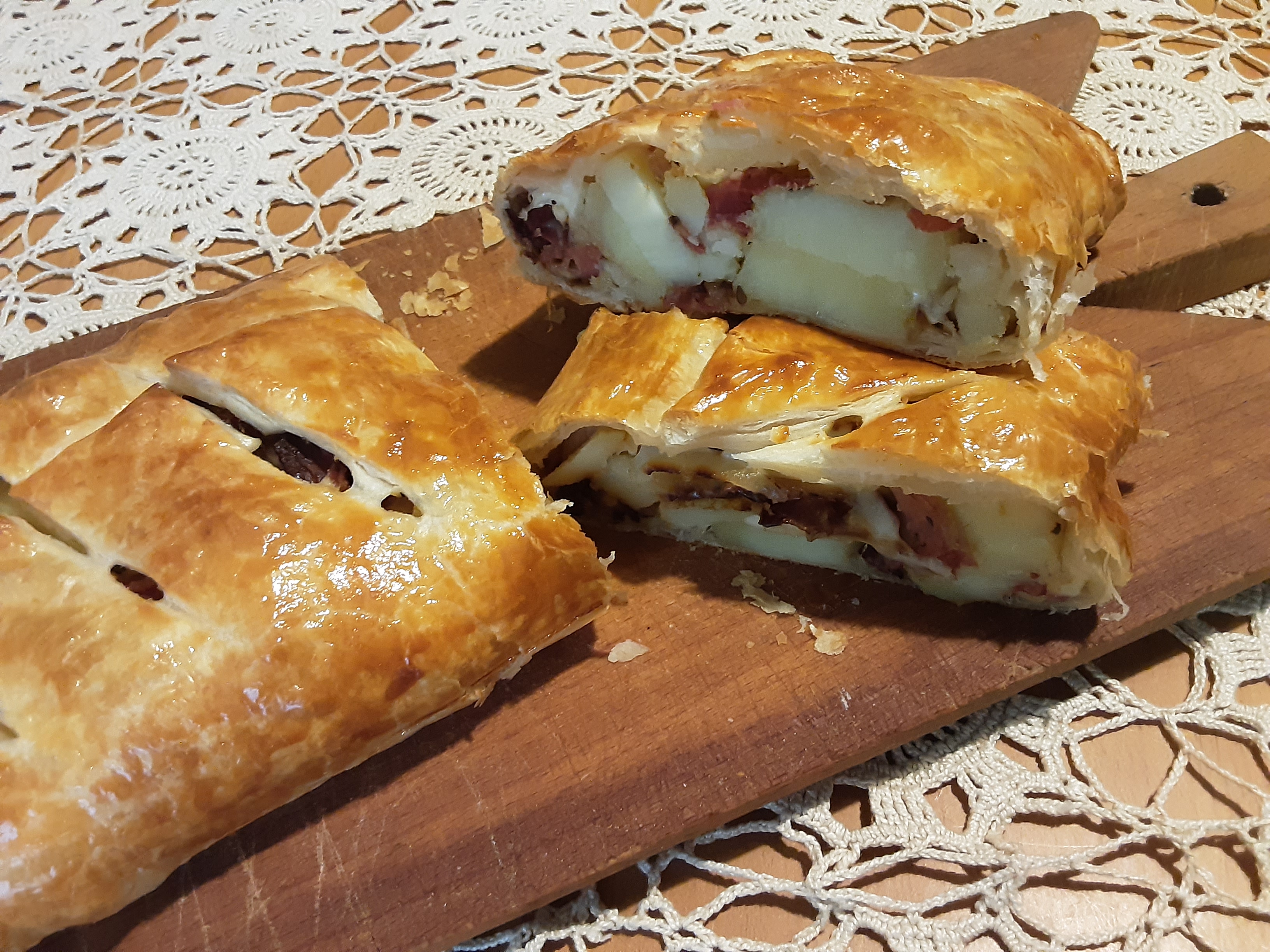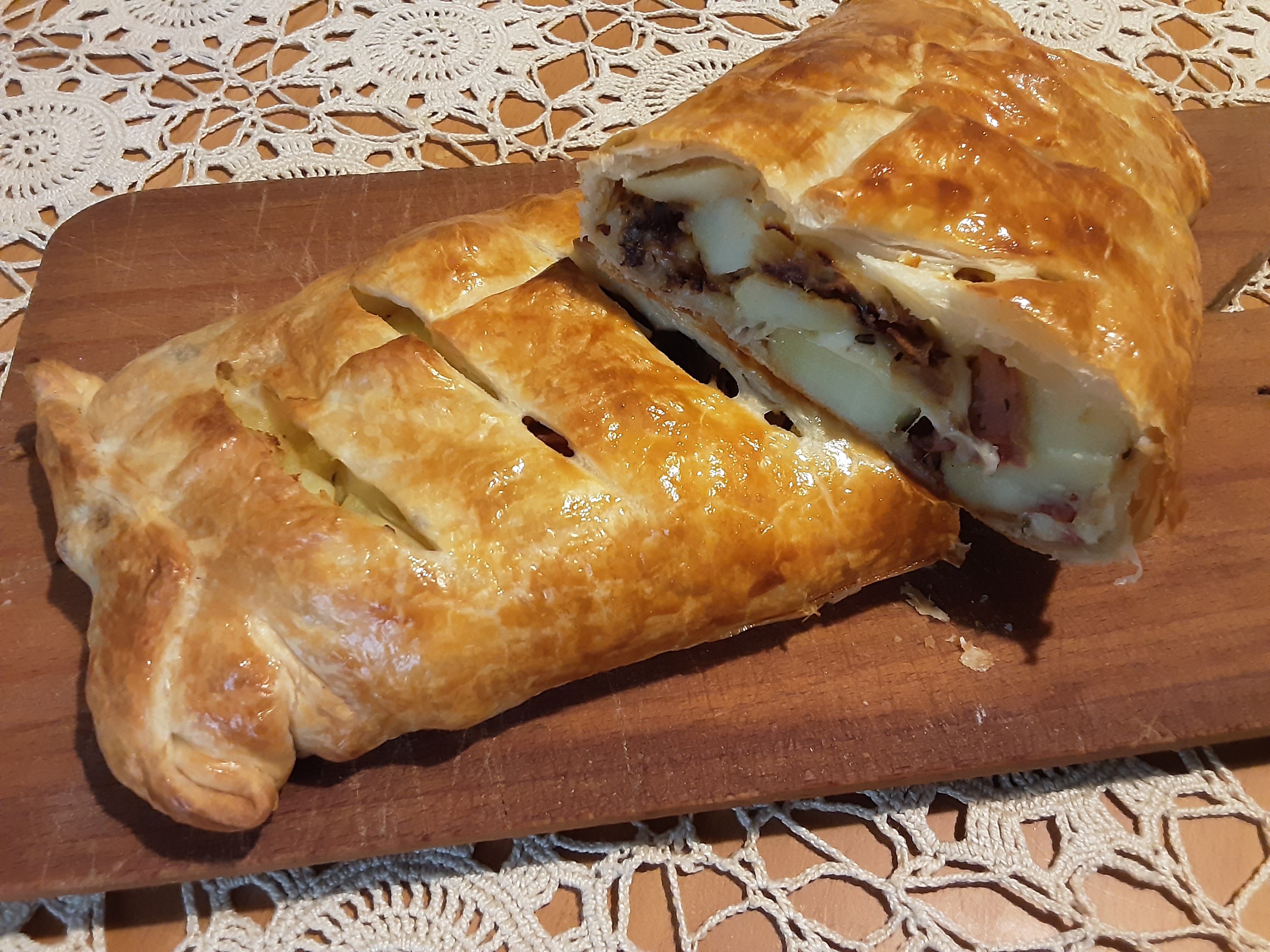 Ponete sulla pasta sfoglia srotolata, le patate e chiudete, in modo da formare lo strudel. (sigillate bene) Spennellate con il tuorlo d’uovo e fate 4 -5 taglietti sulla superficie.