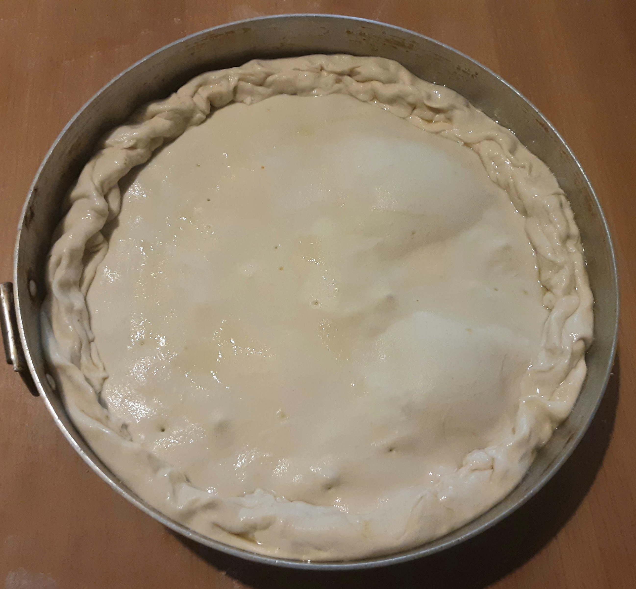 Tirate la seconda sfoglia e coprite la torta, fate il bordo, spennellate la superficie con un pochino di acqua e olio, punzecchiate con uno stuzzicadente la sfoglia per evitare che si gonfi durante la cottura e infornate in forno preriscaldato ventilato per 40 minuti circa.