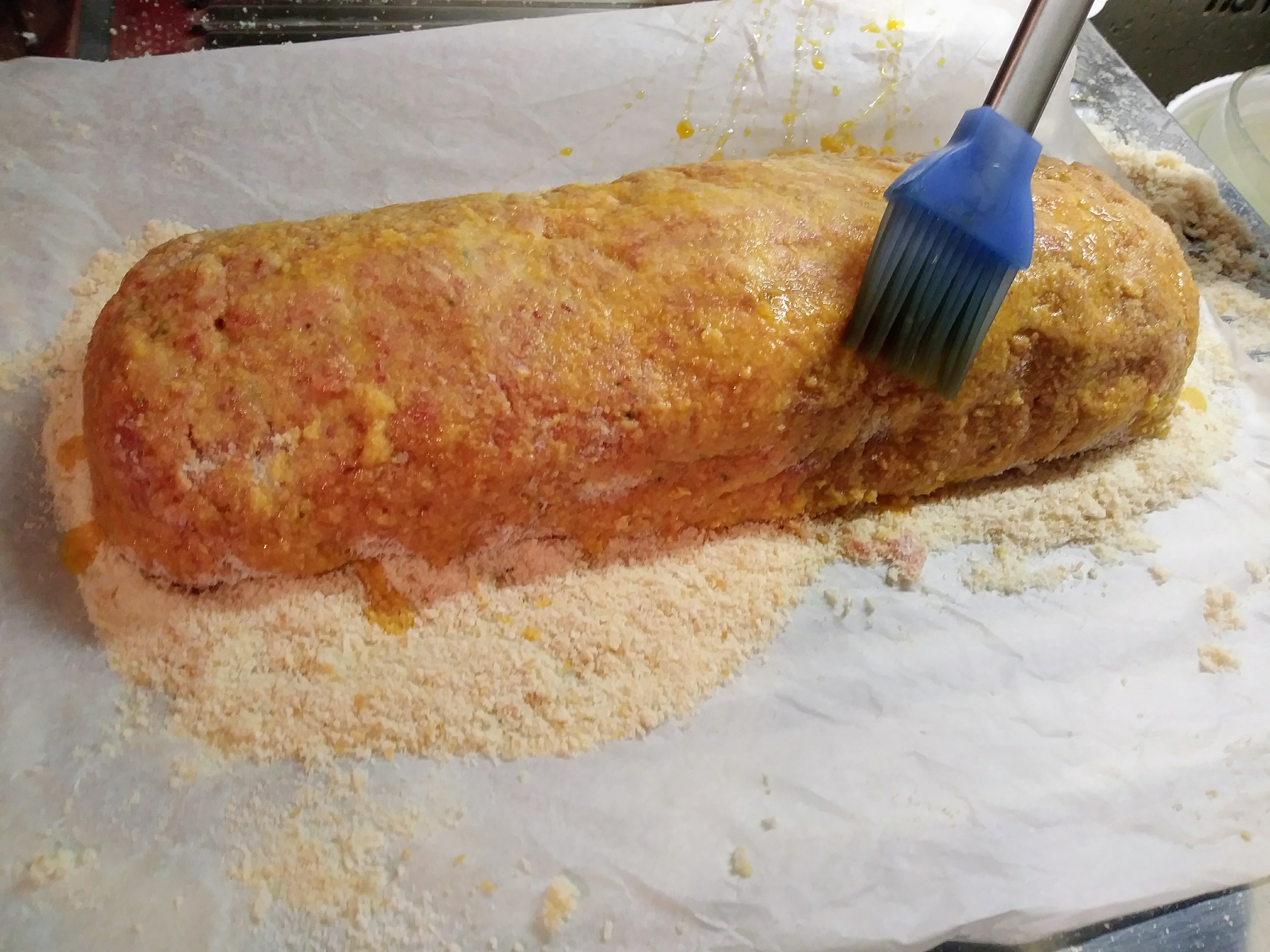 Spennellate con l’uovo leggermente sbattuto e coprite con del pangrattato, compattando bene tutto il rotolo. Con l’aiuto della carta da forno rigiratelo e spennellate anche la base ricoprendo anch’essa col pangrattato, avvolgete il rotolo con la carta da forno e ponetelo delicatamente su una teglia.