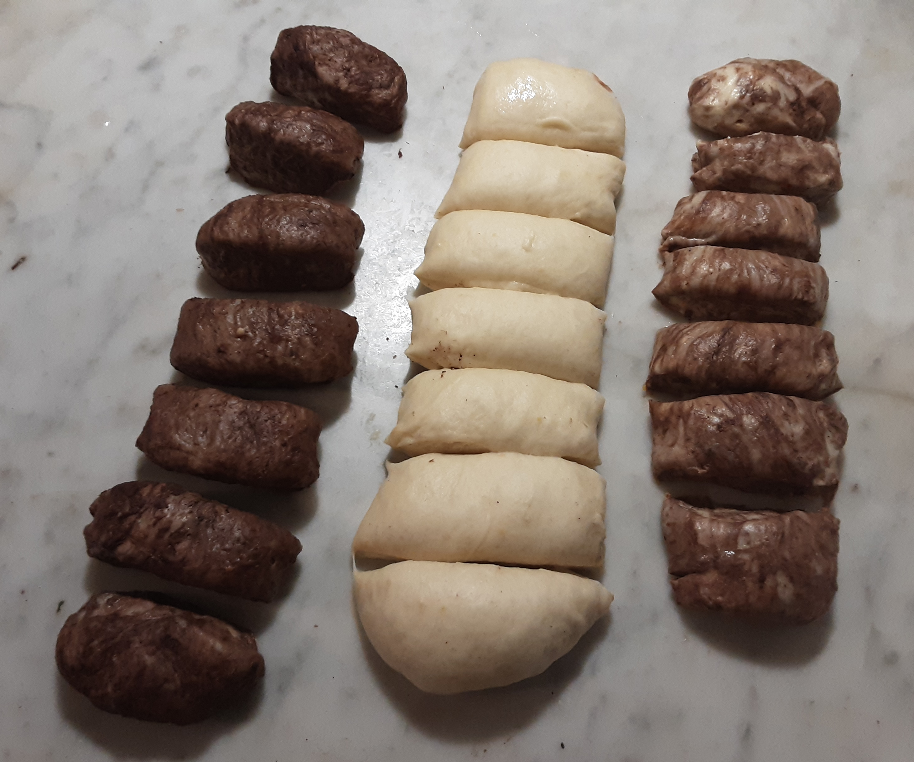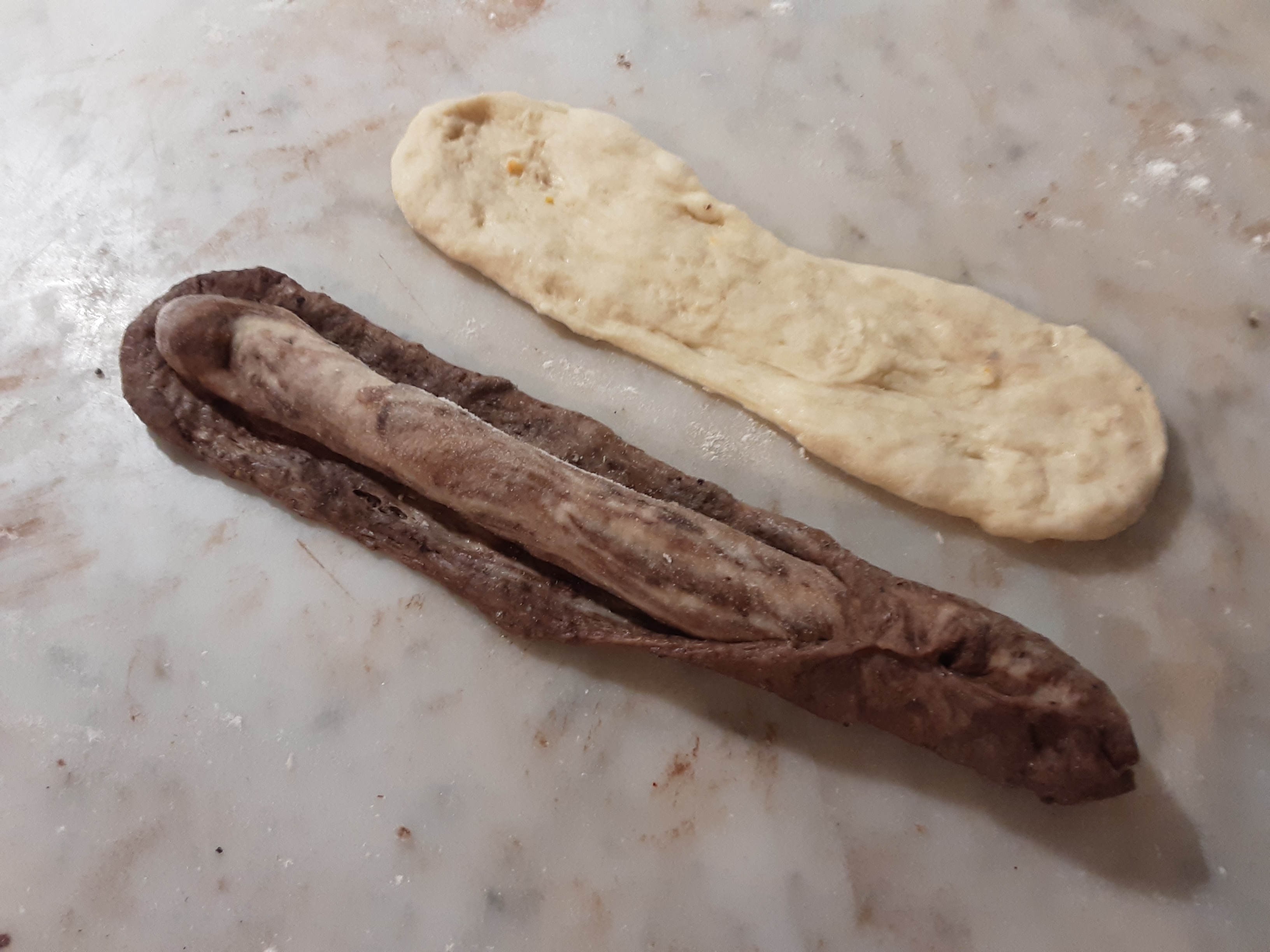 .Con l’impasto marrone chiaro formate un cilindretto, ponetelo sopra all’impasto marrone scuro steso e avvolgetelo dentro. Avvolgete questo cilindretto ottenuto all’interno dell’impasto bianco steso.