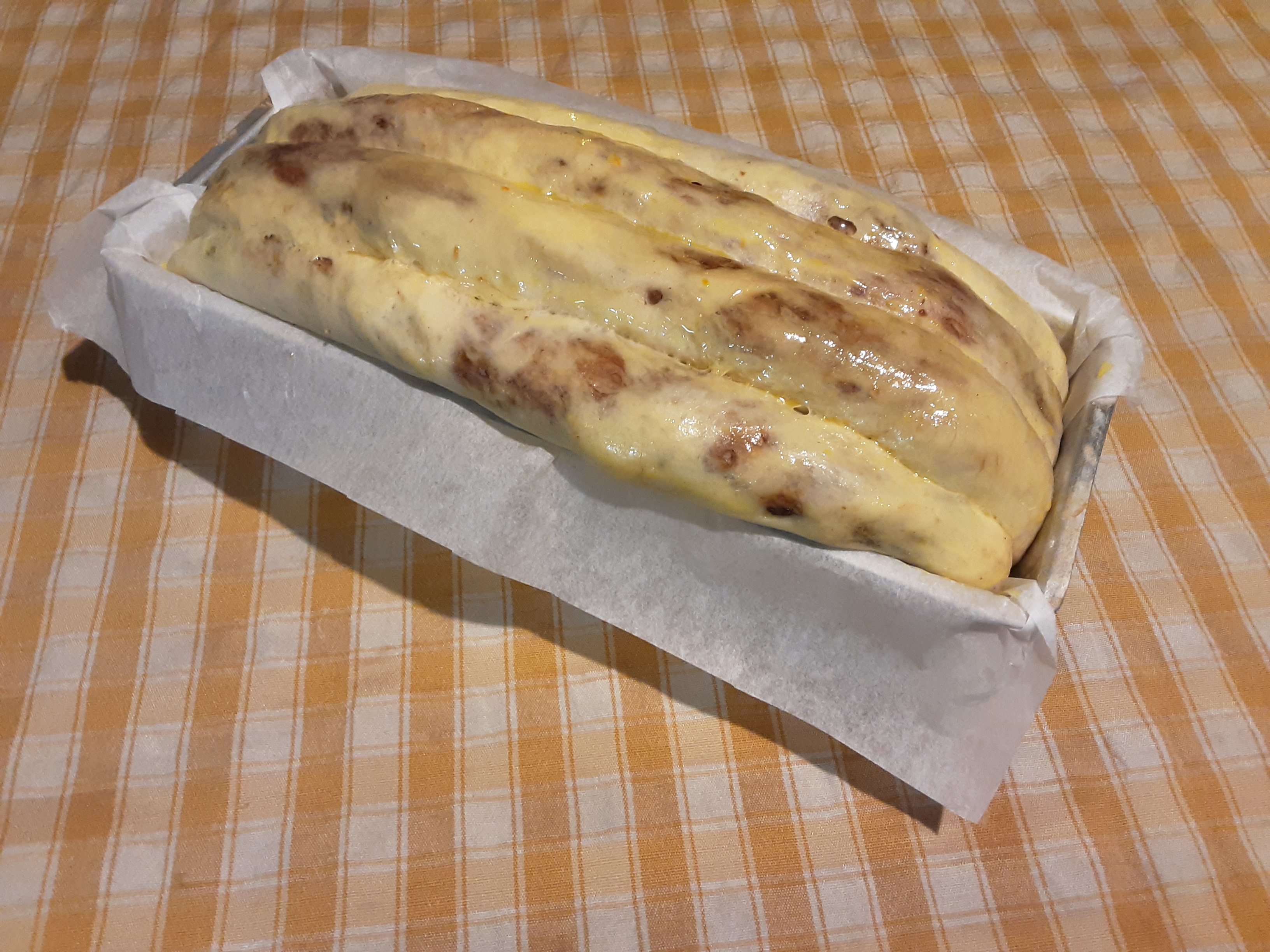Il cilindretto ottenuto sistematelo in uno stampo da plum-cake di 30 cm di lunghezza, foderato con carta da forno.