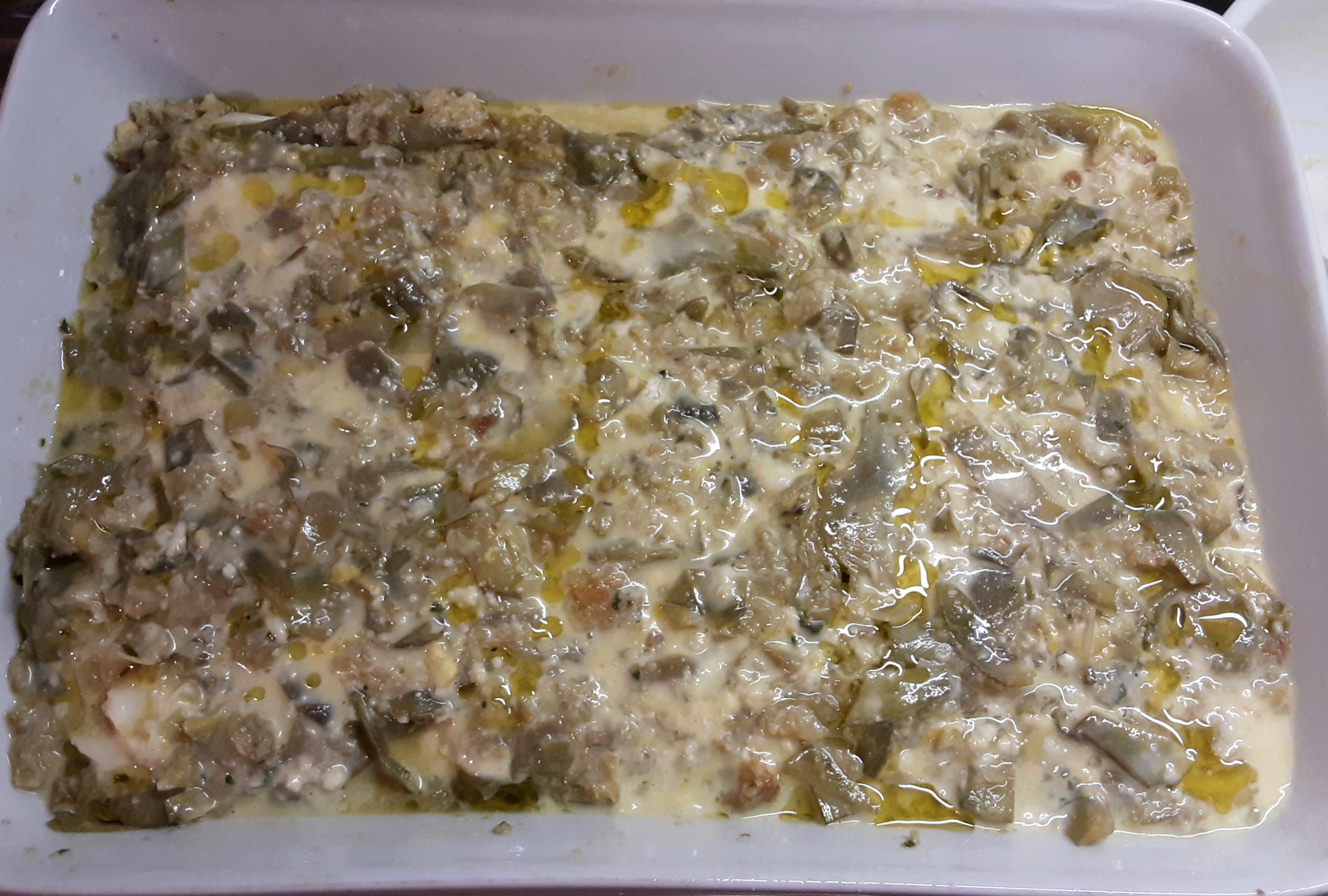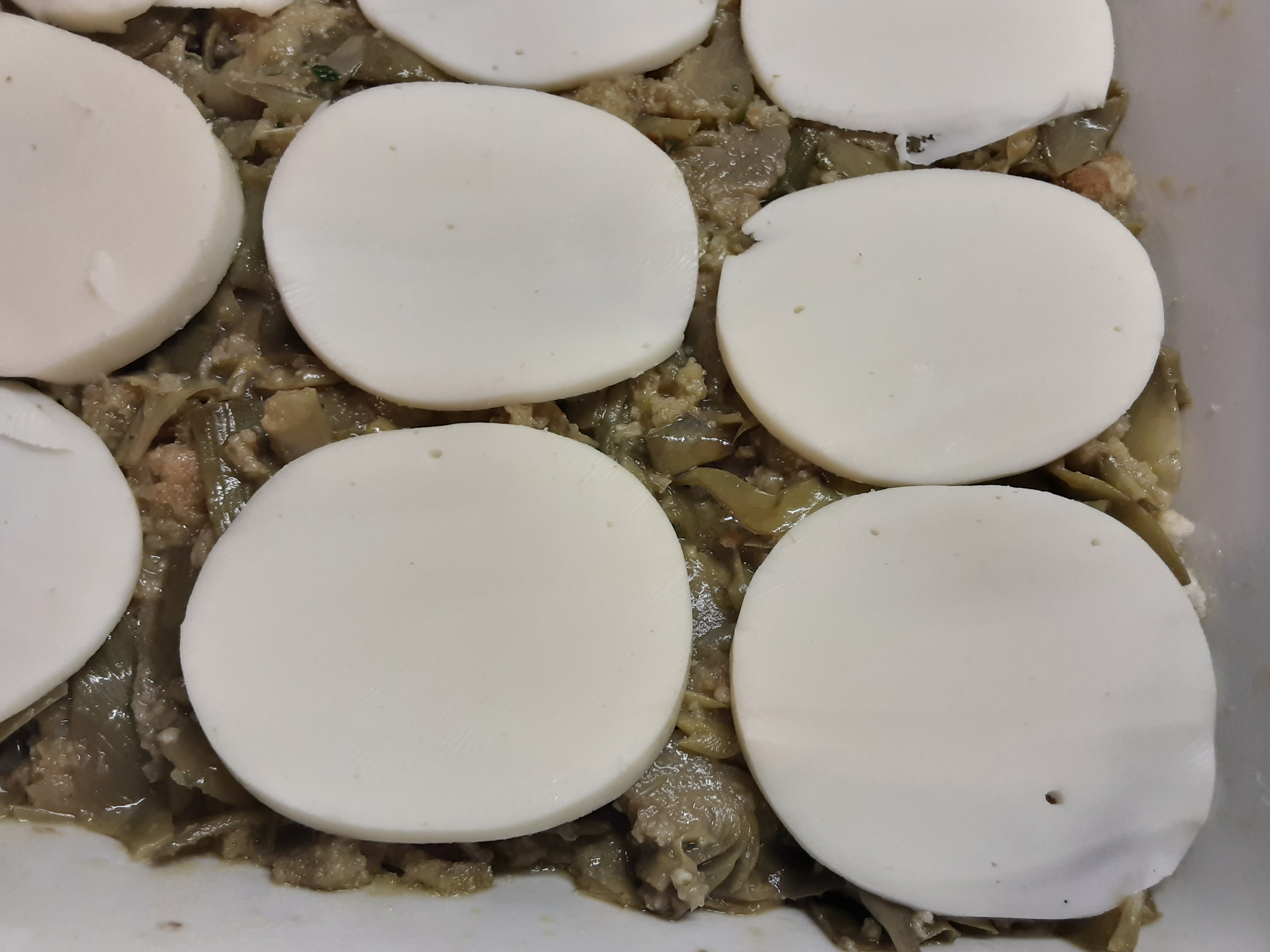 Mescolate il tutto e versate metà del composto in una teglia (30 per 25 cm) ben oleata (cospargete con una manciata di pangrattato o di farina così non si attaccherà sul fondo), coprite con la provola tagliata a fette e versate sopra l’altra metà del composto di uova e carciofi.