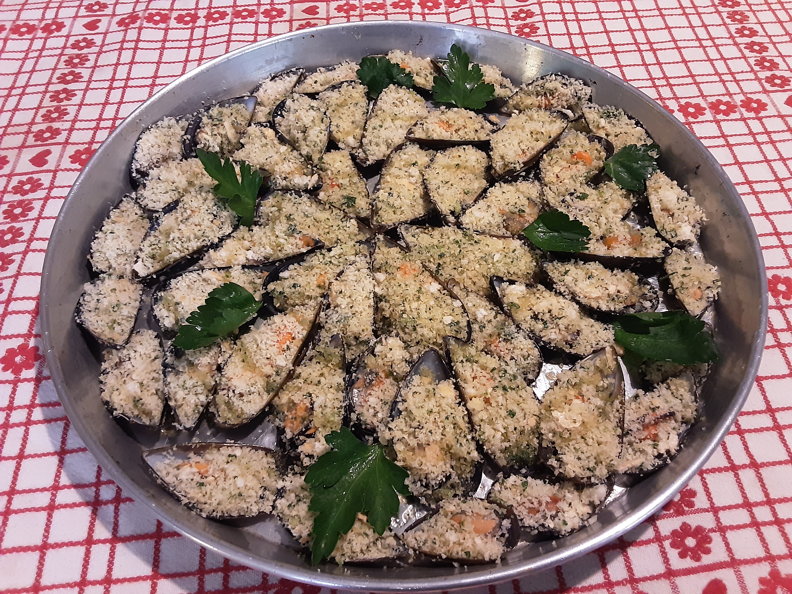 Dividete i gusci e su ogni guscio con il mollusco mettete un poco del composto di pangrattato, facendolo aderire bene. Potete le cozze pronte su una teglia oleata e irroratele con un filo l’olio