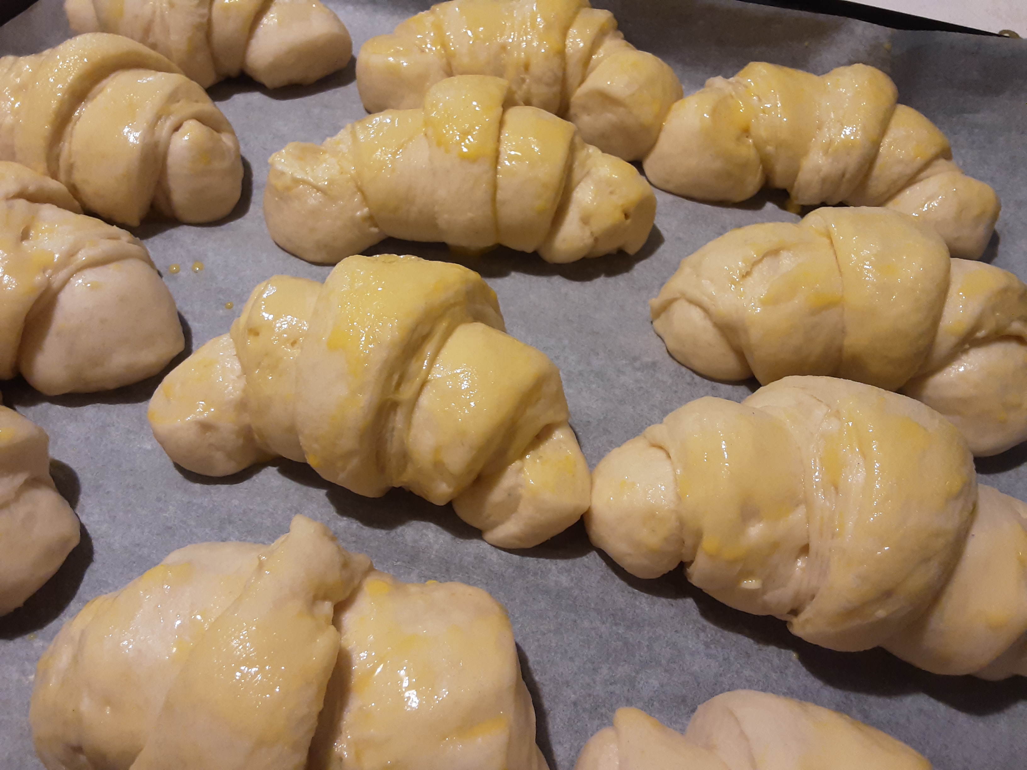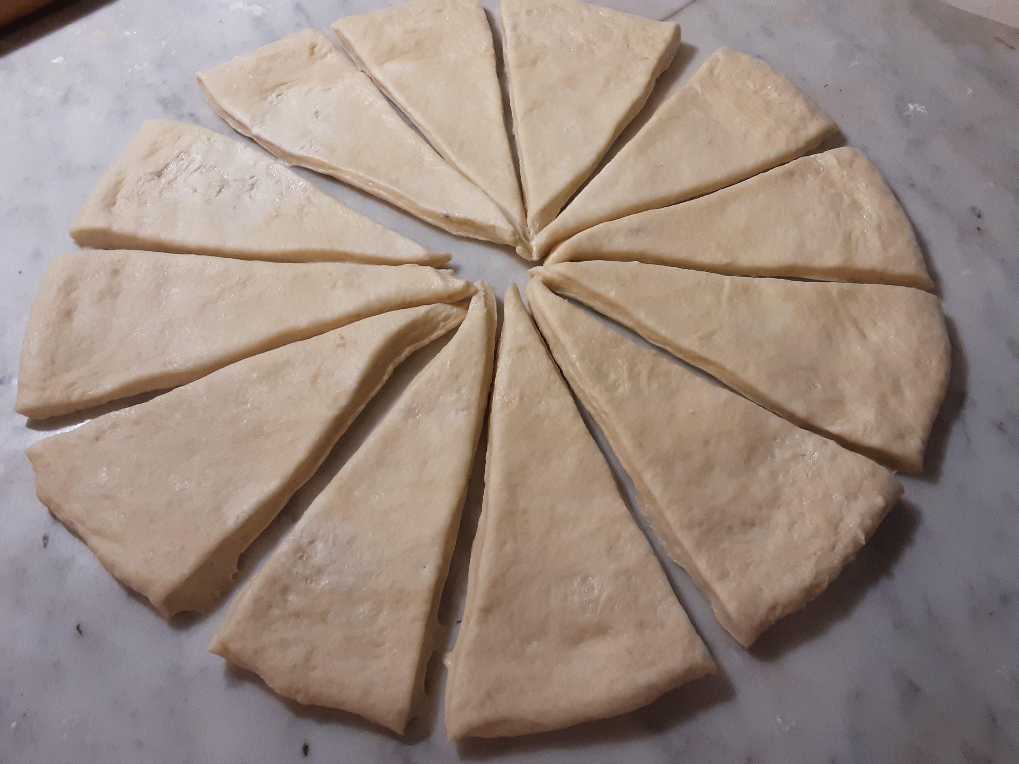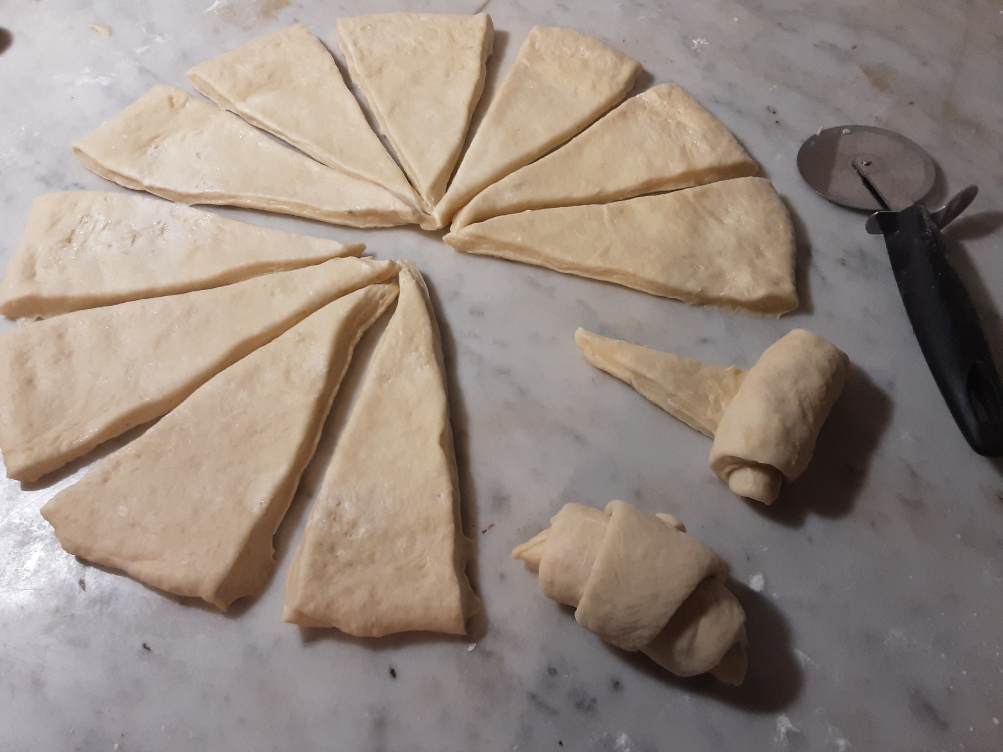 Con il matterello stendete la pila di dischi fino ad uno spessore di un centimetro circa. Dividete il cerchio in dodici triangoli e tirando la base arrotolateli per dare la forma alle brioches.