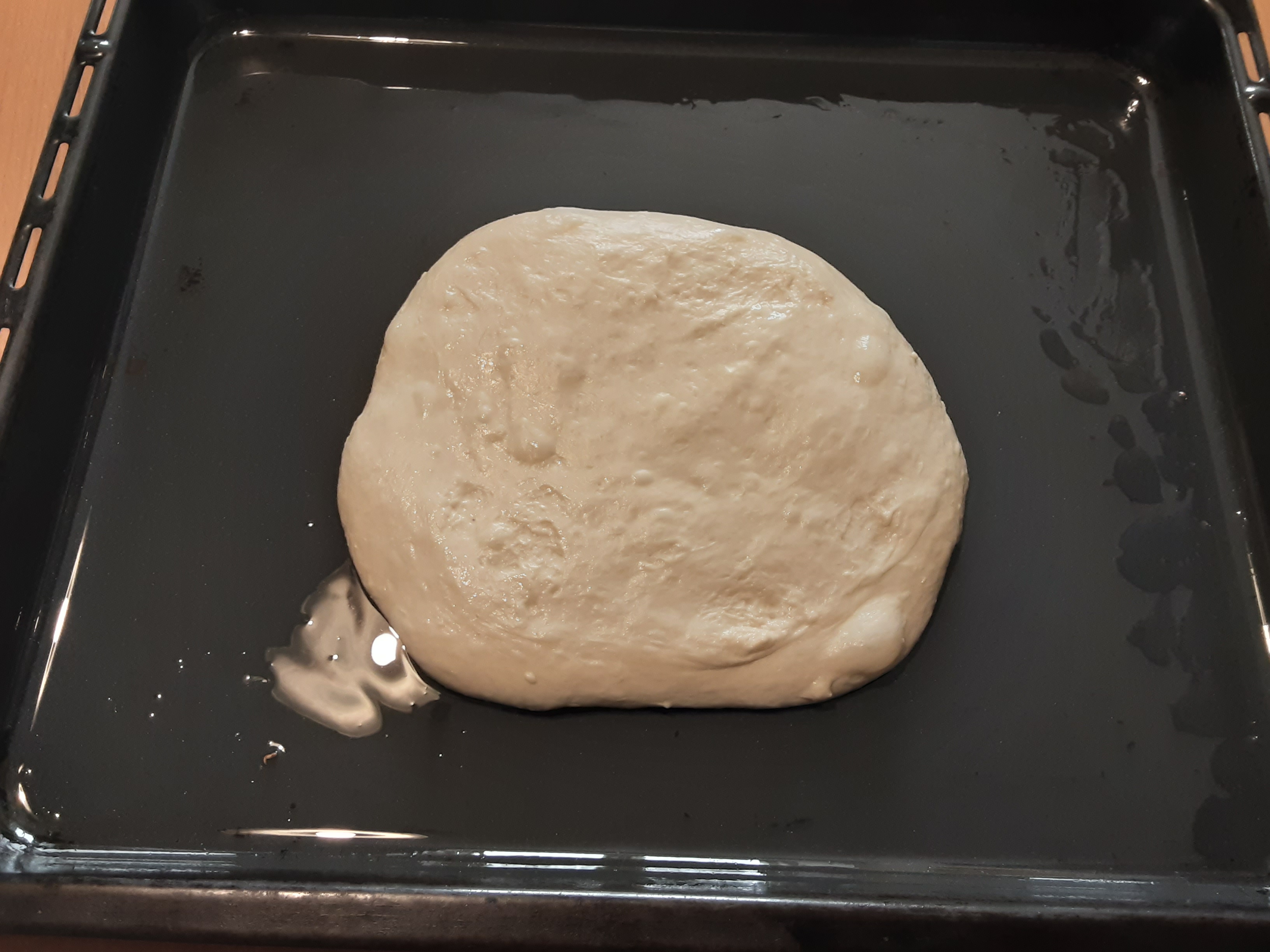 Poi ungetevi le mani e raccogliete l’impasto in una palla, ponetela in una teglia da forno ben oleata e lasciatela lievitare per 40 minuti, nel forno con la lucina accesa.
