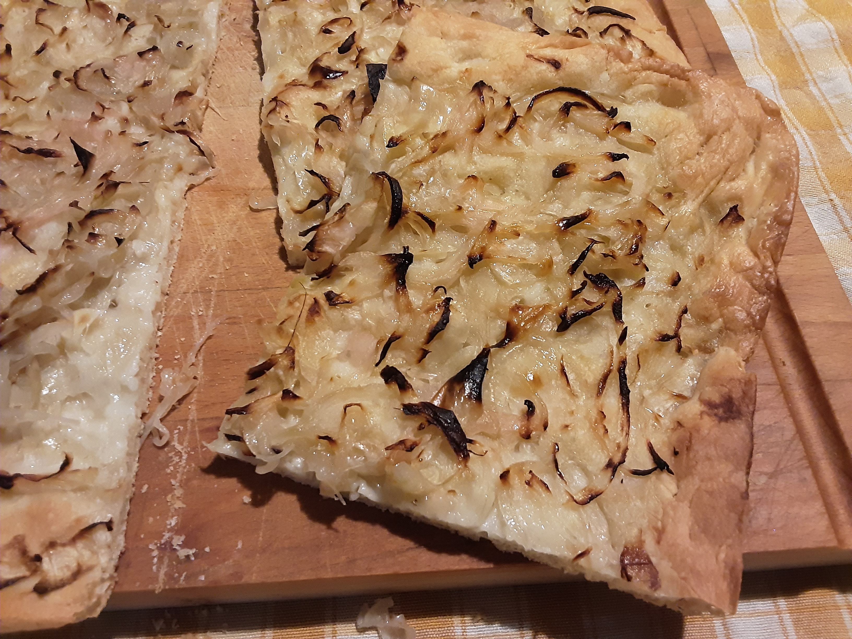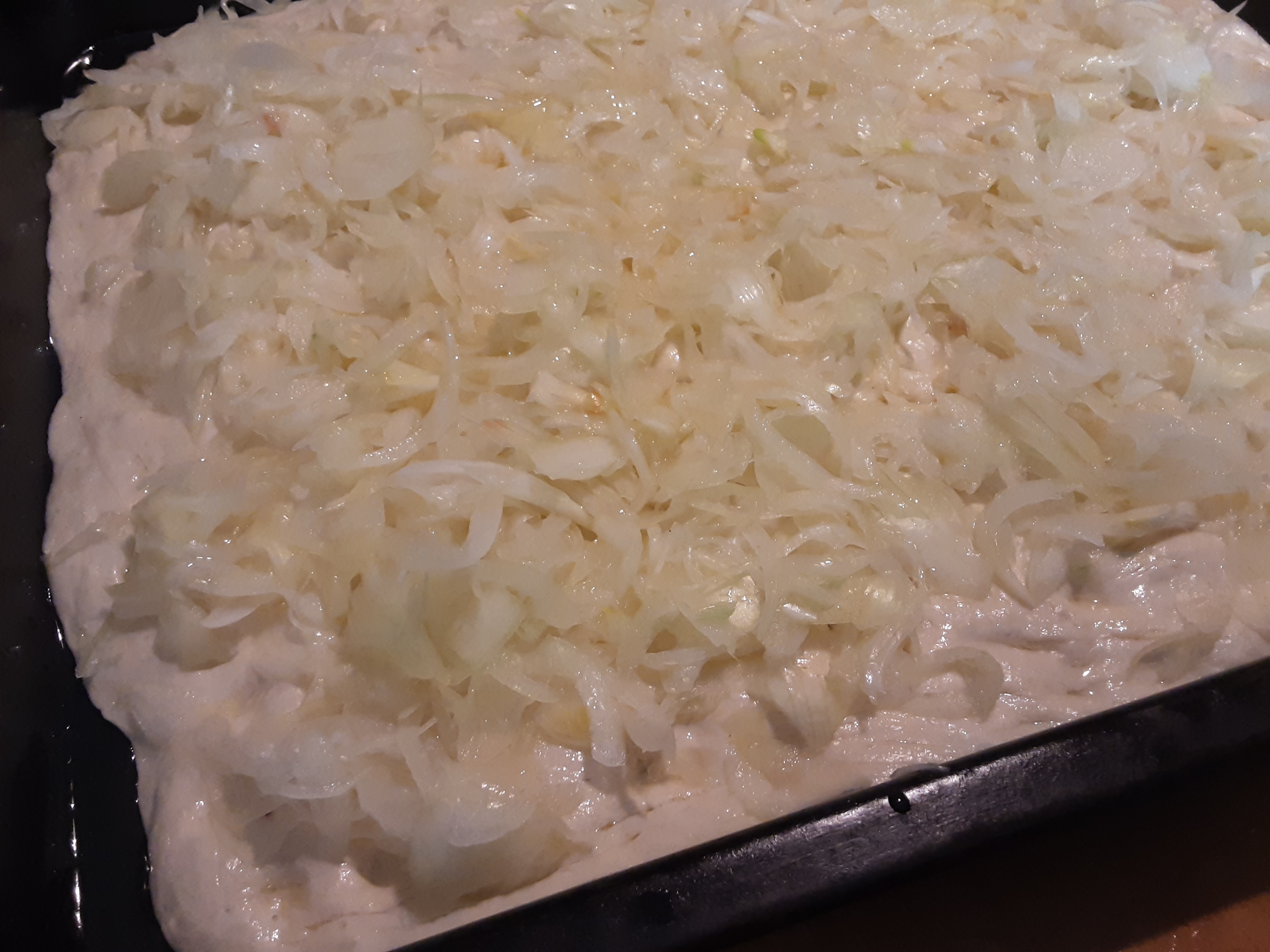 Dopodiché fate i classici buchi della focaccia affondando le dita di entrambe le mani, dato che l’impasto è molto morbido ungetevi sempre le punte delle dita prima di fare i buchi. Cospargete le cipolle ben strizzate.