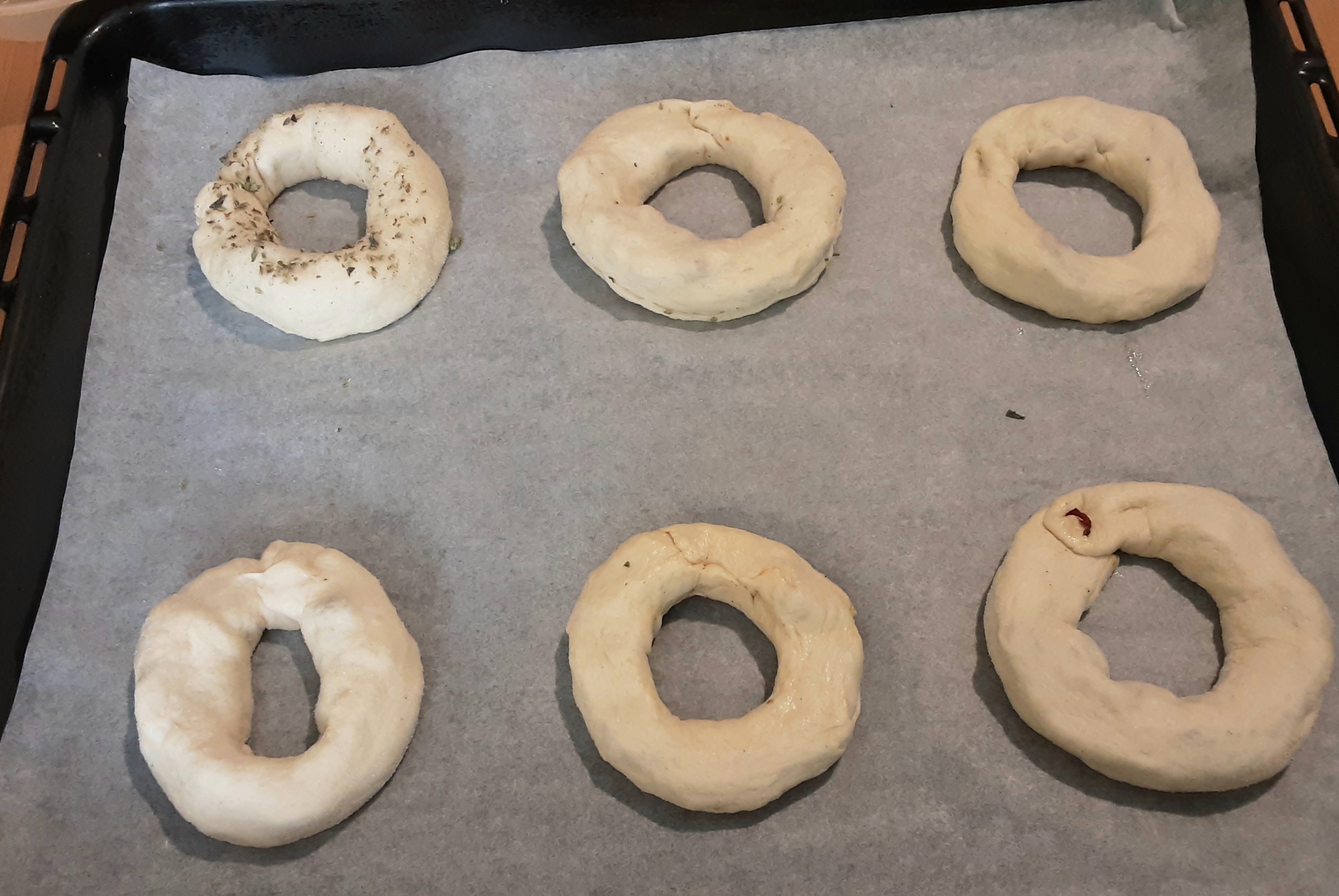 Nelle altre mettete alcuni filetti di acciughe, 3-4 olive spezzettate, un pizzico di peperoncino, scaglie di pecorino e formate quindi altre 6 “cudduredde”. Cospargete sopra un po’ di origano, per distinguerle dalle altre. Ponetele su un’altra teglia rivestita con carta da forno.