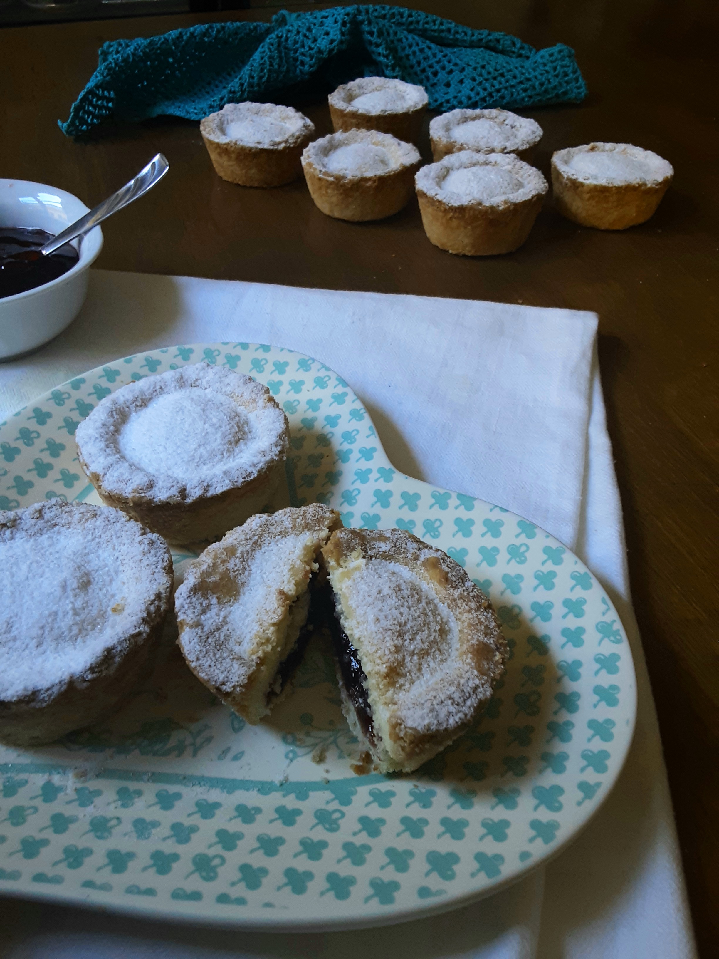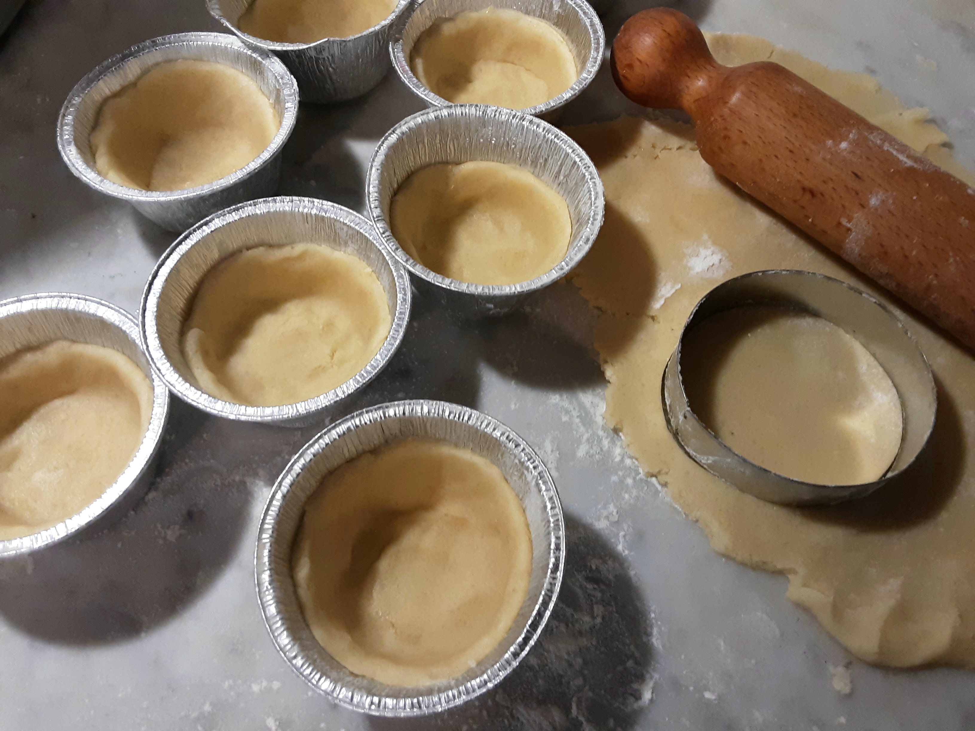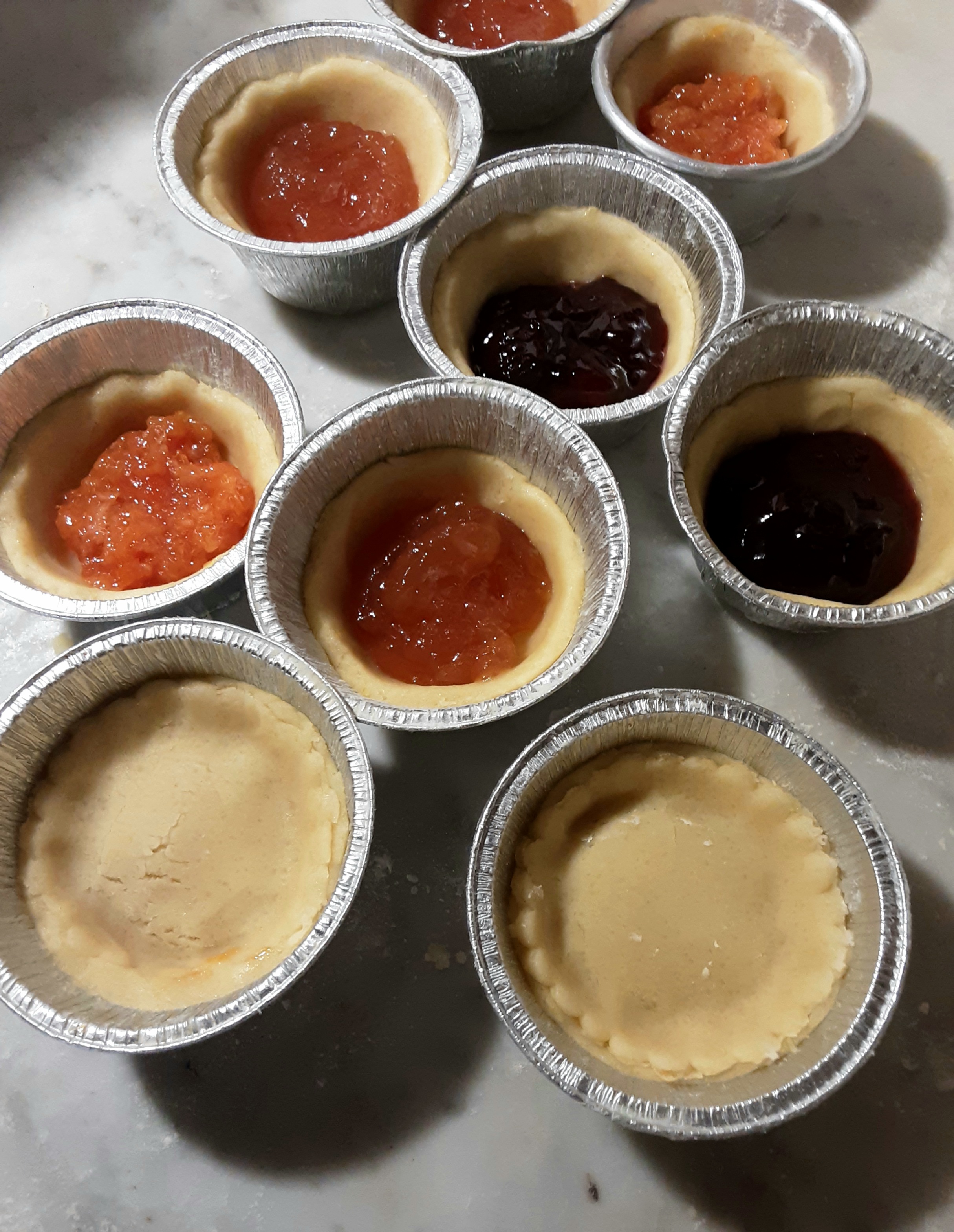 Con il mattarello stendete la pasta frolla, a 5 mm di spessore., su un poco di farina e, con un coppapata di 8 cm di diametro (o con un bicchiere) ricavate 12 dischetti.Con ciascun dischetto foderate degli stampini da muffin (la frolla non deve raggiungere il bordo), al centro aggiungete 2 cucchiaini colmi di marmellata.