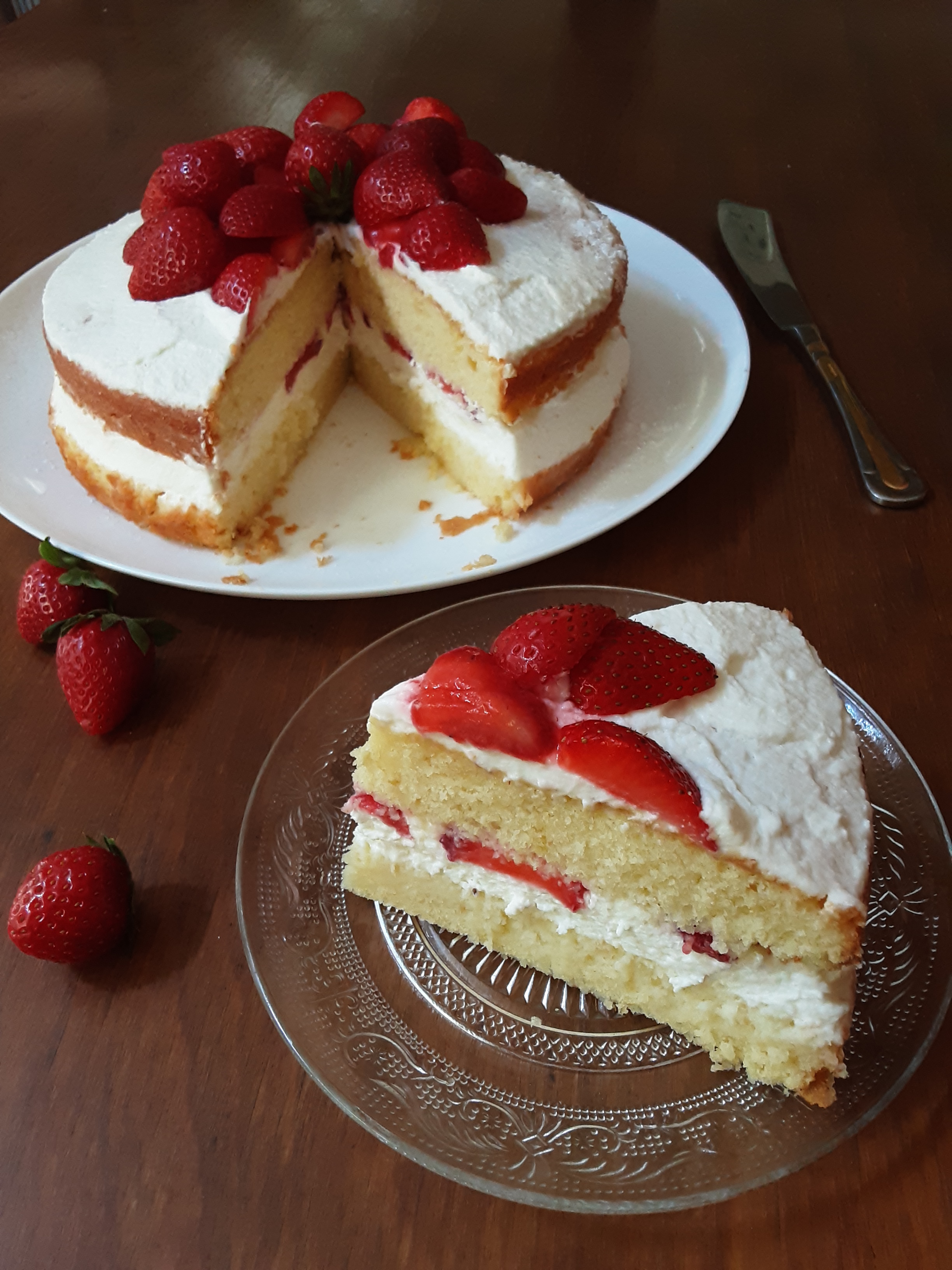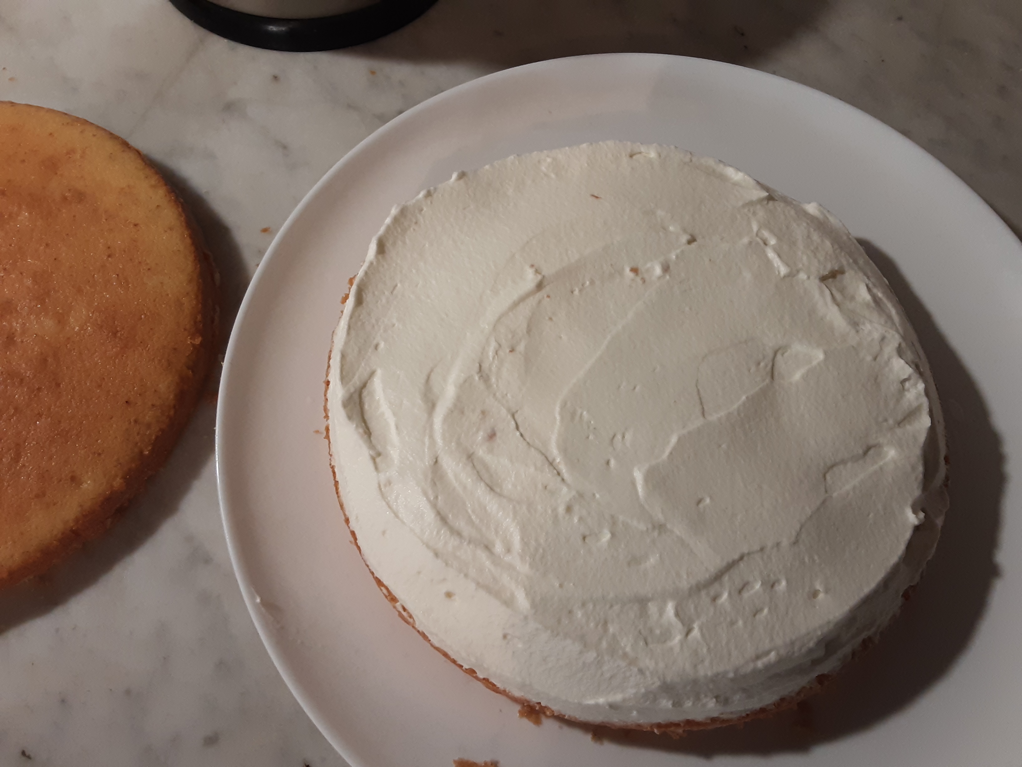 Montate la panna, aggiungete il latte condensato e mescolate delicatamente. Tagliatela a metà la torta, bagnate la base con l’acqua e i due cucchiai di zucchero (e il limoncello a piacere), spalmate la panna montata. Lasciatene una piccola parte di panna per la superficie. Aggiungete quindi le fragole con lo zucchero.