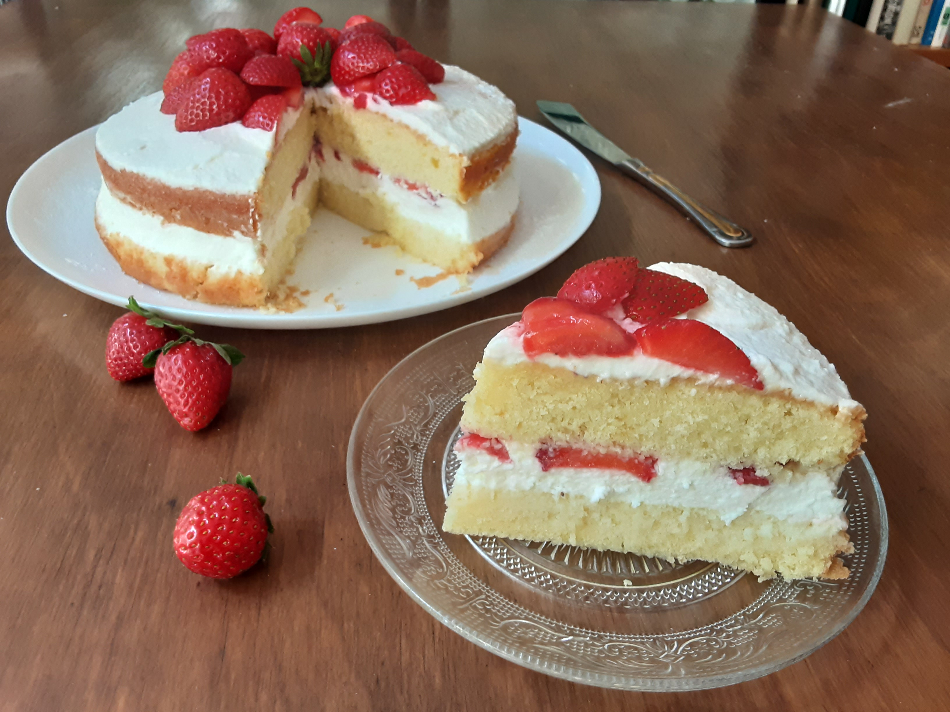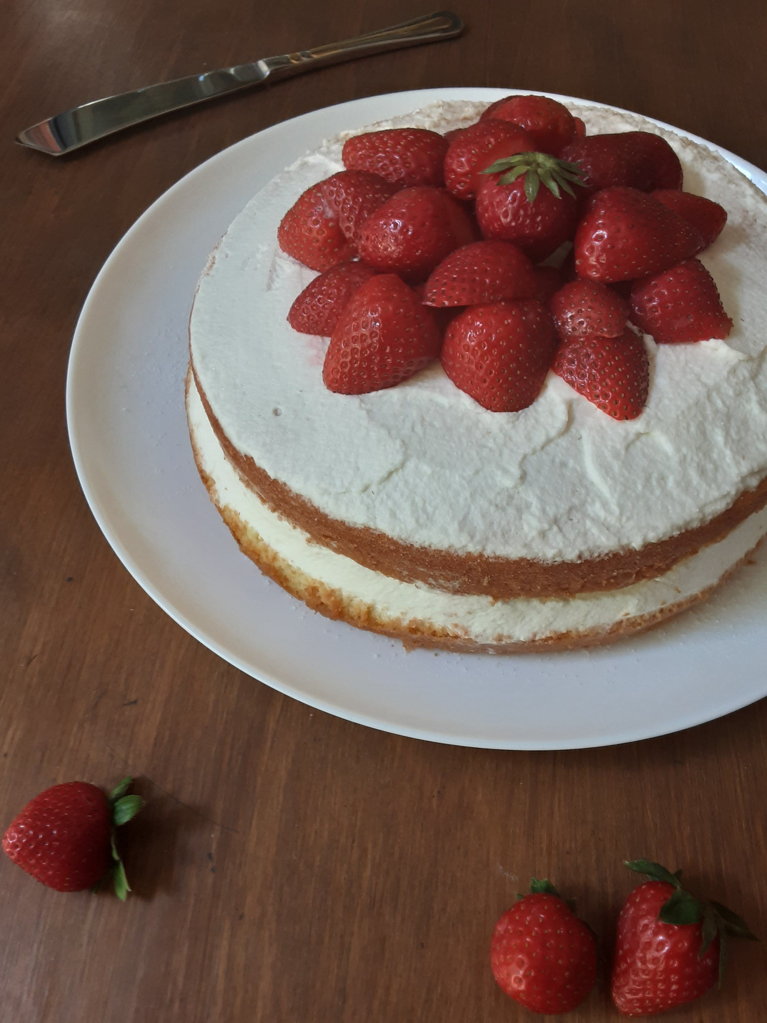 Lavate le fragole, eliminate le foglioline e, una parte tagliatele a fettine, ponetele in una ciotola con un cucchiaio di zucchero e il succo di mezzo limone. Mettete le fragole in frigorifero per mezz’ora. L’altra metà delle fragole tenetele da parte per decorare la torta.