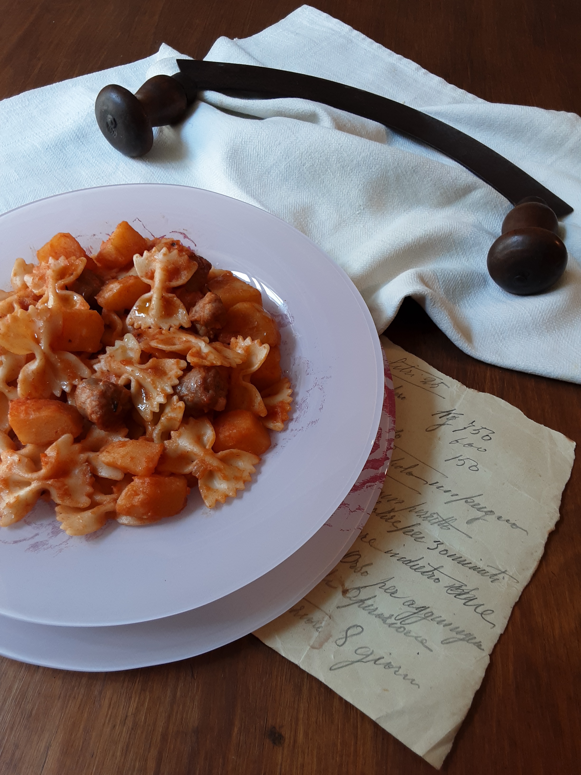 Pensa che quando ero in Scozia tanti anni fa, avendo a disposizione solo patate e cipolle, avevo preparato una pasta simile, anche se in bianco e con i salsicciotti scozzesi che sembravano più wurstel che salsicce!