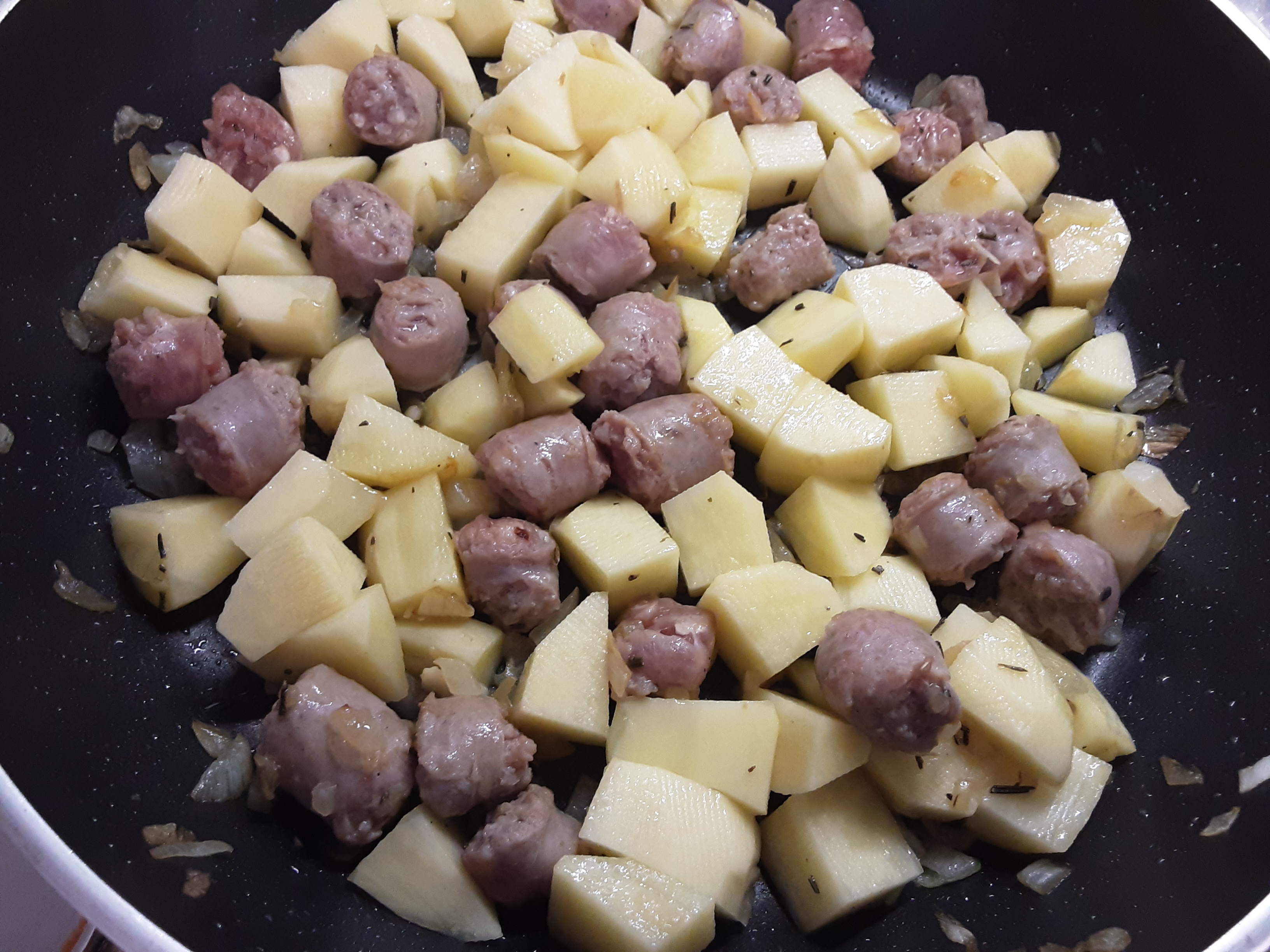 In una padella fate rosolare in poco olio la cipolla affettata, aggiungete la salsiccia tagliata a tocchetti, il rosmarino tritato e le patate, precedentemente sbucciate, lavate e tagliate a cubetti.