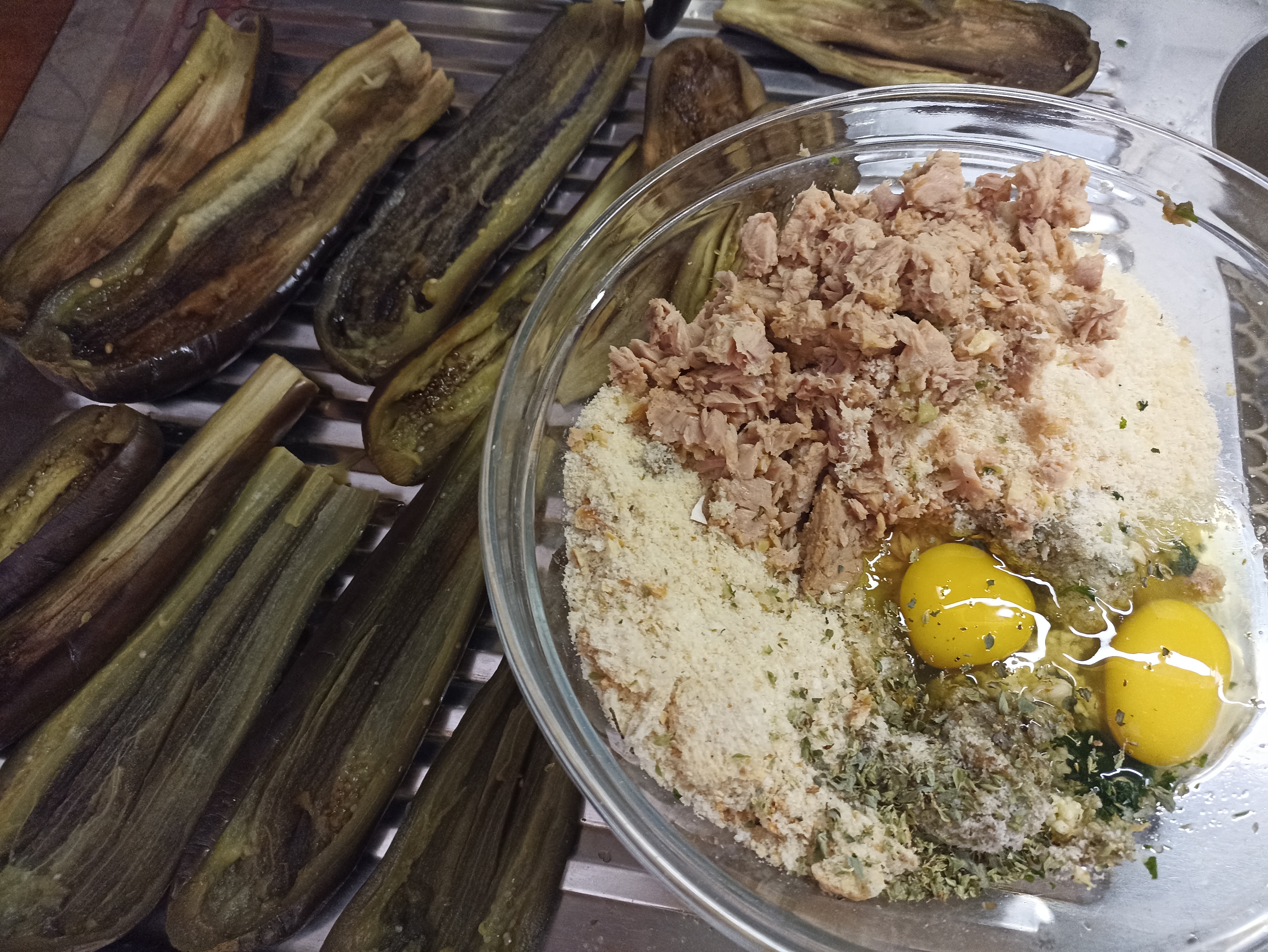 Aggiungete le uova, il pangrattato, il parmigiano grattugiato, il vino bianco, il tonno sgocciolato, l’aglio e il prezzemolo tritati, una spolverata di origano e aggiustate di sale.