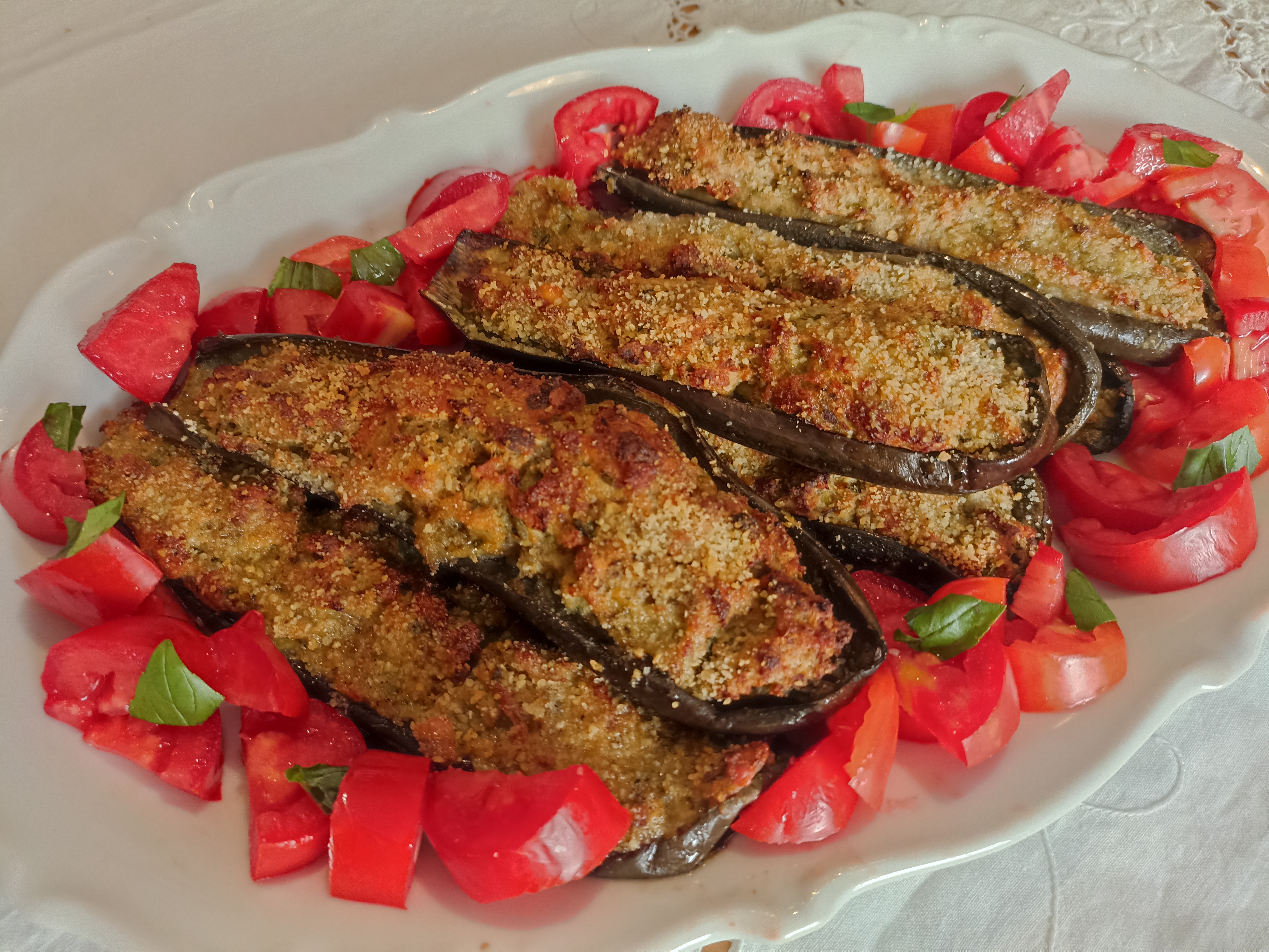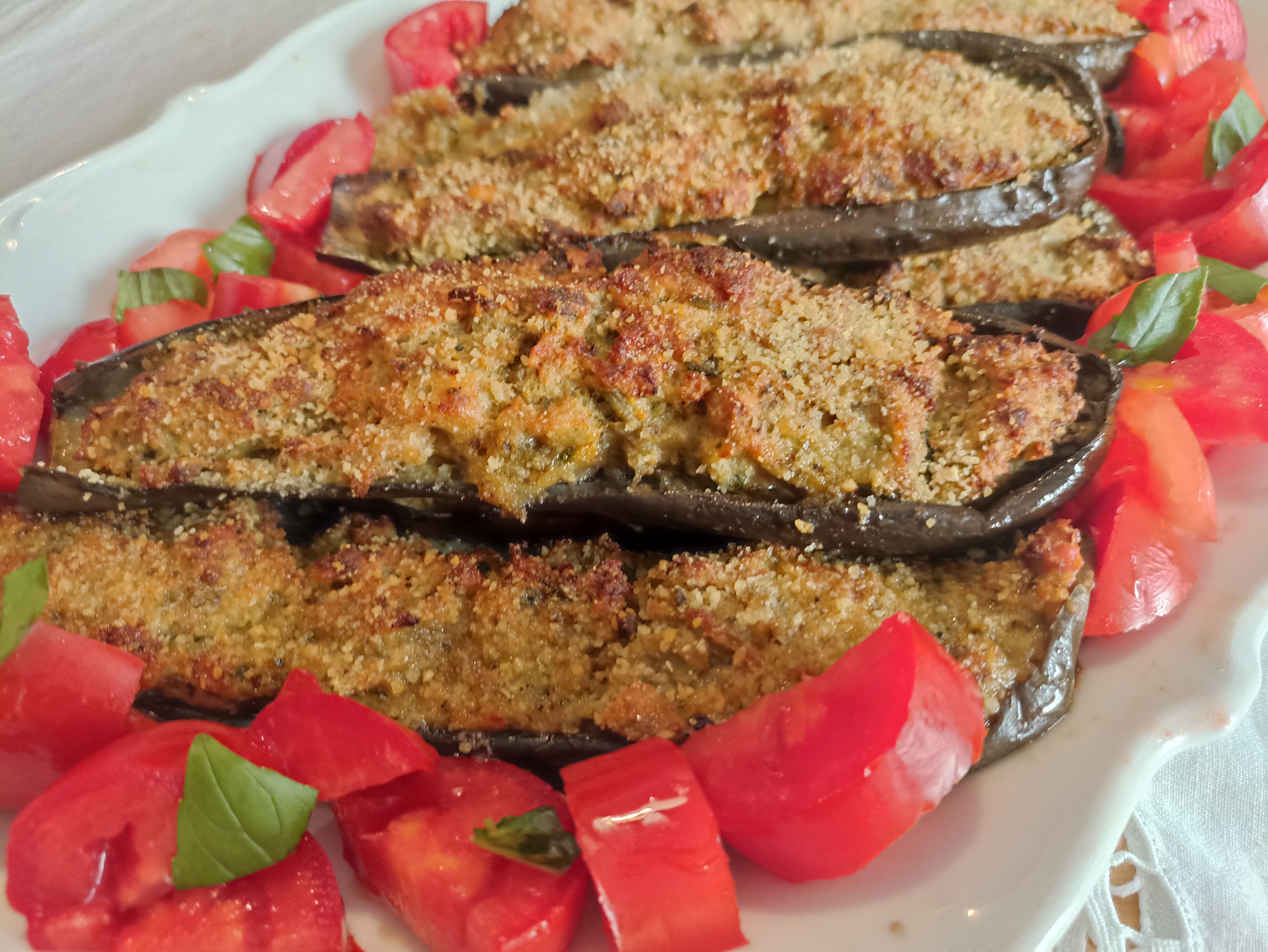 Cospargete le melanzane con pangrattato e un filo d’olio, cuocetele in forno preriscaldato ventilato a 180° per 30 minuti.