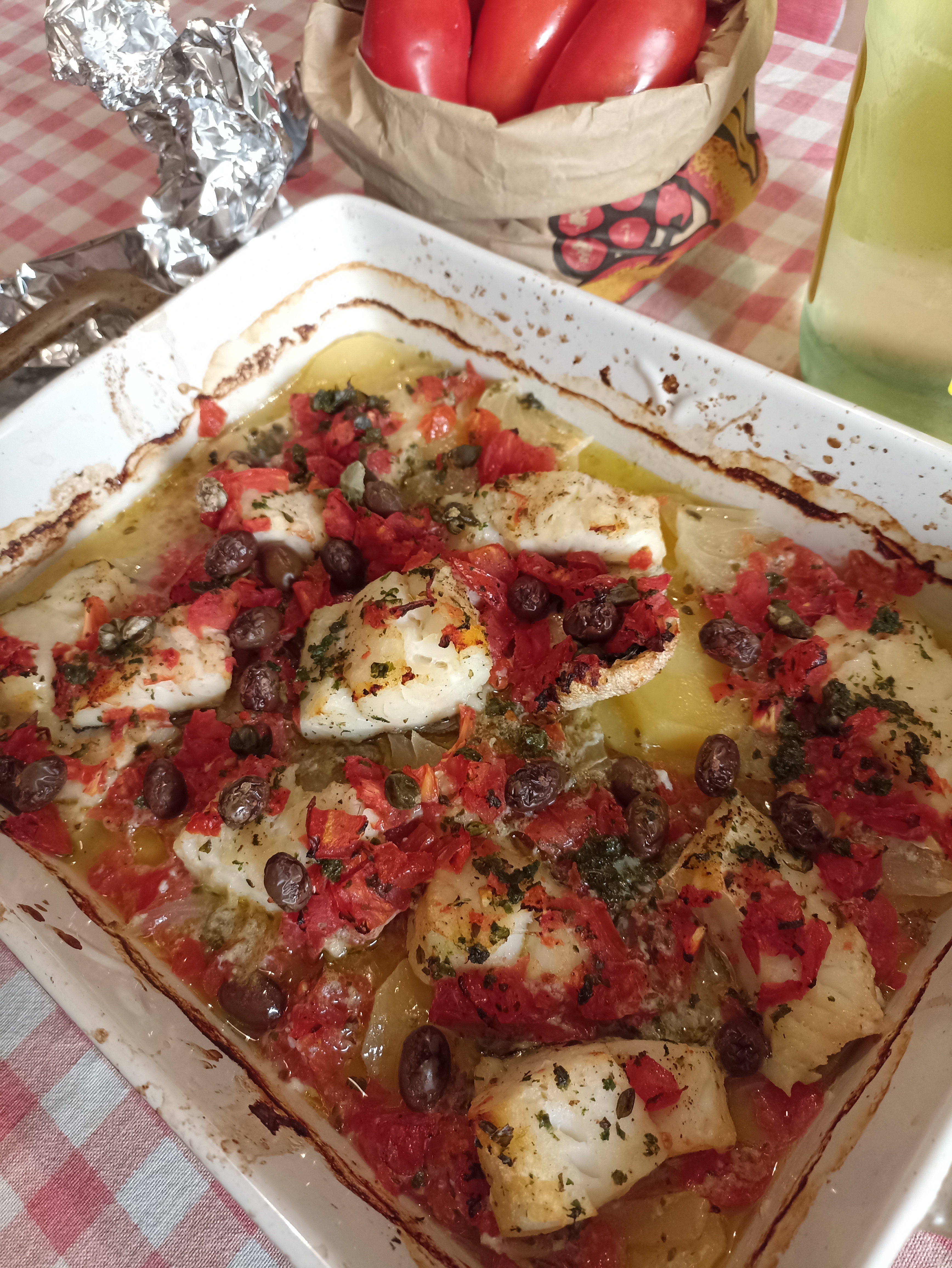 Mettete il baccalà sulle patate, i pomodori, le olive, i capperi, l’aglio e il prezzemolo tritati, una spolverata di origano e un pizzico di sale.