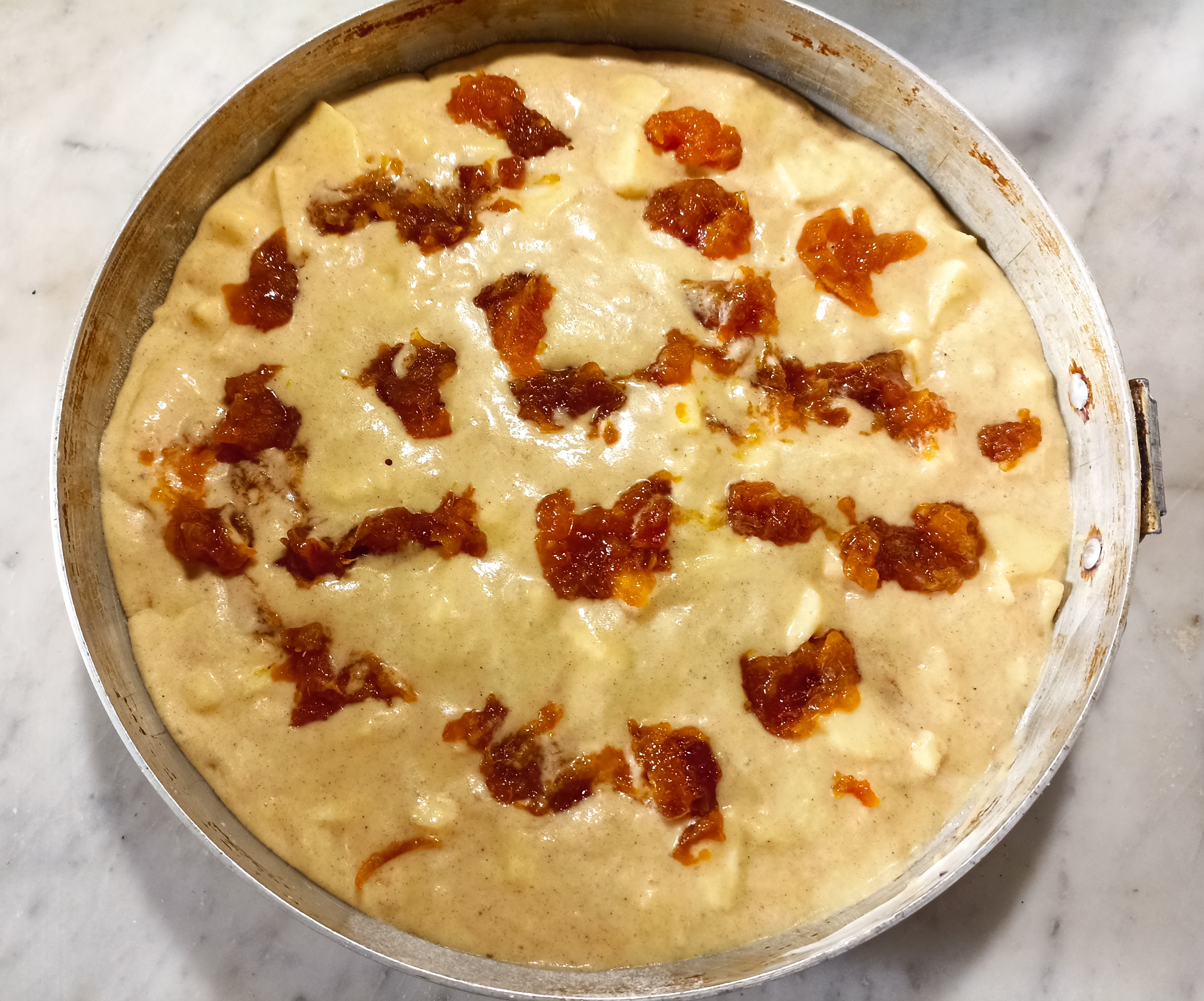 Aggiungete sulla superficie la marmellata a cucchiaiate e decorate con fettine sottili di mela.