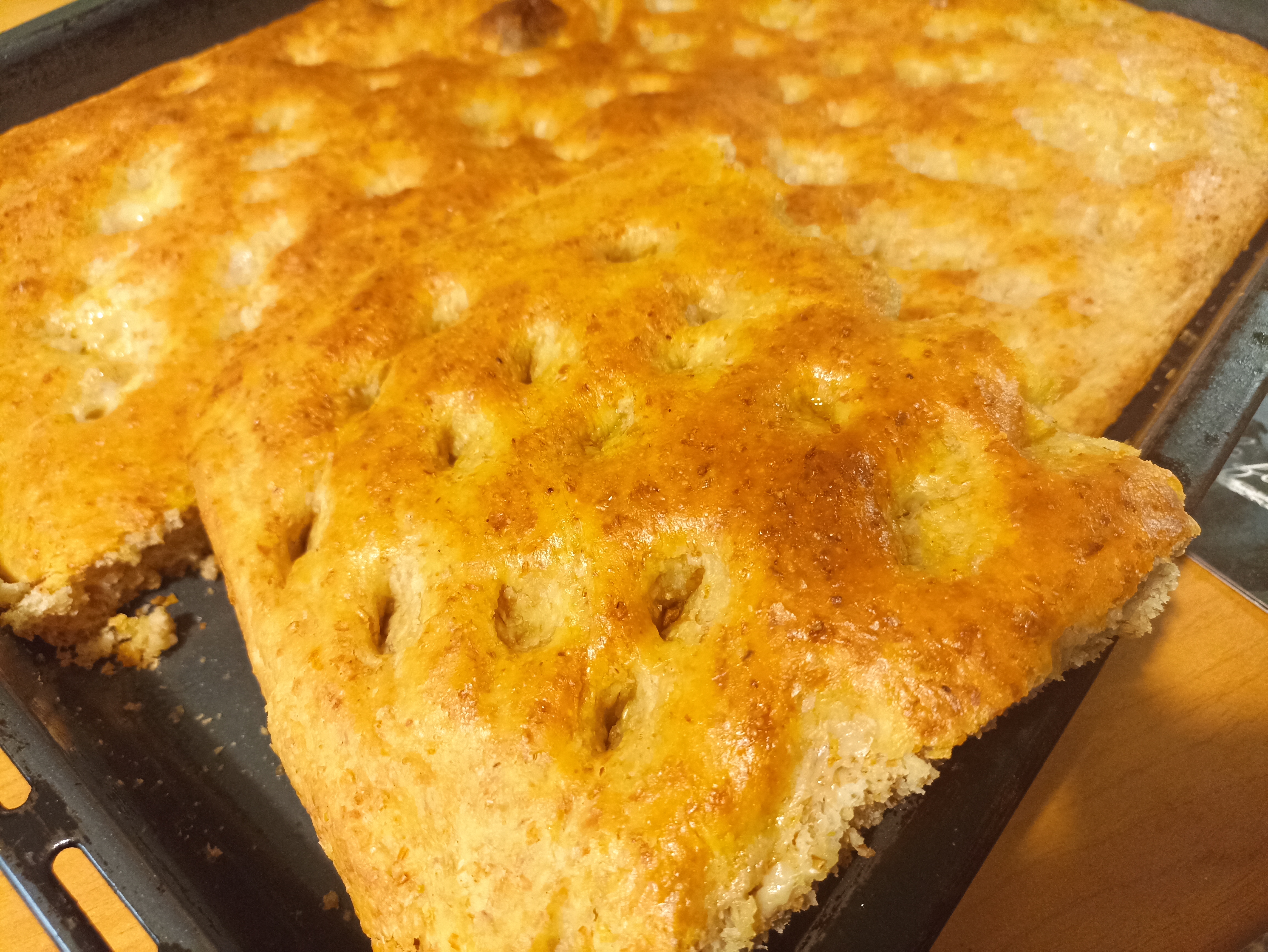 Sfornate la focaccia quando è ben dorata e spennellate la superficie con olio extravergine d’oliva.