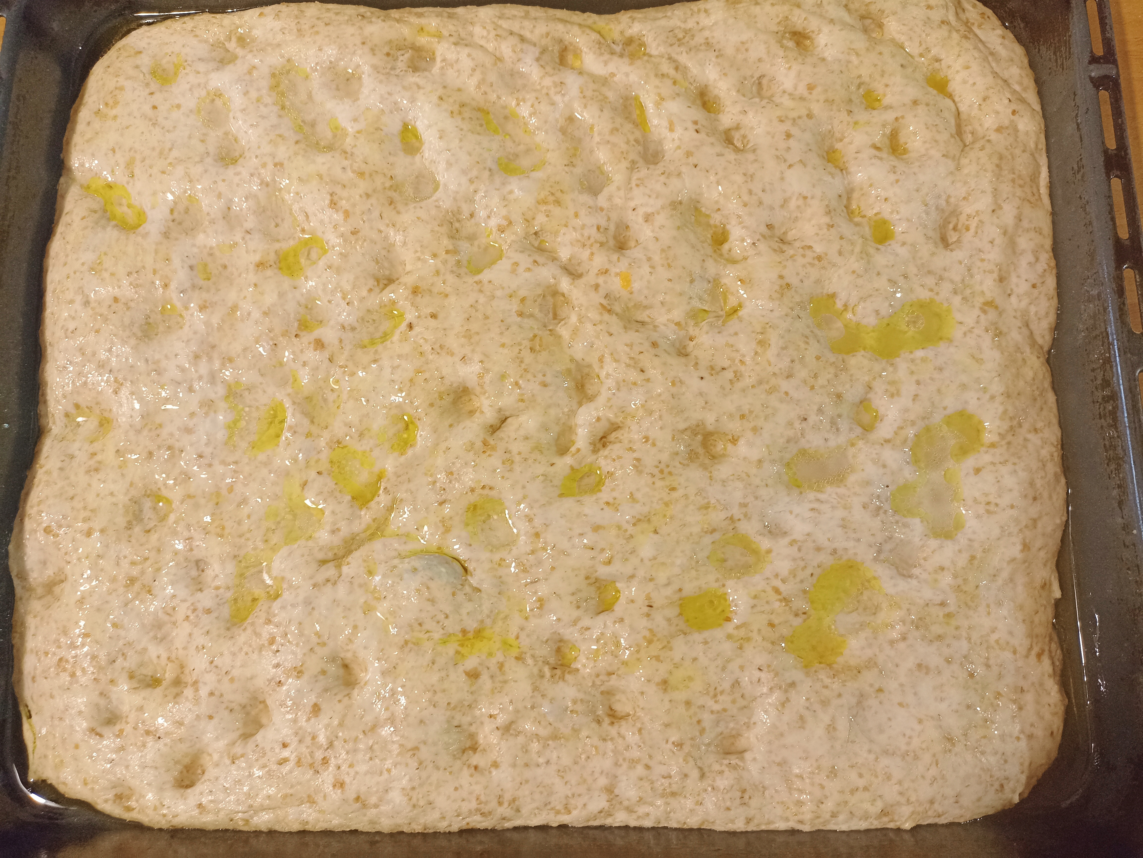 Trascorso il tempo di lievitazione trasferite l’impasto in una teglia rettangolare ben oleata, stendetelo con le mani fino a coprire tutta la superficie.