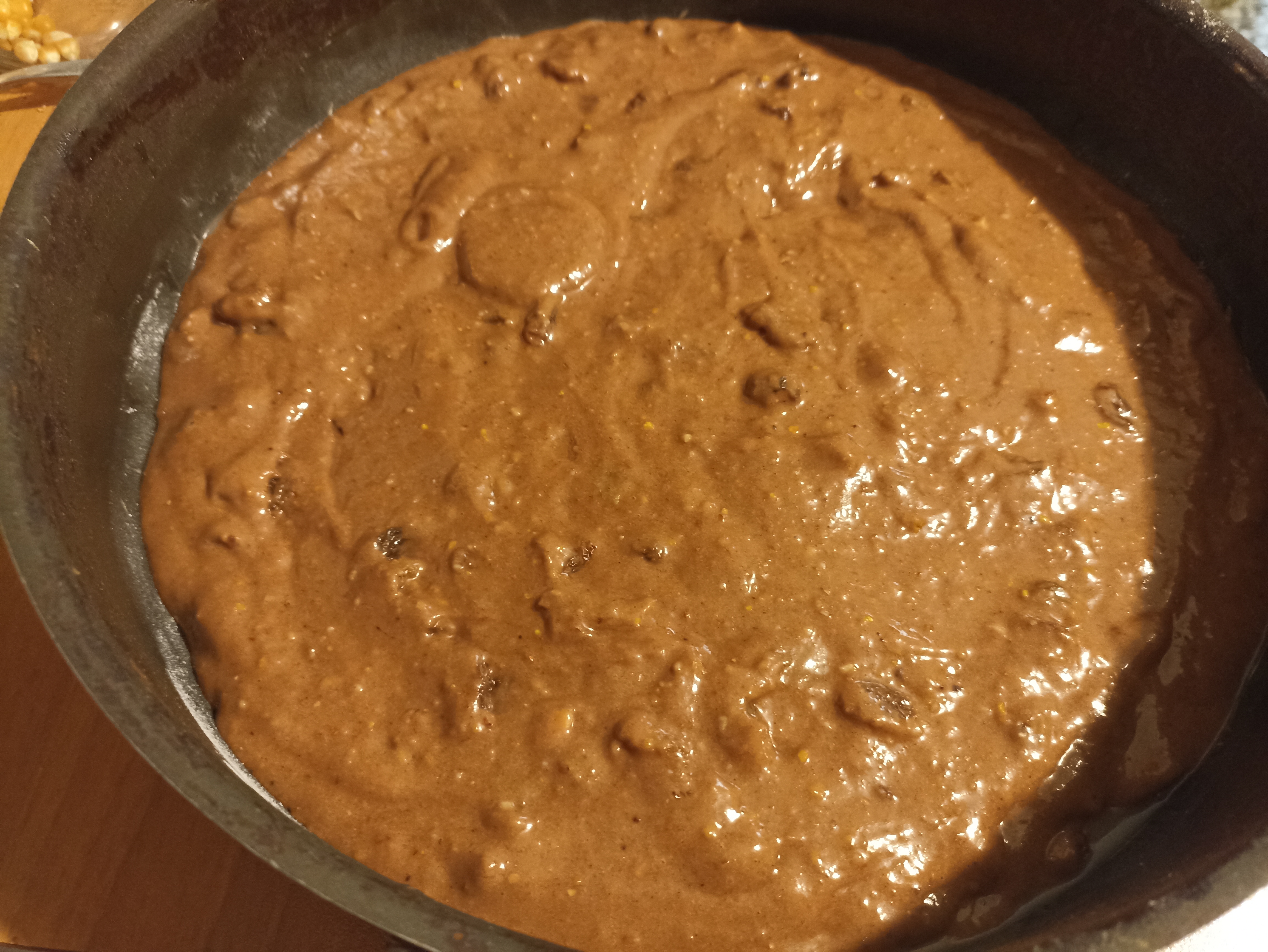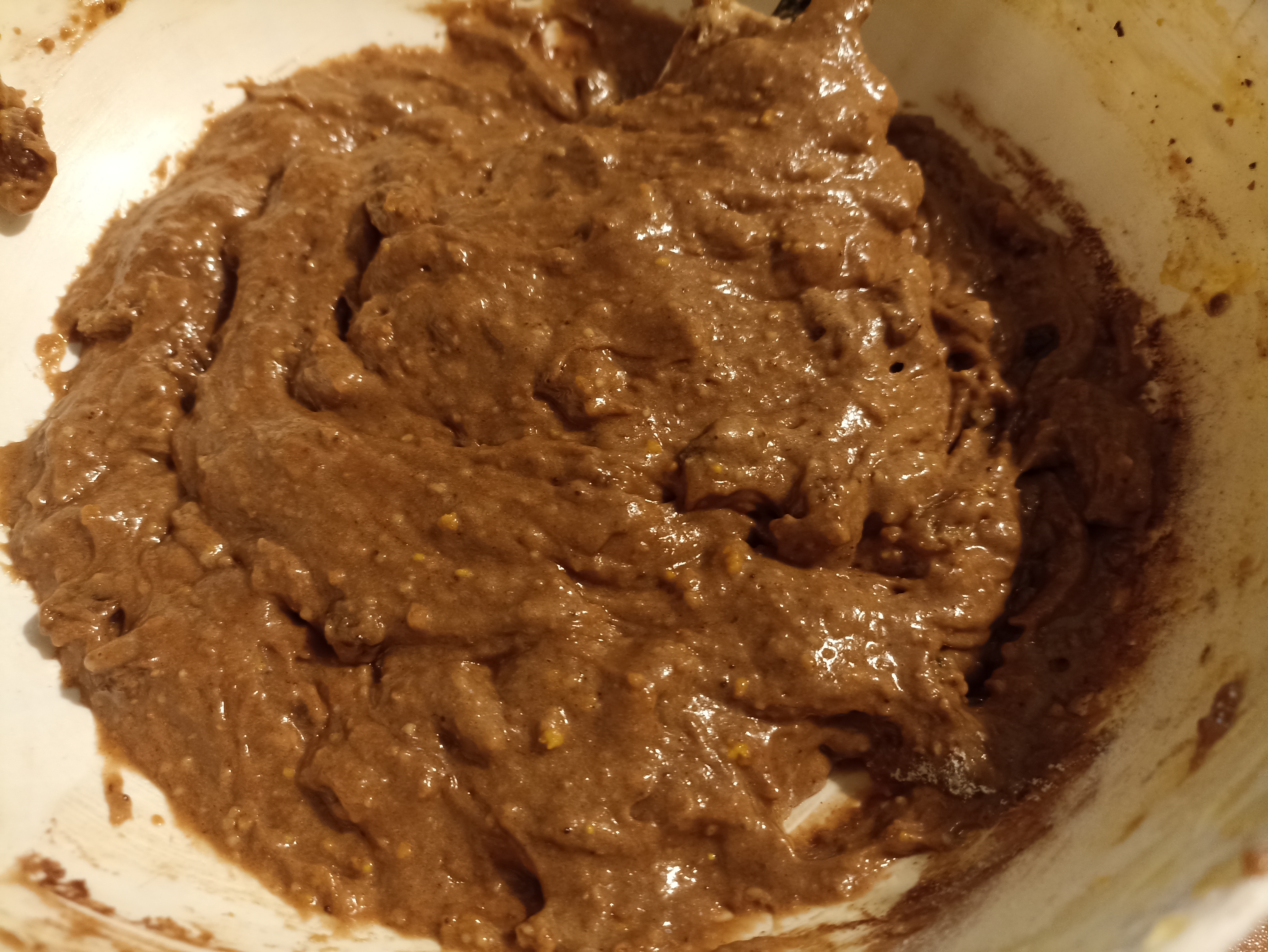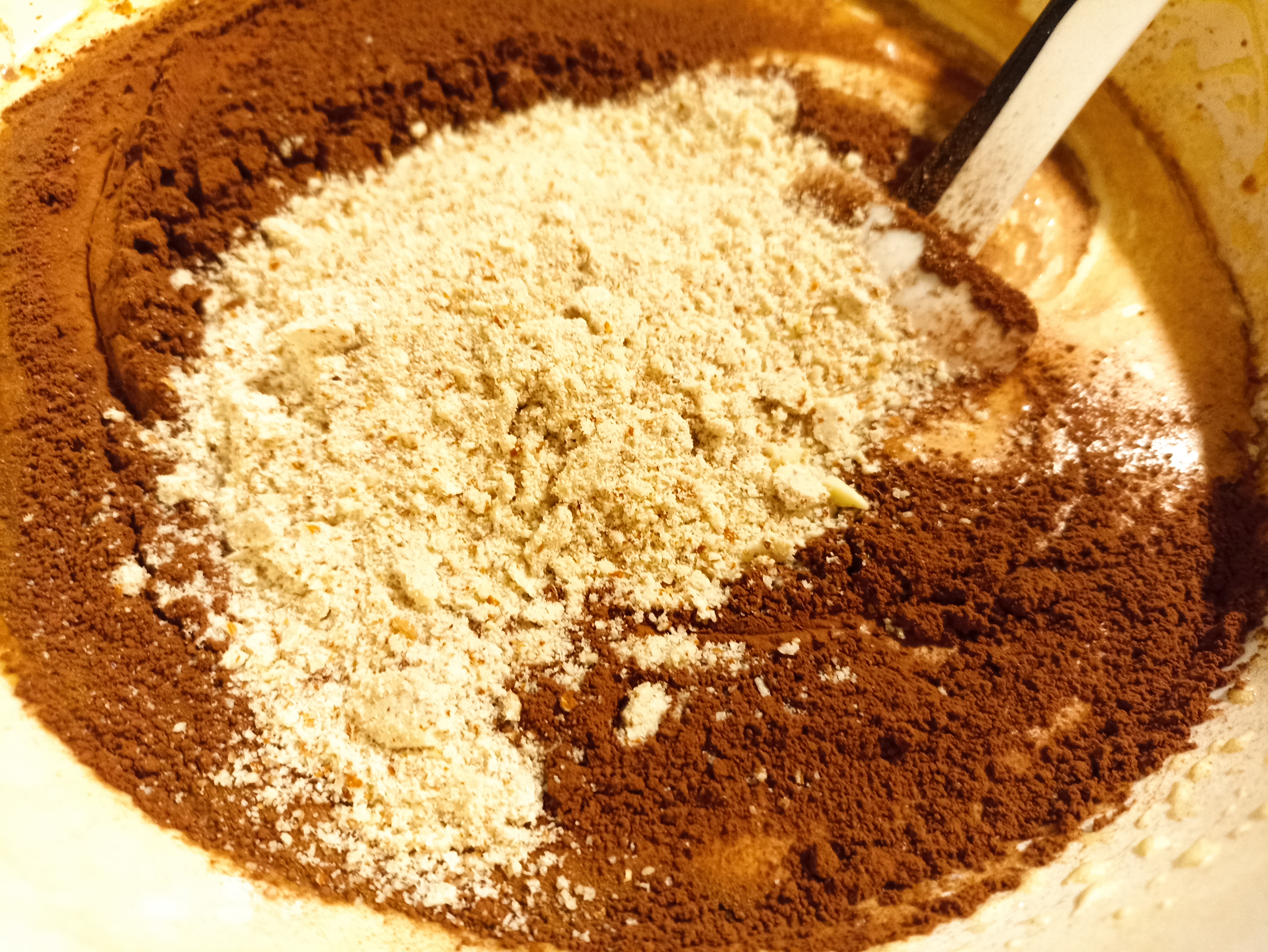Aggiungete l’olio a filo, le mandorle tritate, il cacao, la cannella, il mix di spezie, il marsala, l’acqua, un pizzico di sale, la farina setacciata con il lievito e mescolate con una spatola.