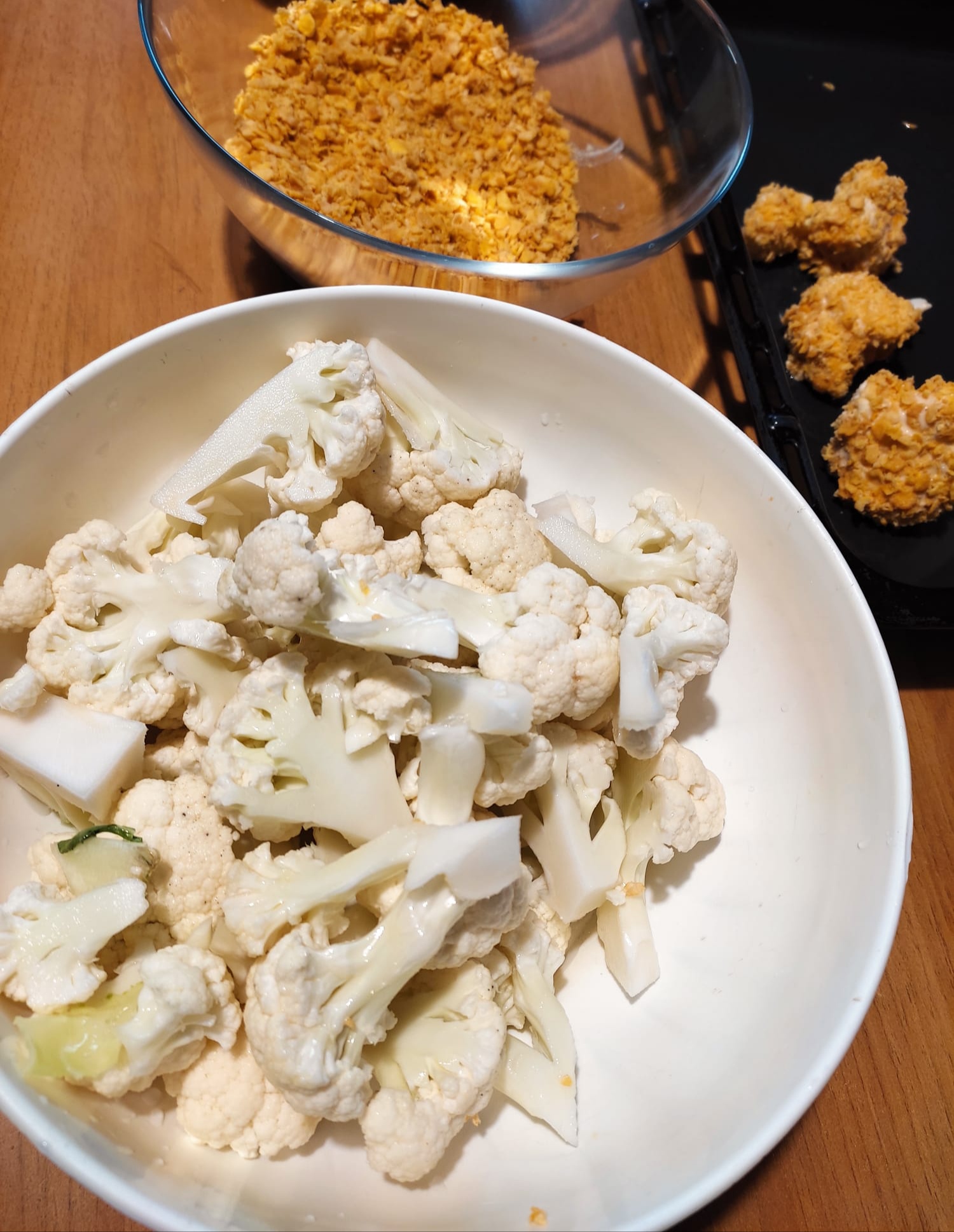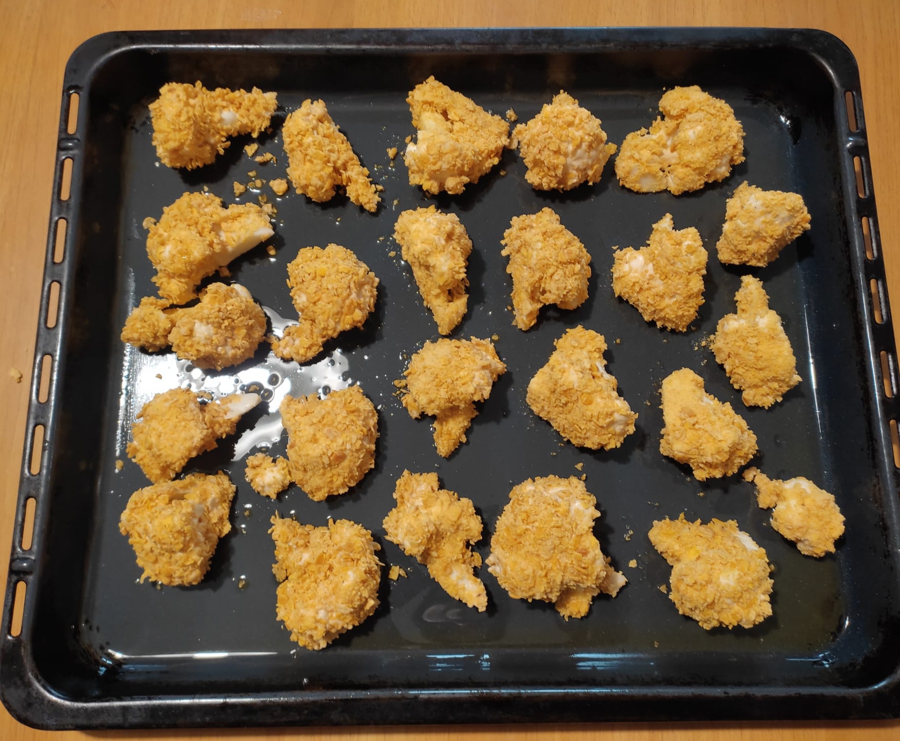 Passate ciascuna cimetta di cavolfiore prima nella pastella e poi nei cereali sbriciolati.