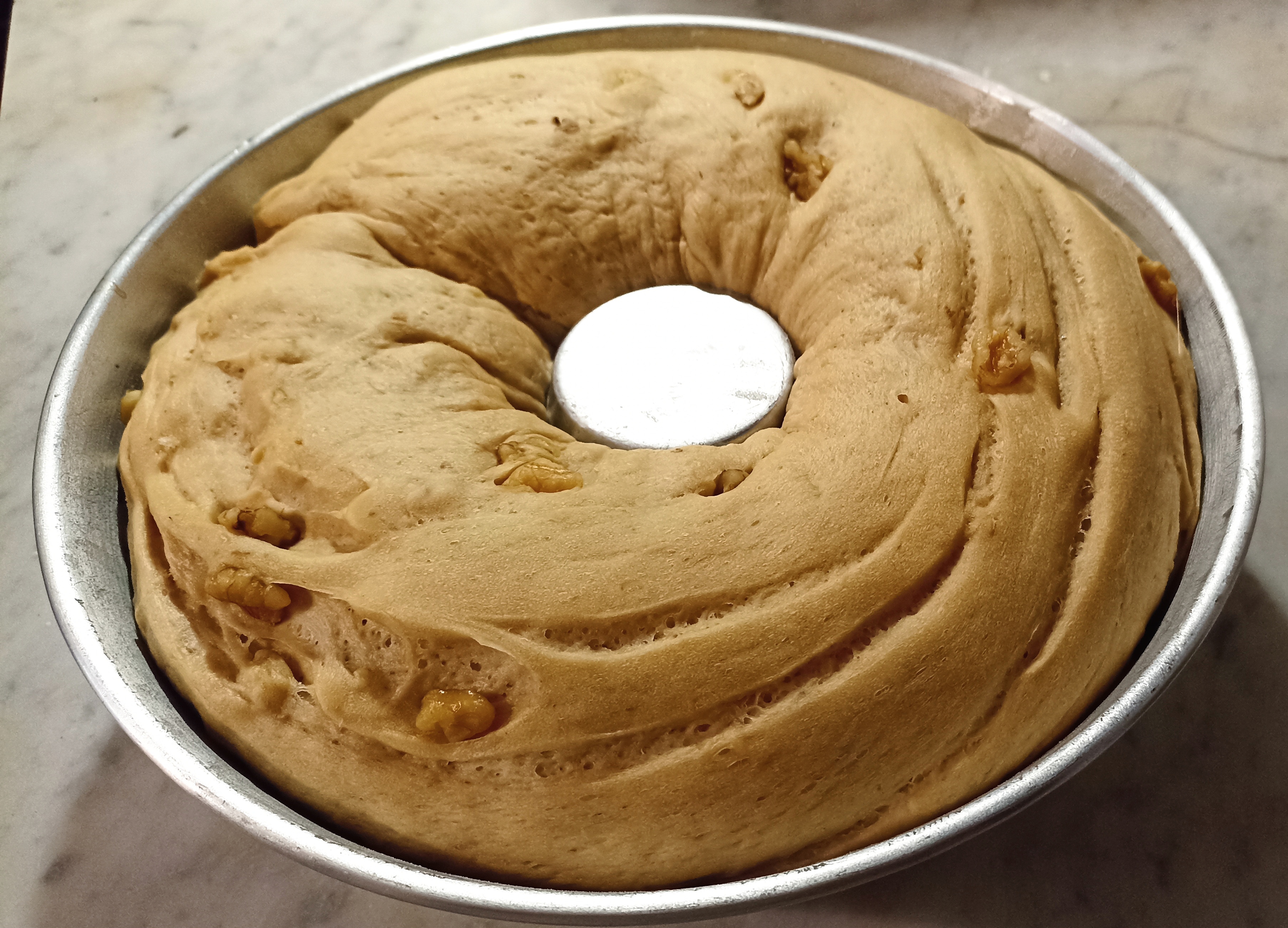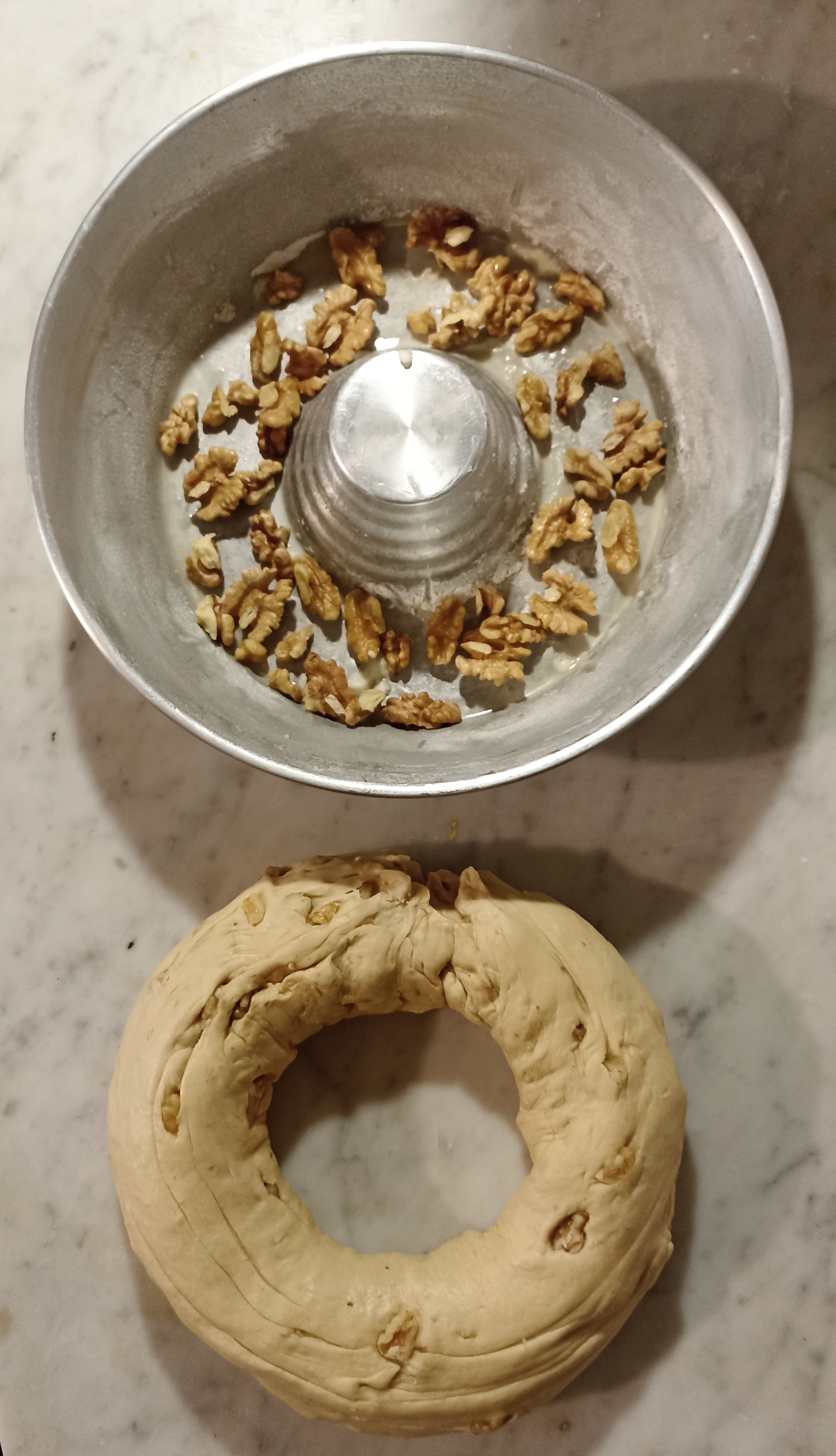 Trascorso il tempo di lievitazione trasferite l’impasto su un piano da lavoro formate un salsicciotto, unite le estremità e formate la ciambella ponetela nello stampo da 26 cm di diametro precedentemente oleato, infarinato e con le noci rimaste sulla base dello stampo