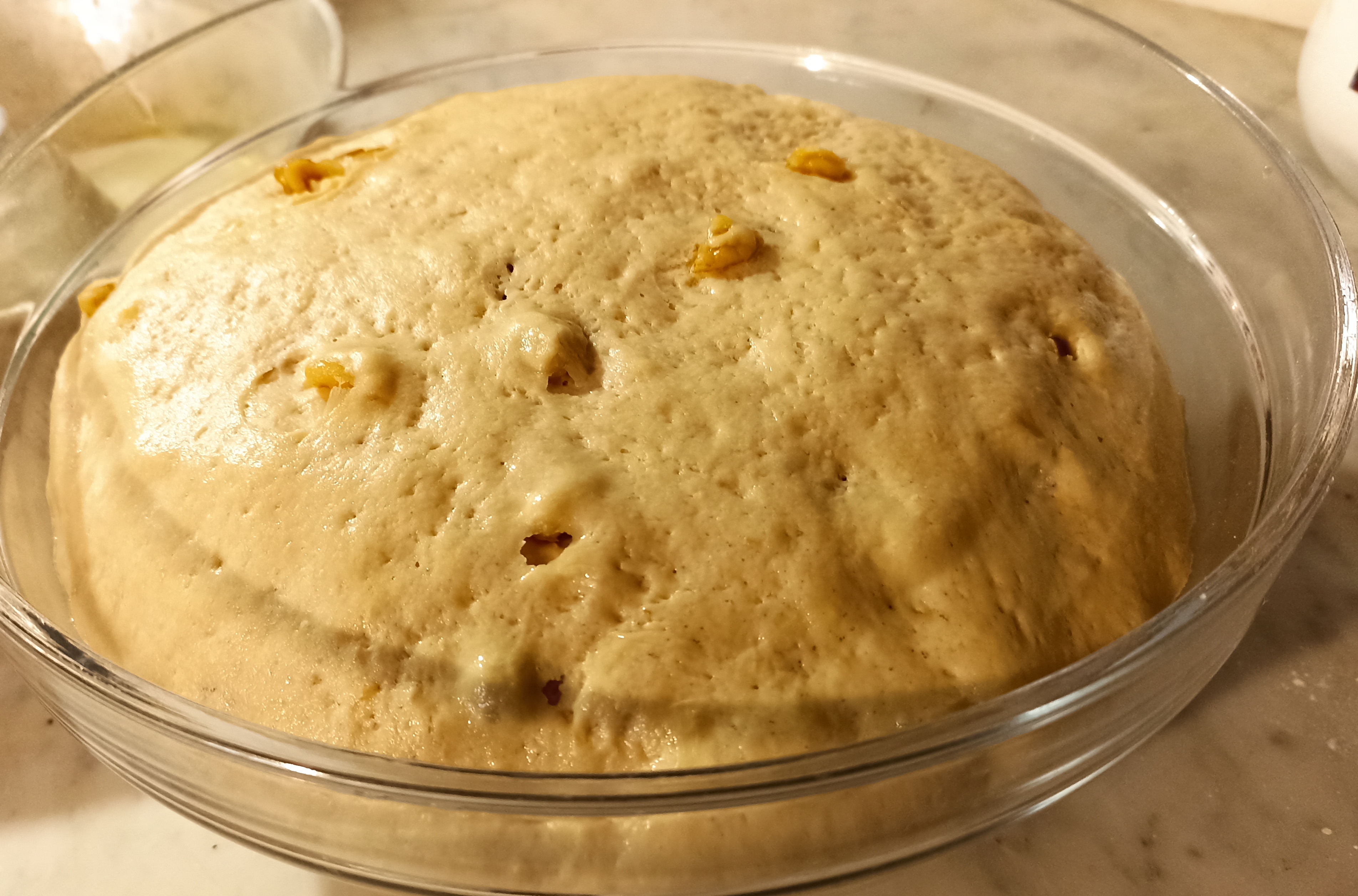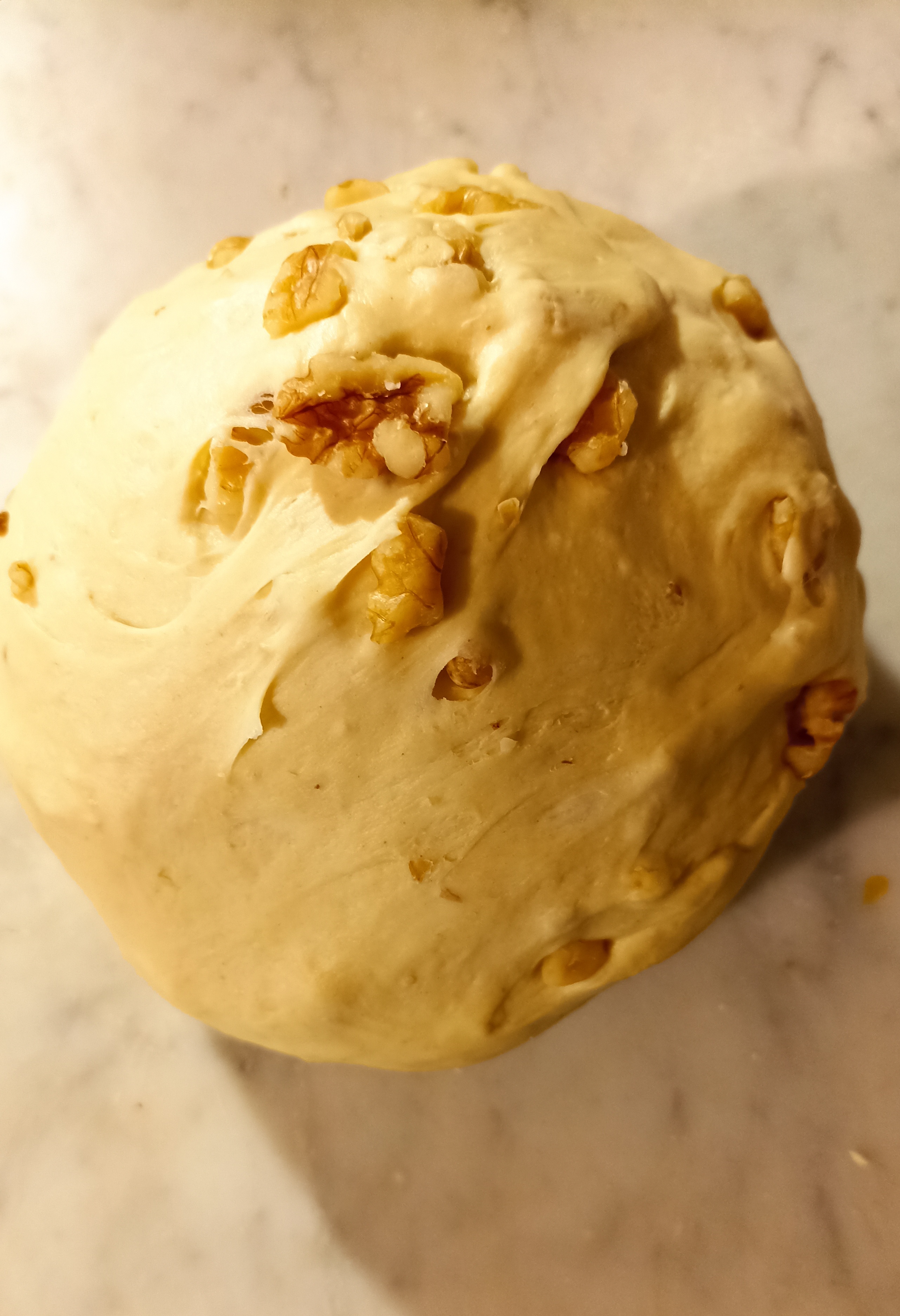 l’acqua tiepida, lo zucchero, mescolate e incorporate tutta la farina. Unite quindi il burro fuso, il sale, le noci (spezzettate grossolanamente) e iniziate a impastare.